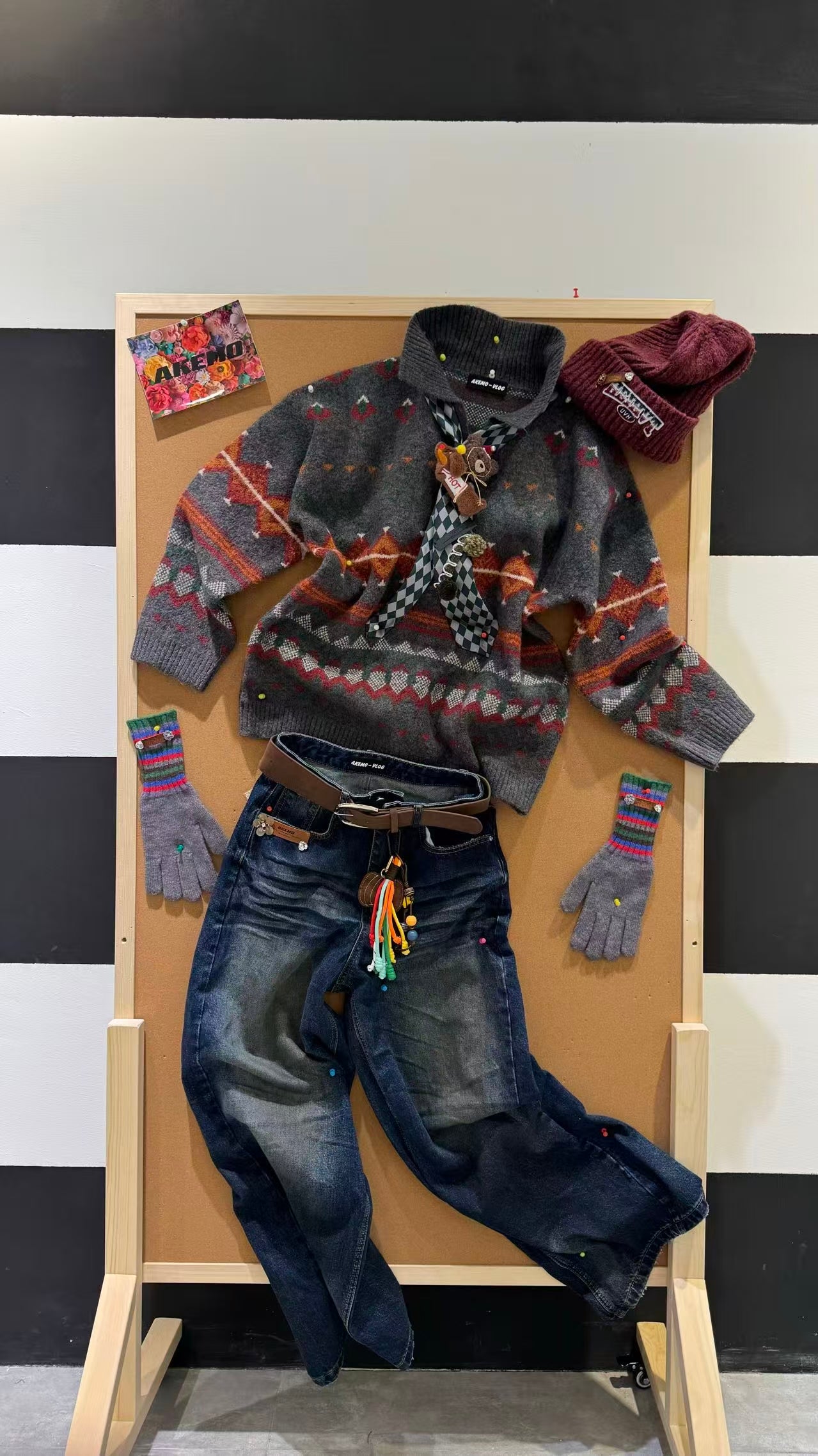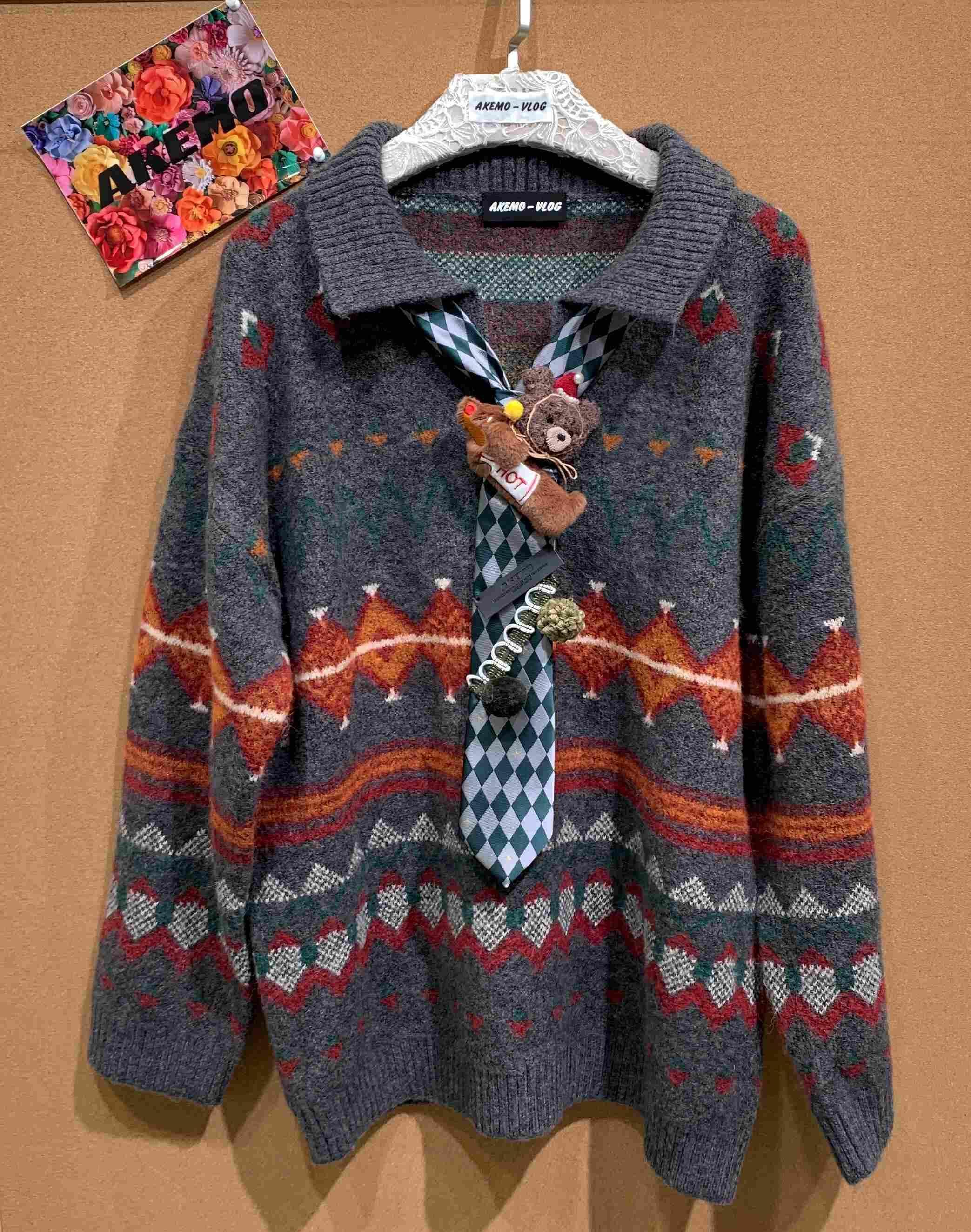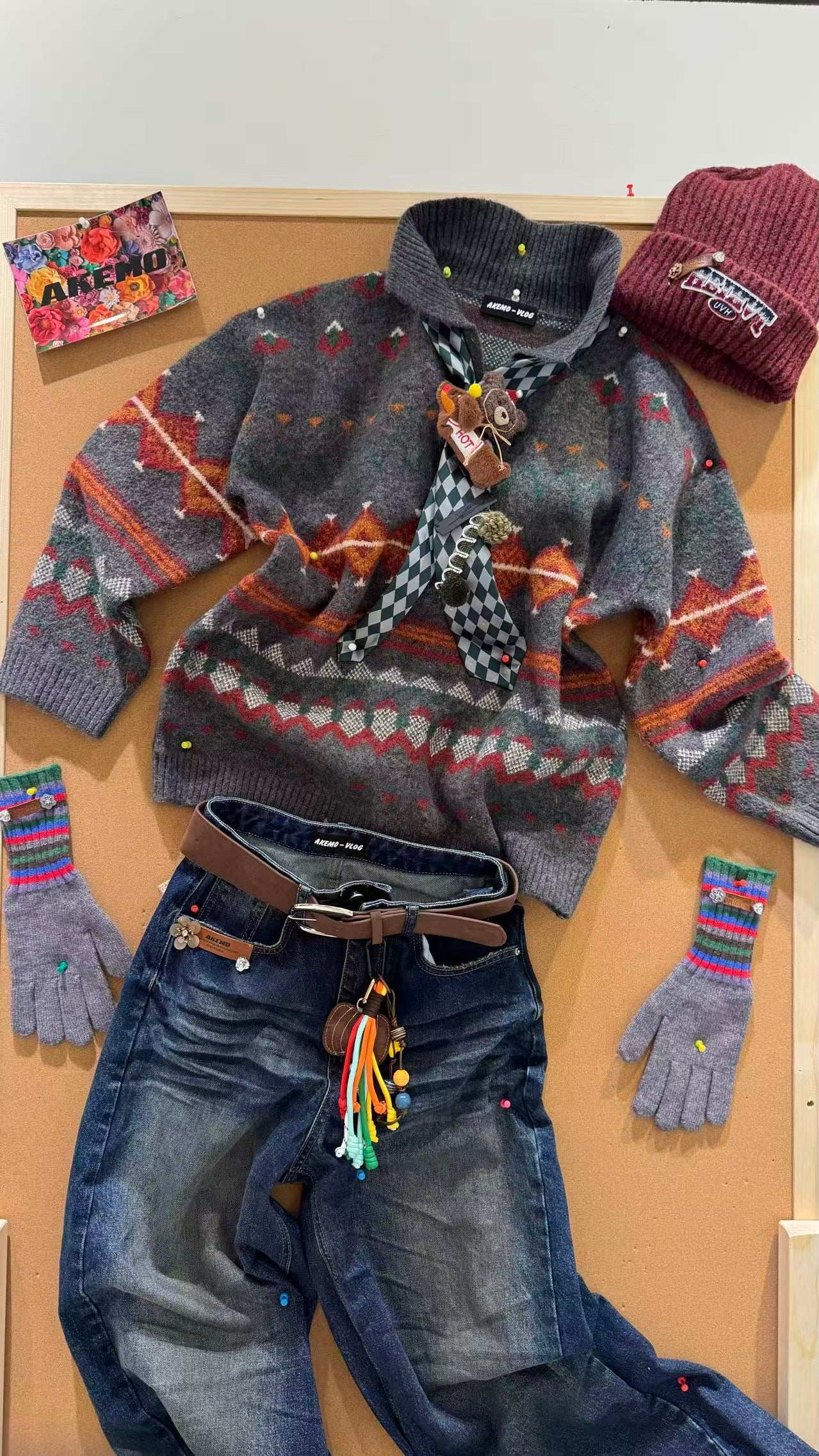 AKEMO Plush Toy Sweater(GREY) + Retro Preppyl Jeans