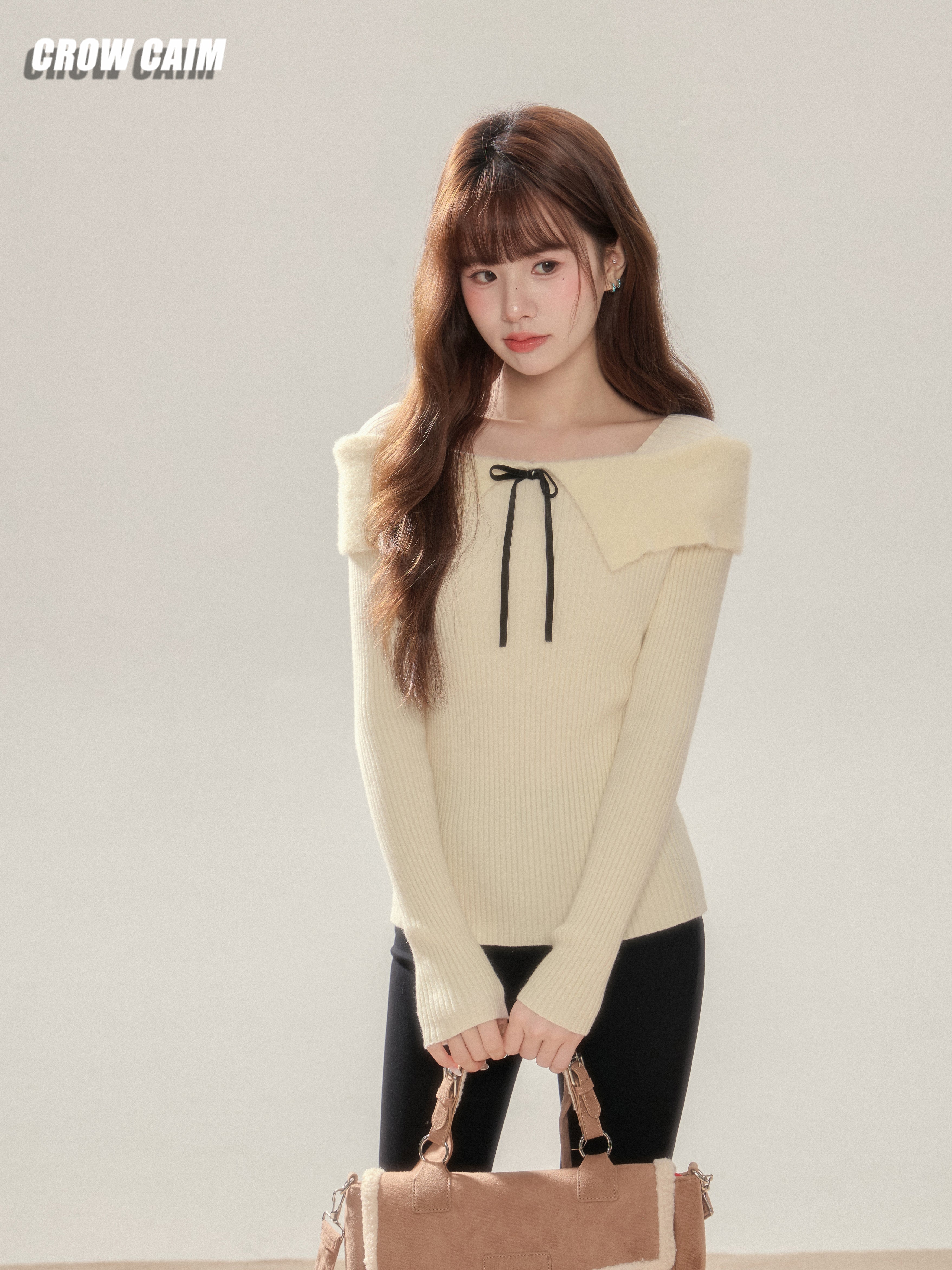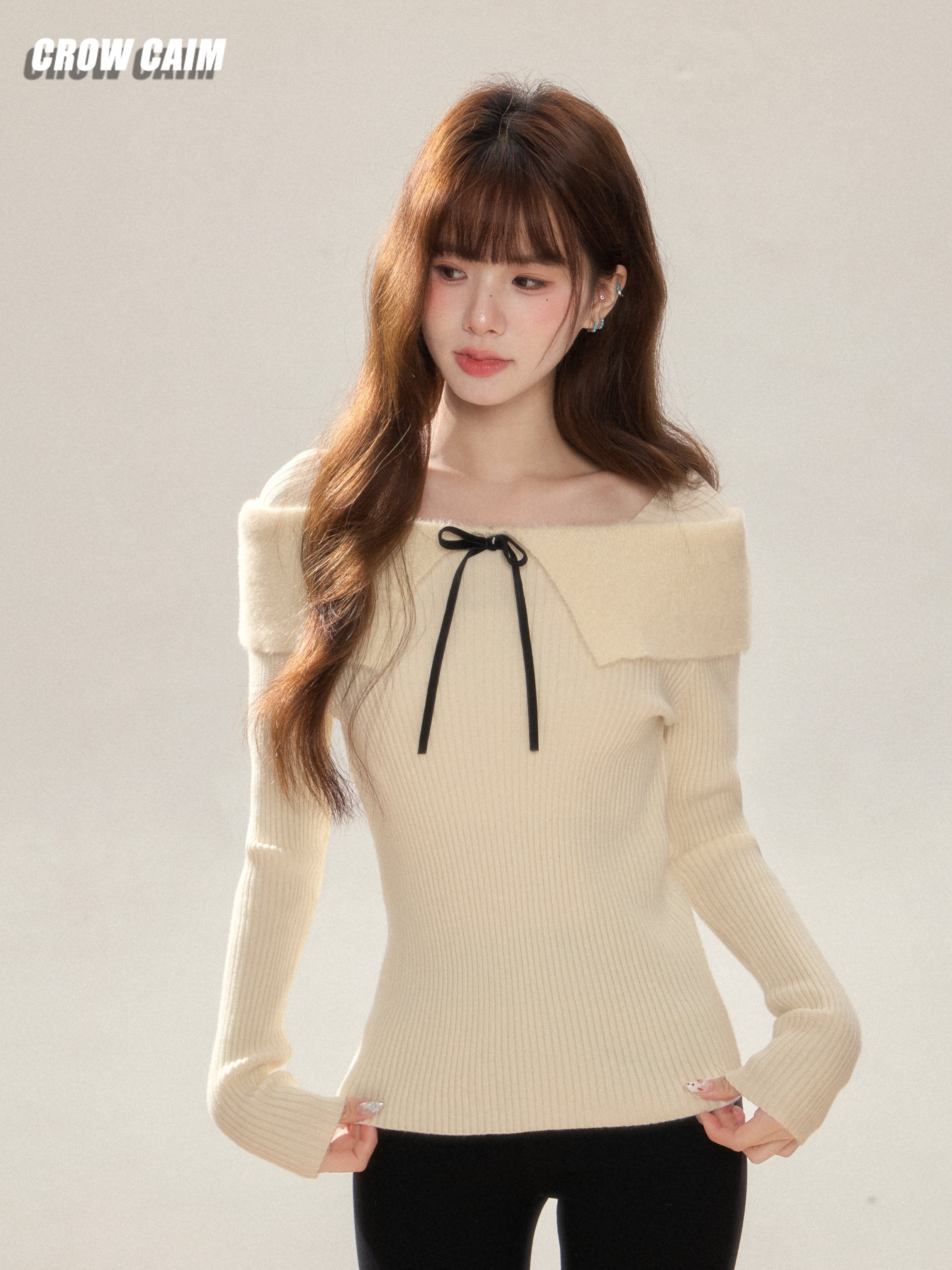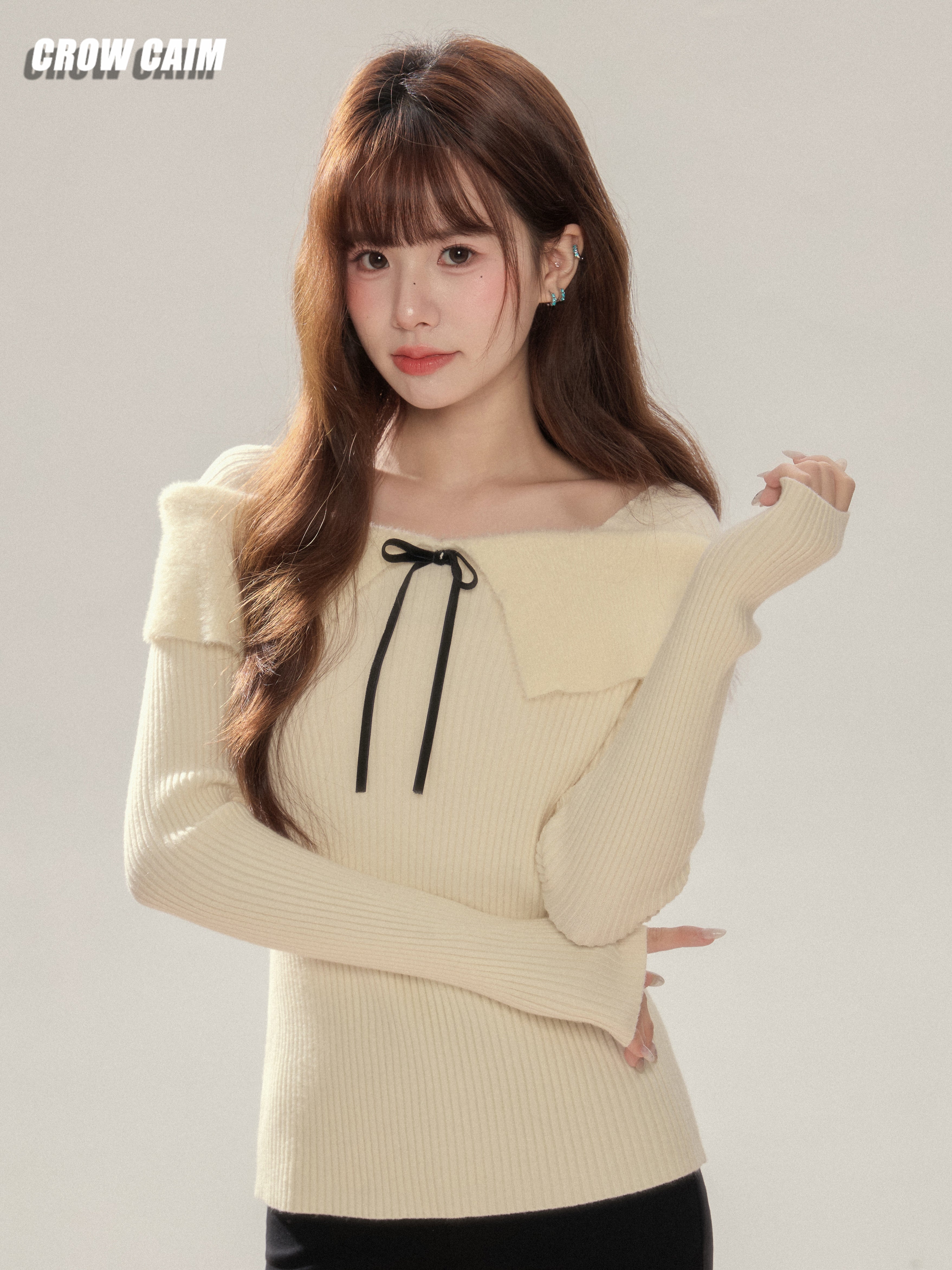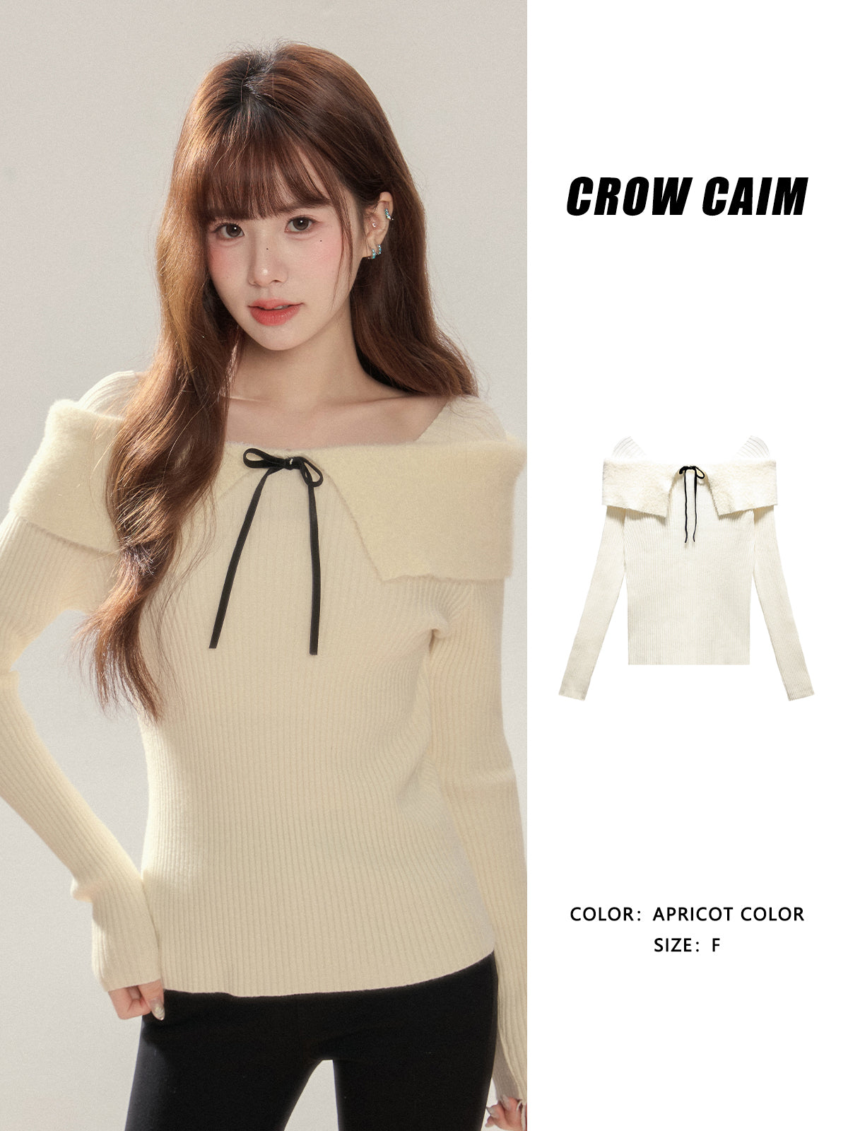 CROWCAIM Bow Collar Off-Shoulder Knit Top