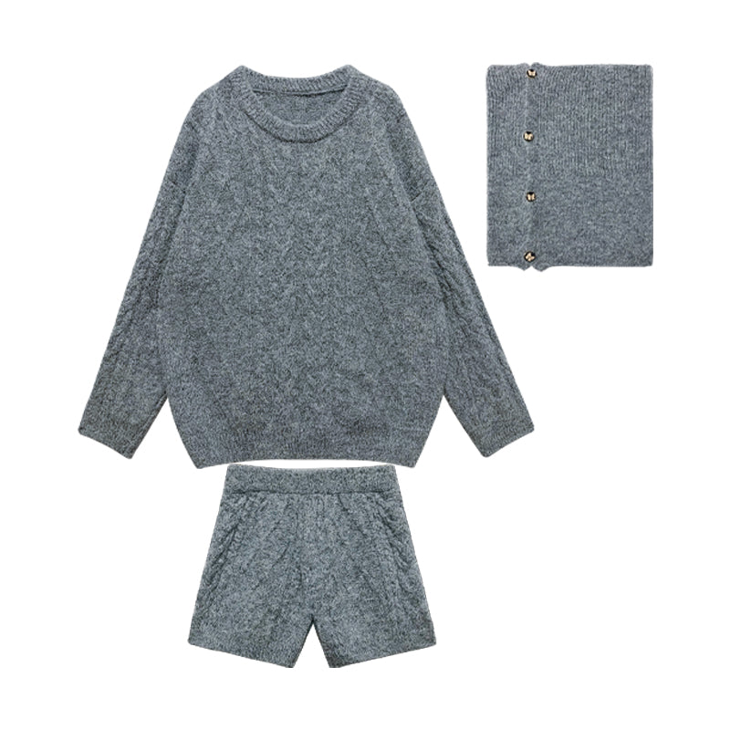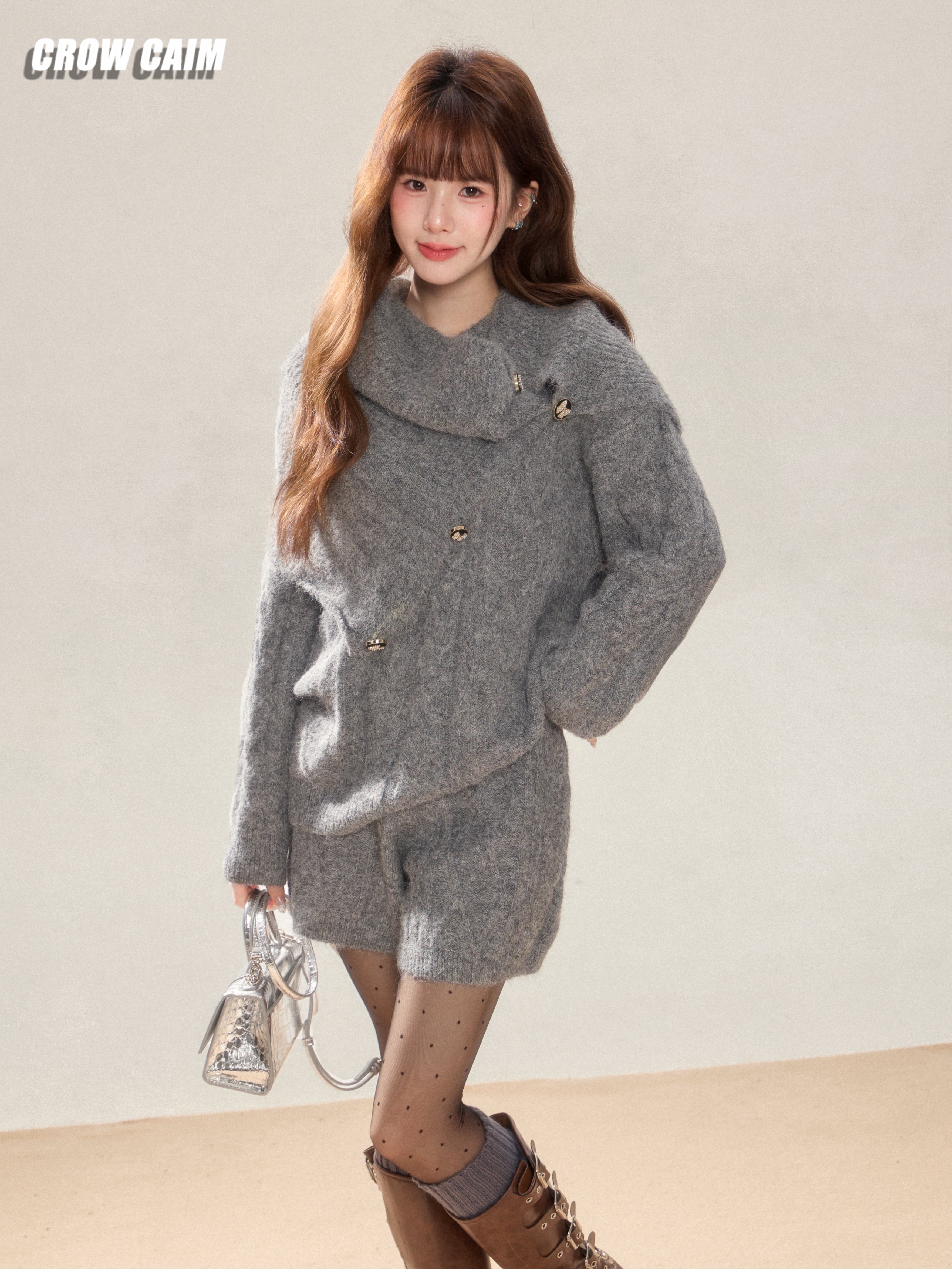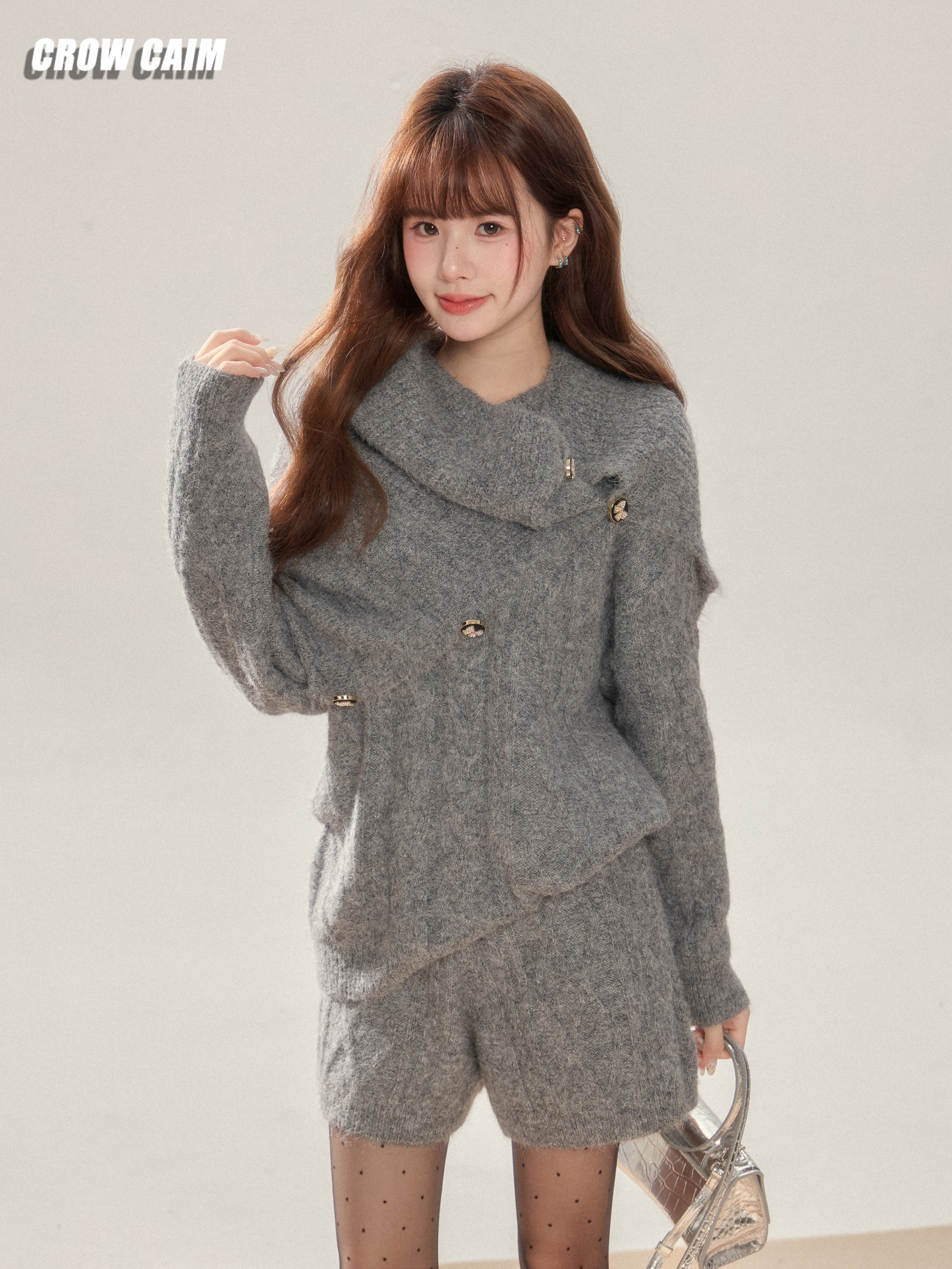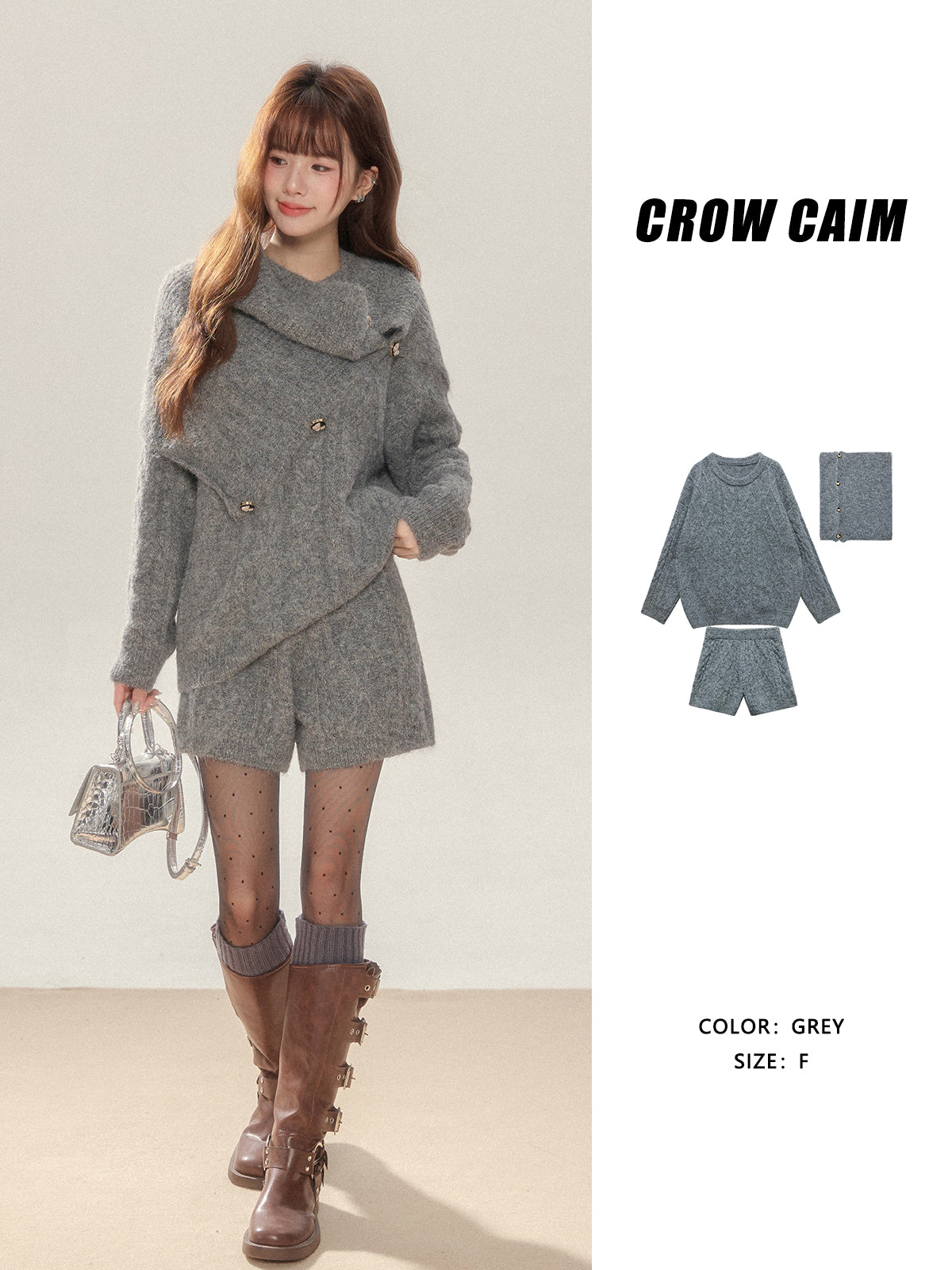 CROWCAIM Cable Knit Sweater, Shorts & Scarf Three-Piece Set