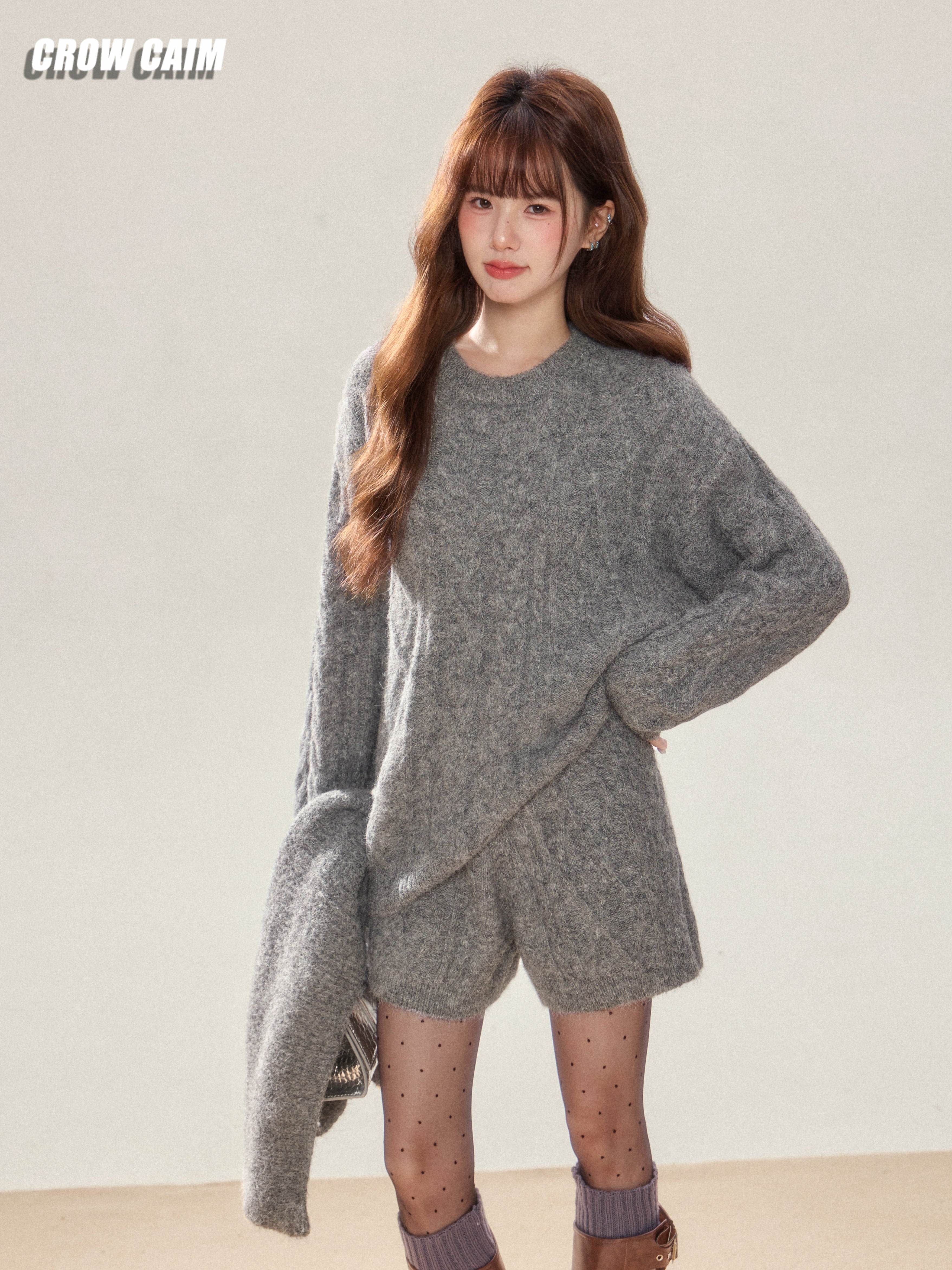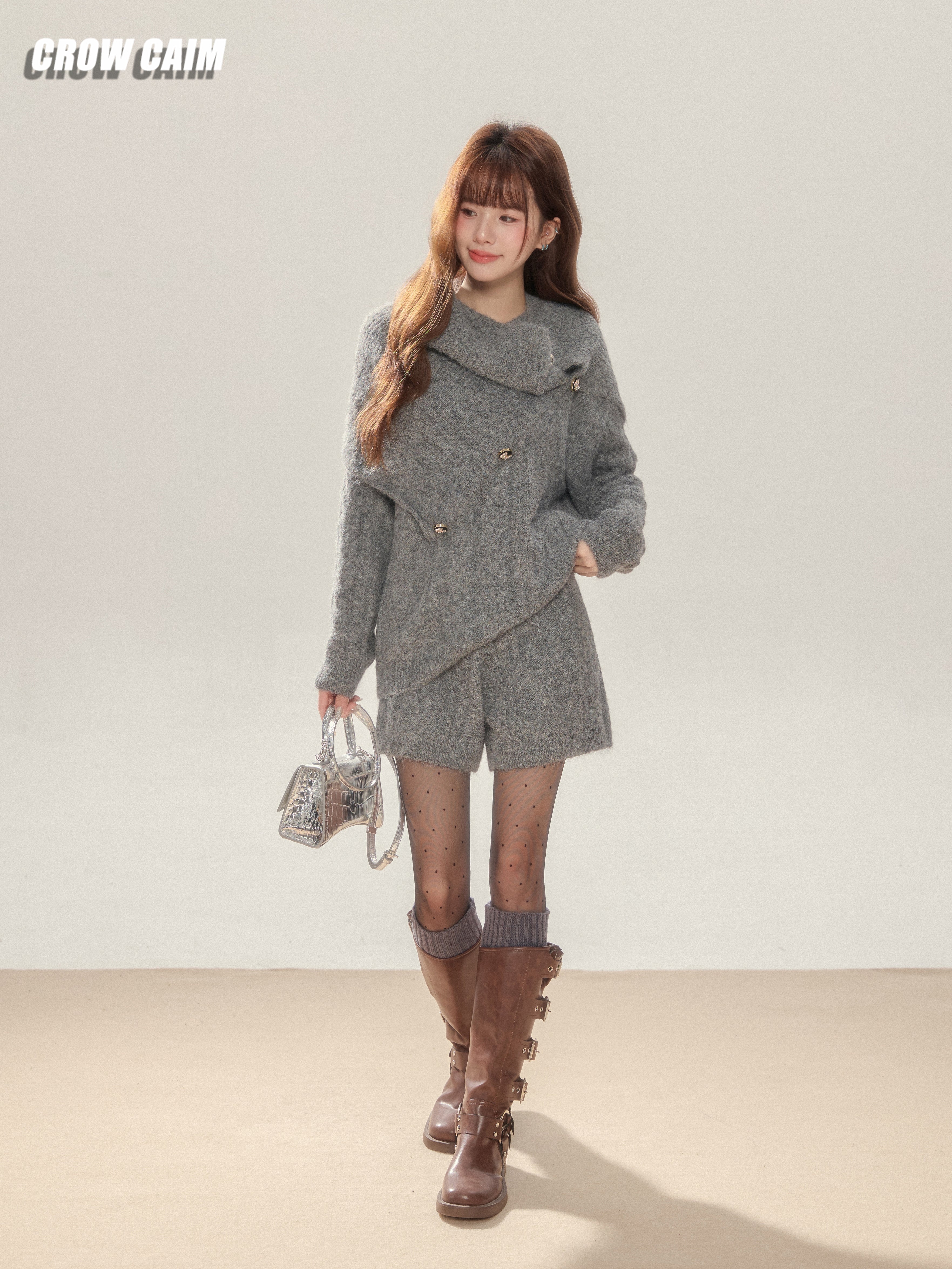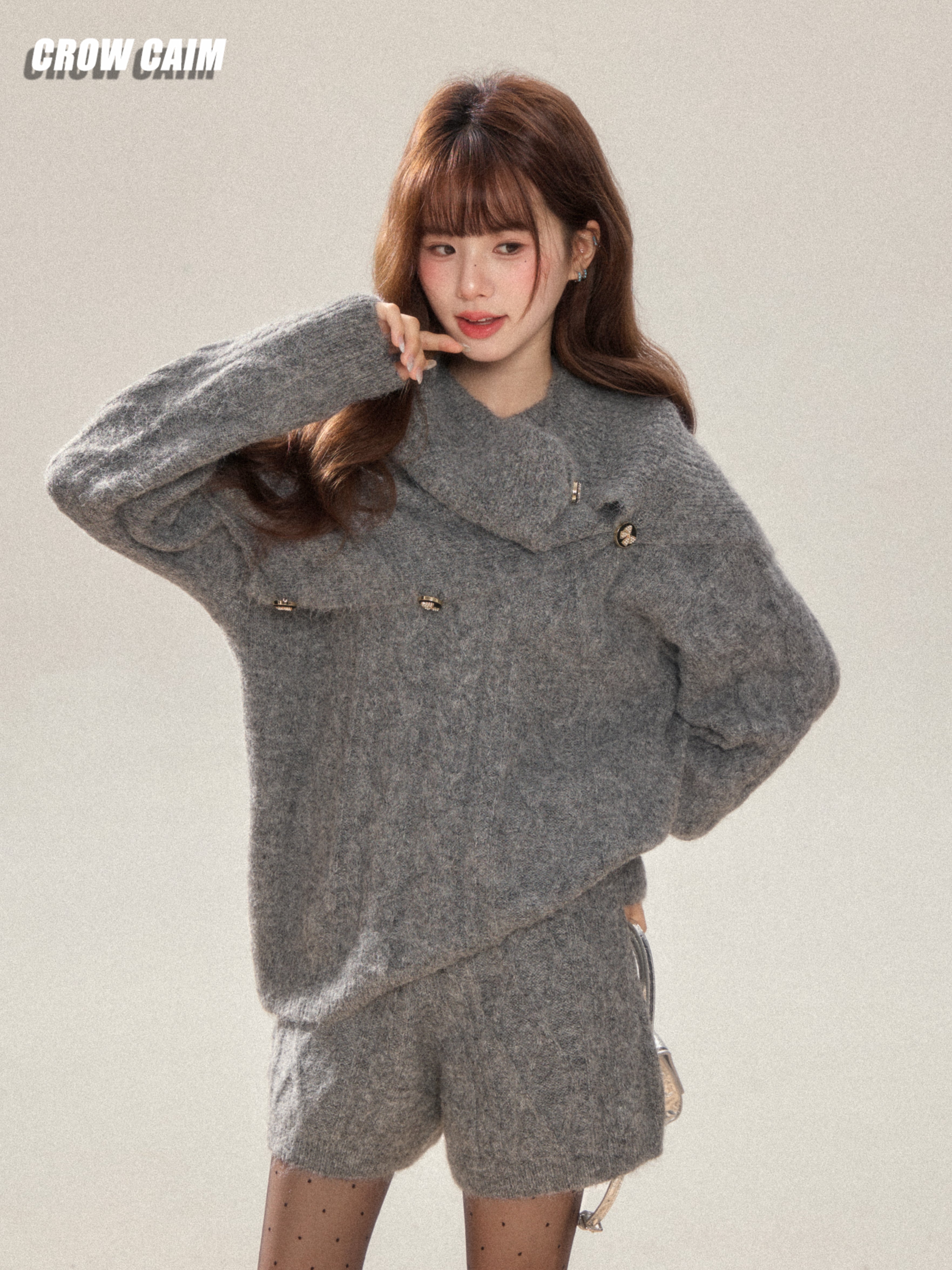 CROWCAIM Cable Knit Sweater, Shorts & Scarf Three-Piece Set
