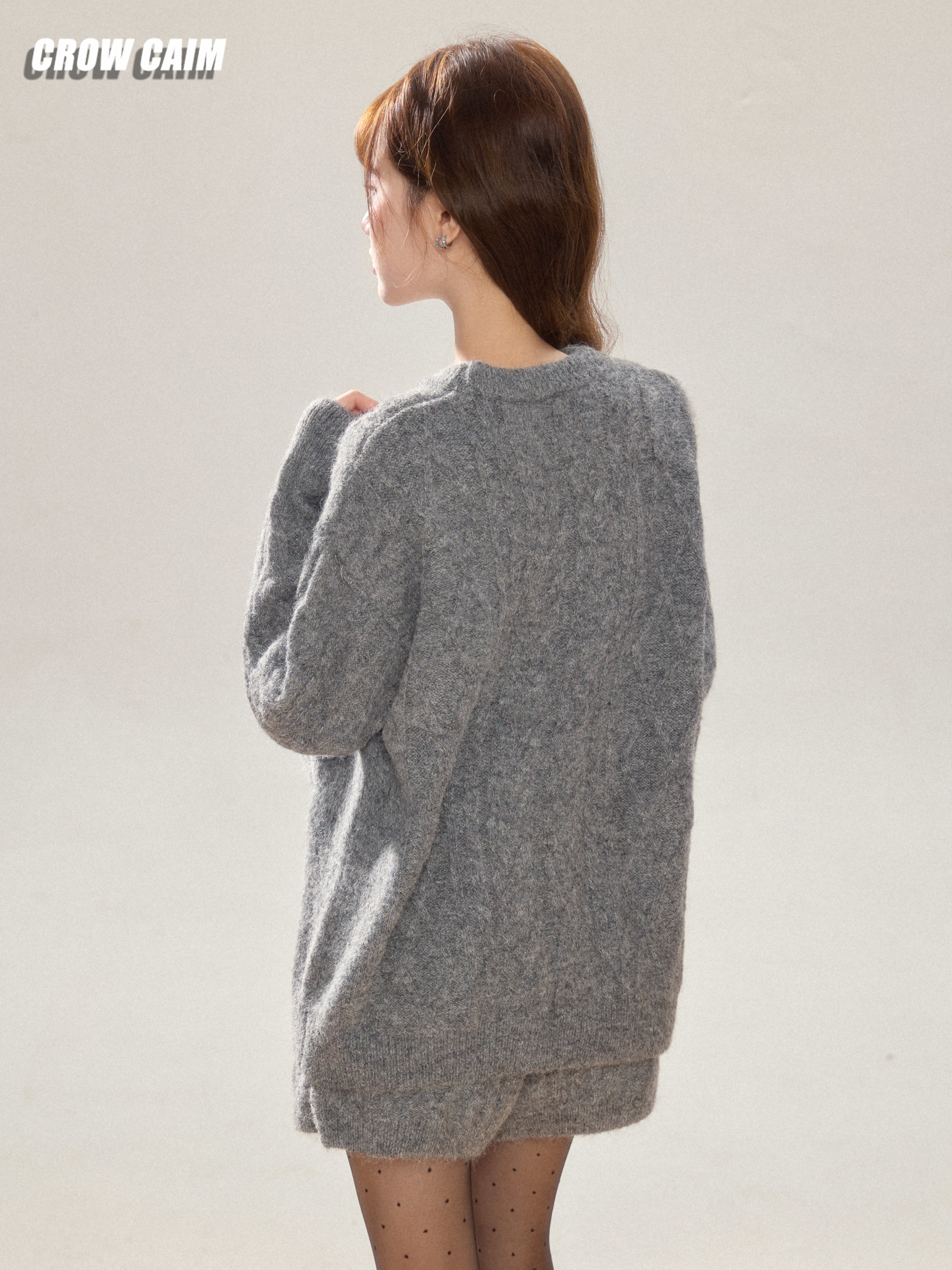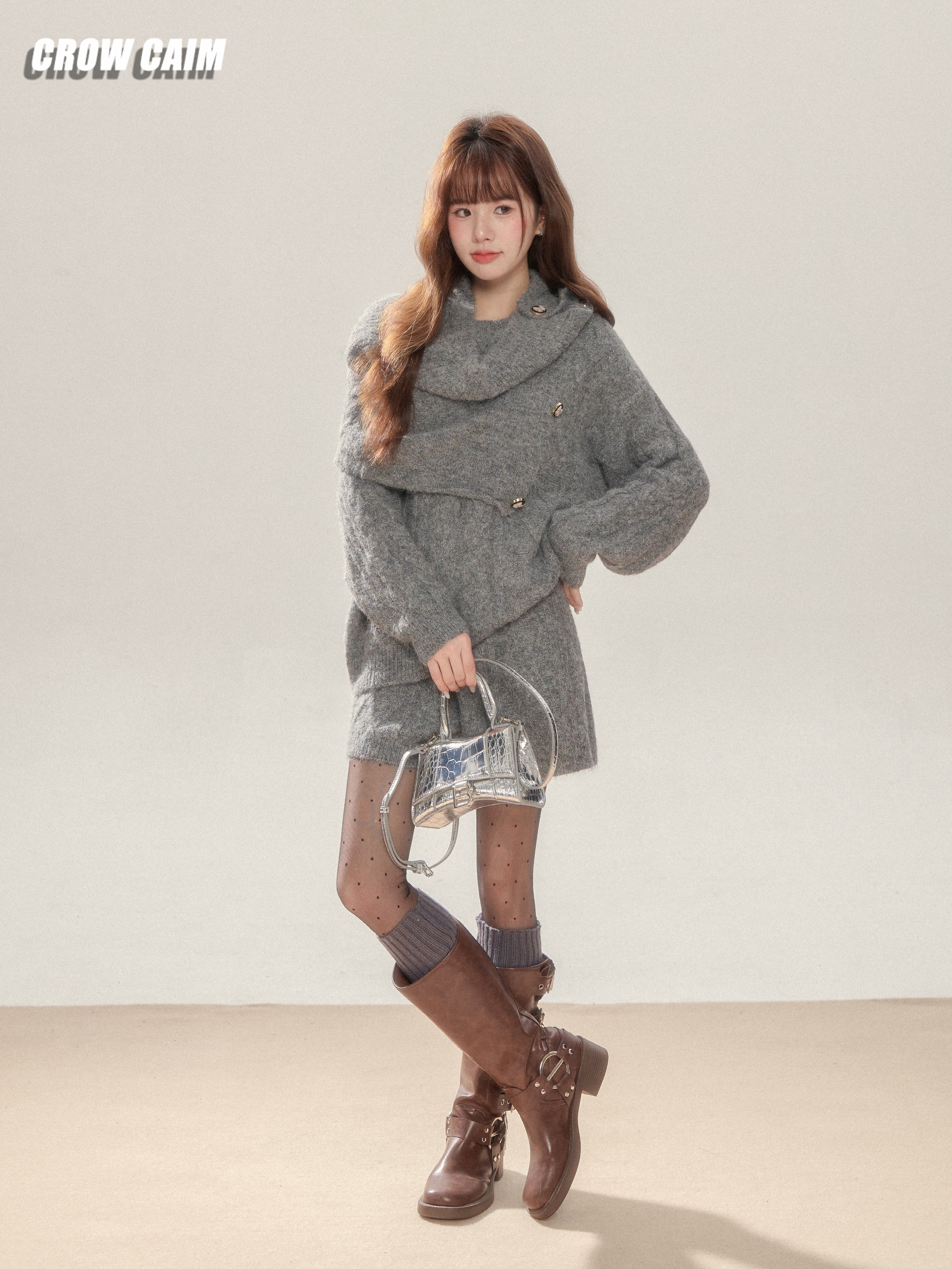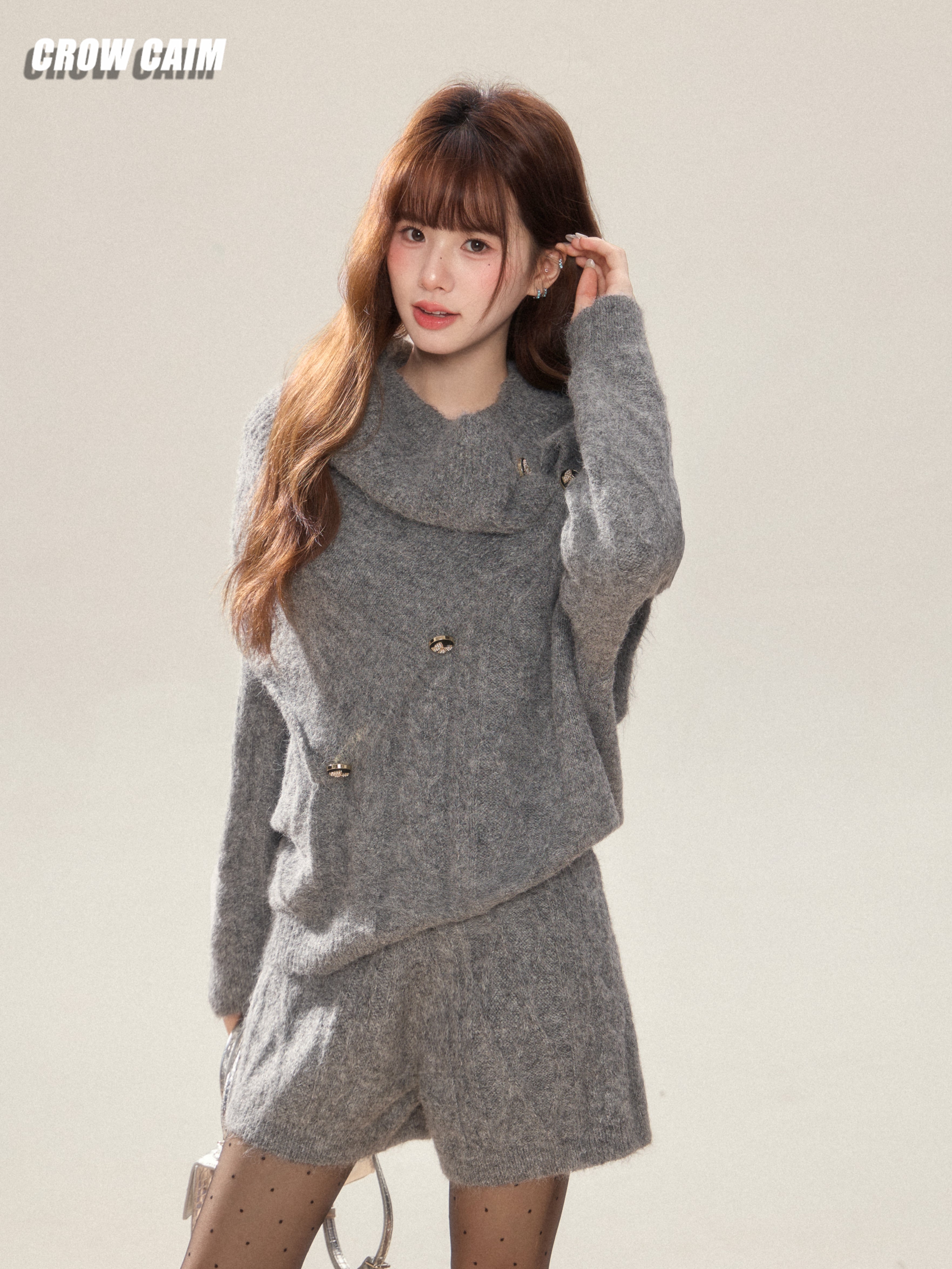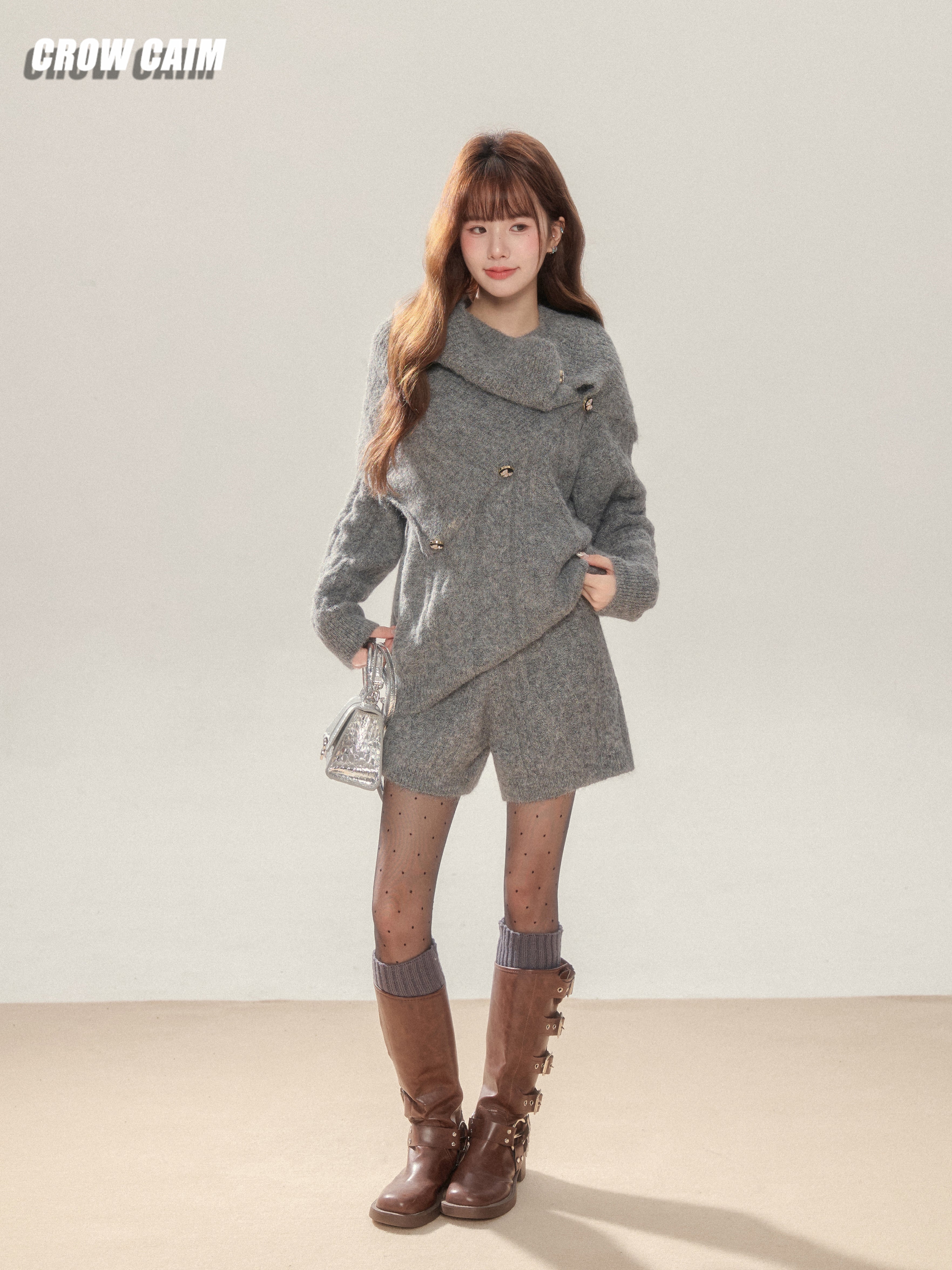 CROWCAIM Cable Knit Sweater, Shorts & Scarf Three-Piece Set