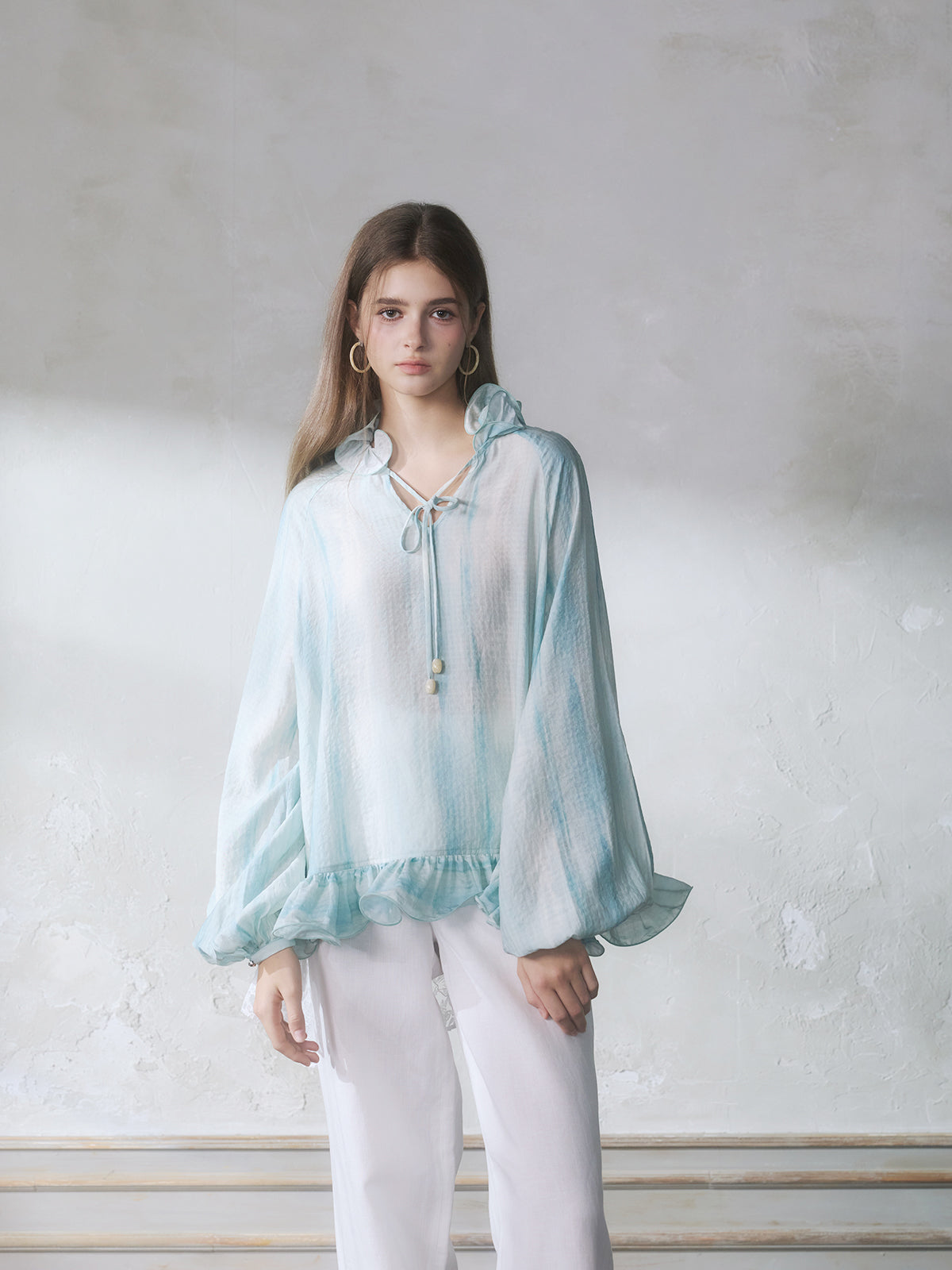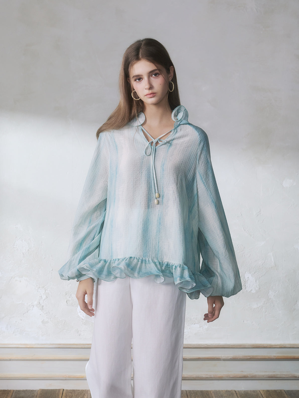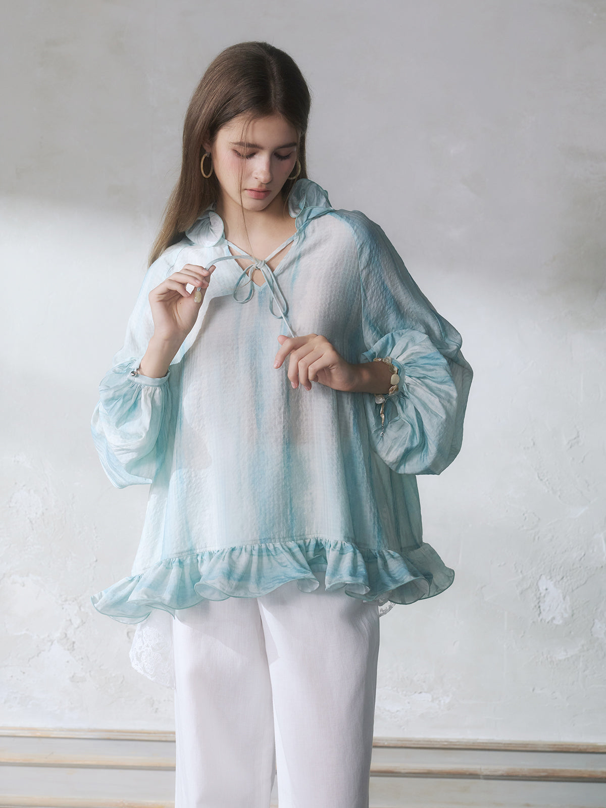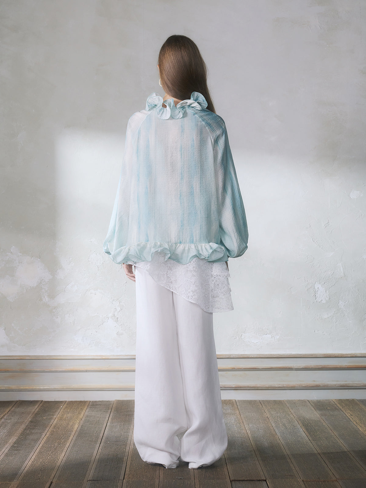 GUOJINGYI Light Blue Lace-Trim Shirt