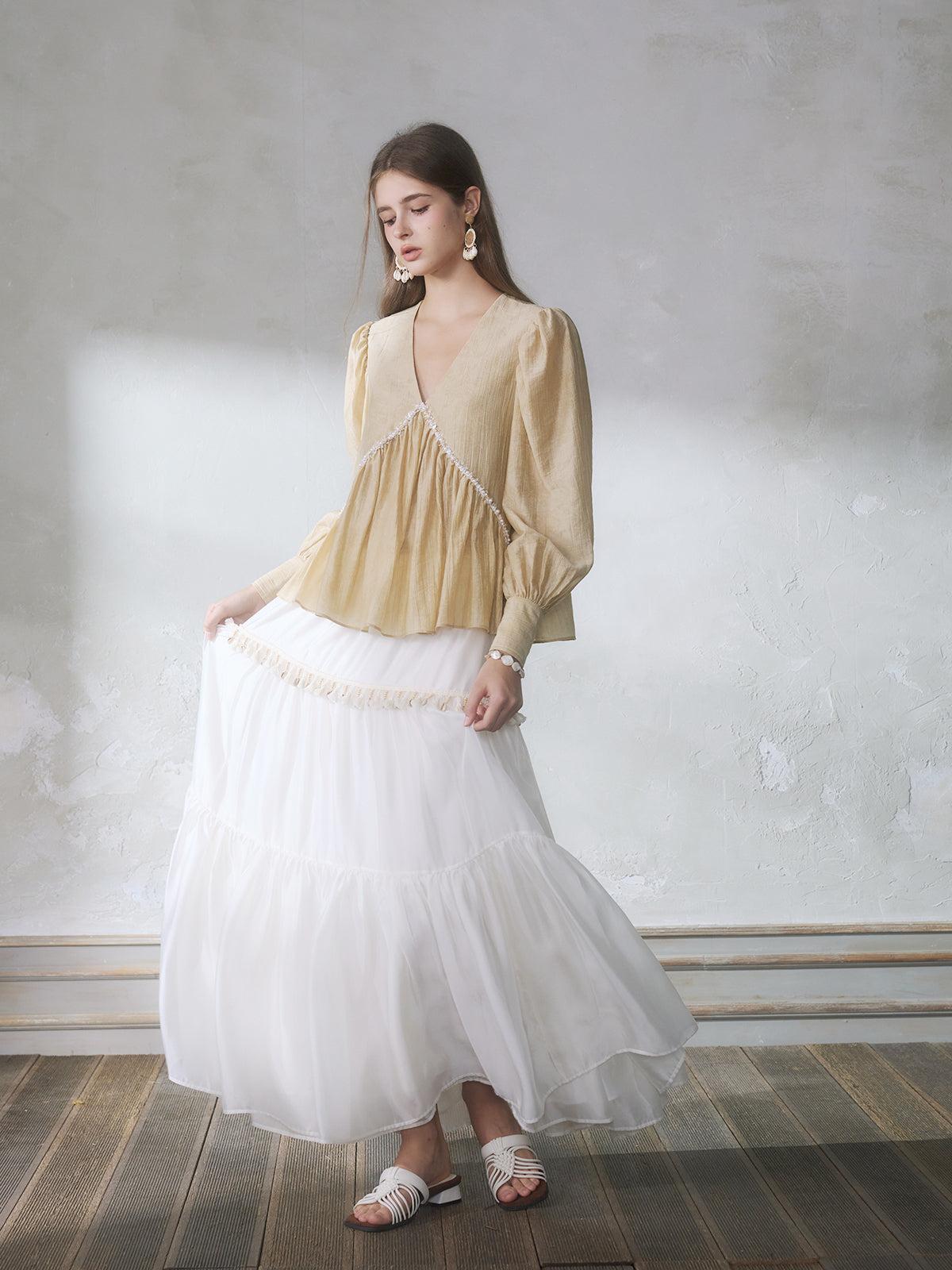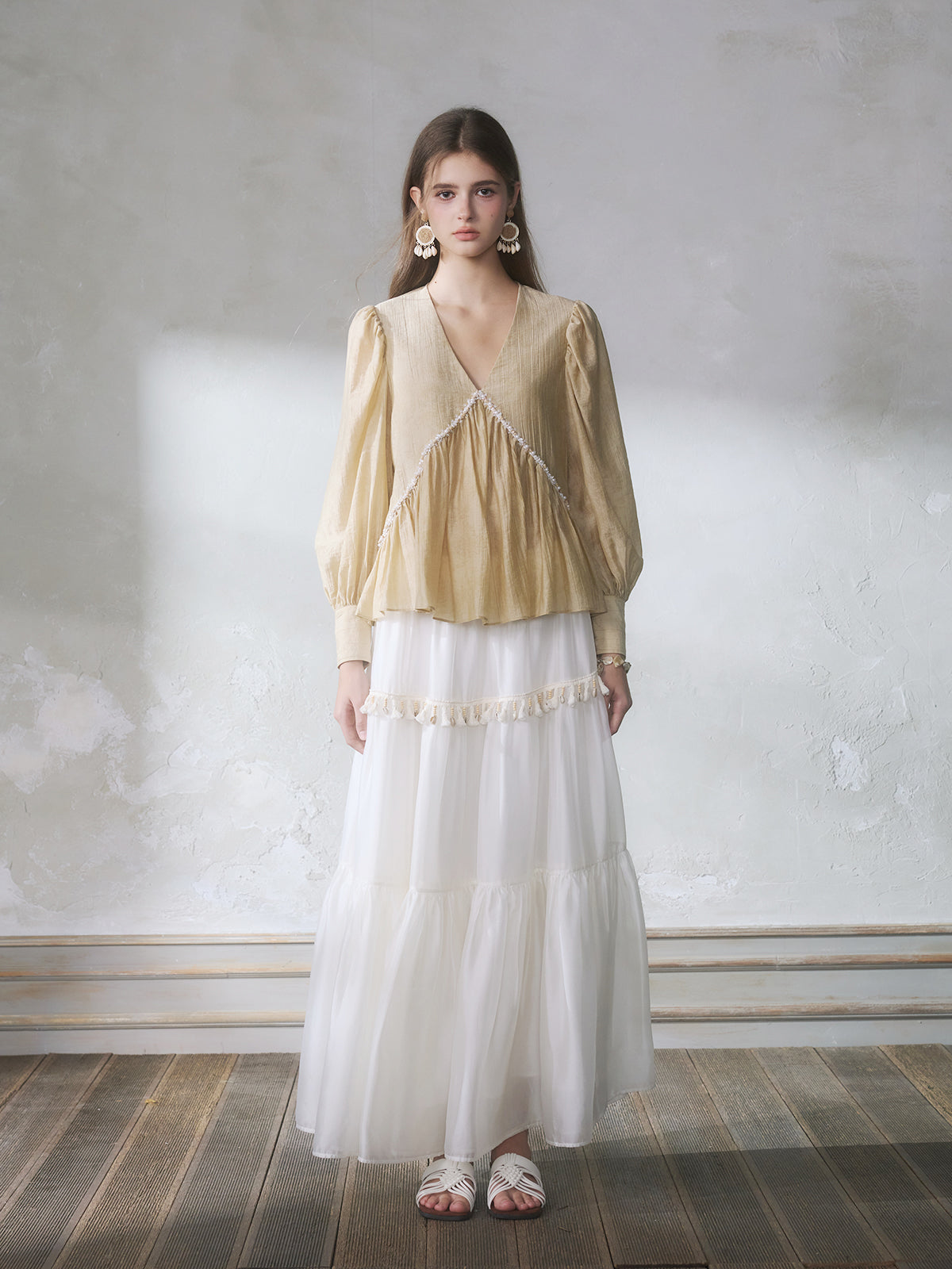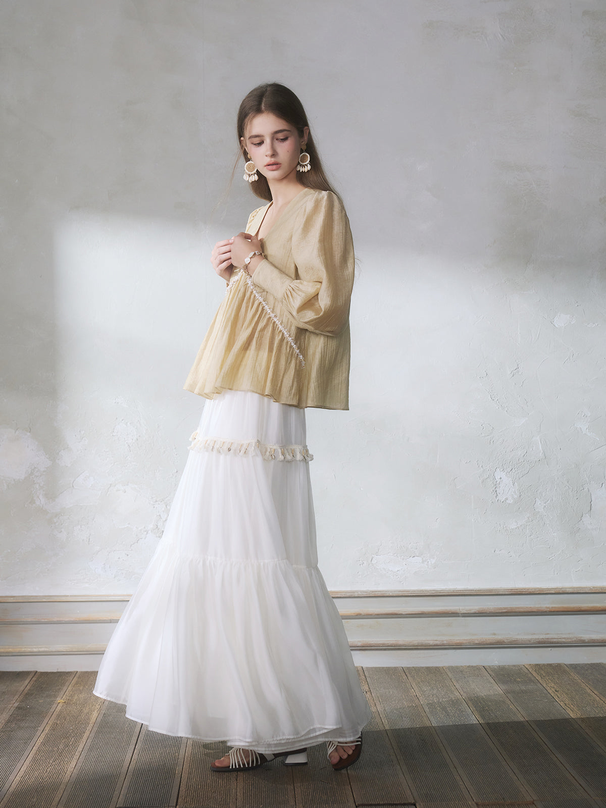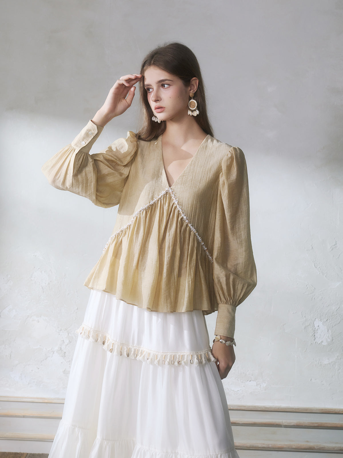 GUOJINGYI Light Khaki Pleated Beaded Lace Shirt & White Shimmer Organza Skirt Set