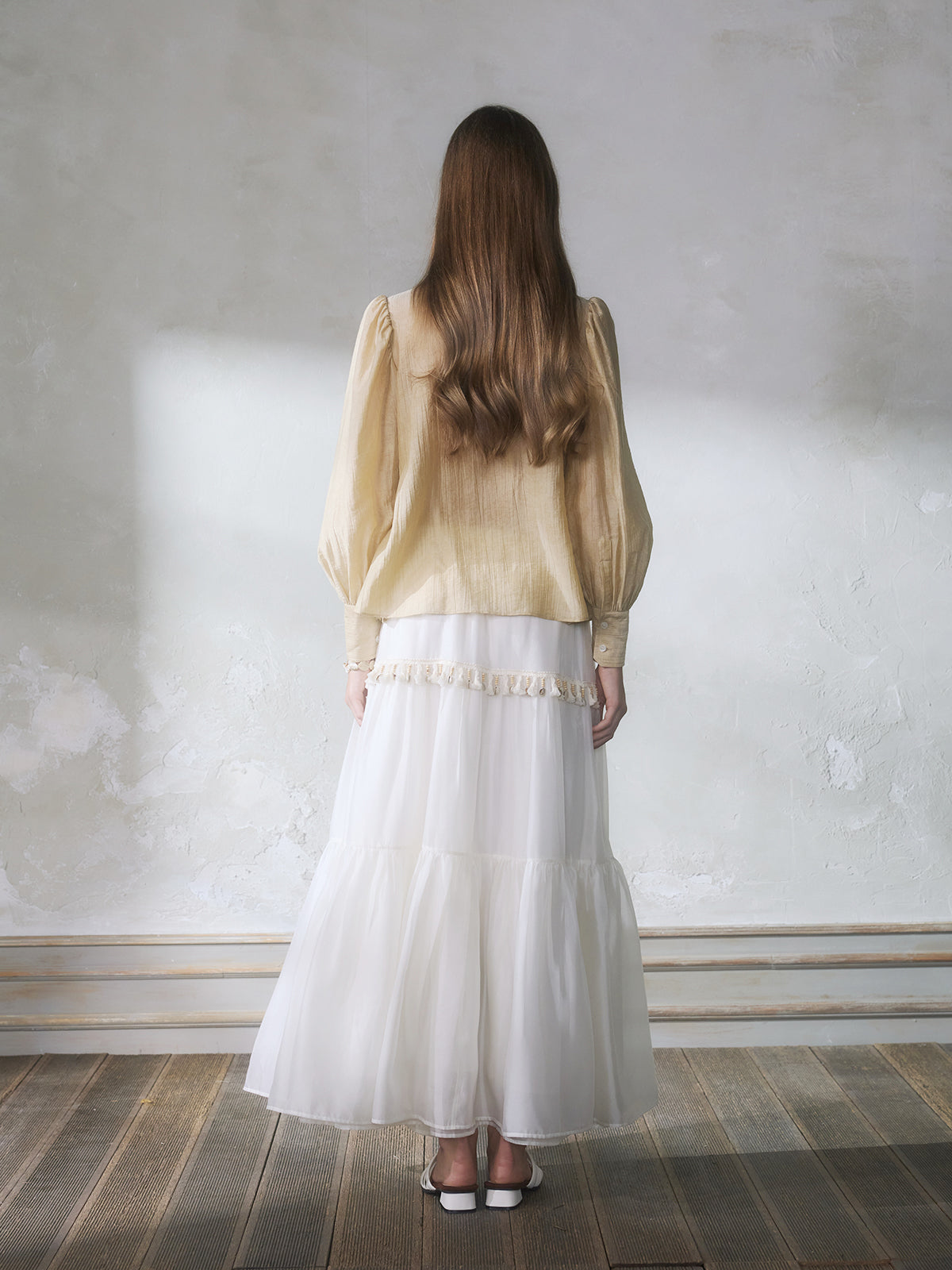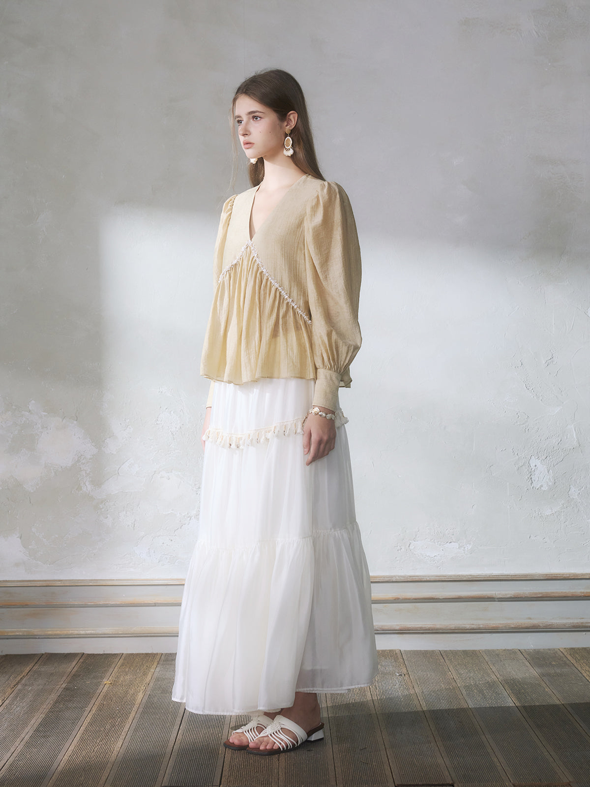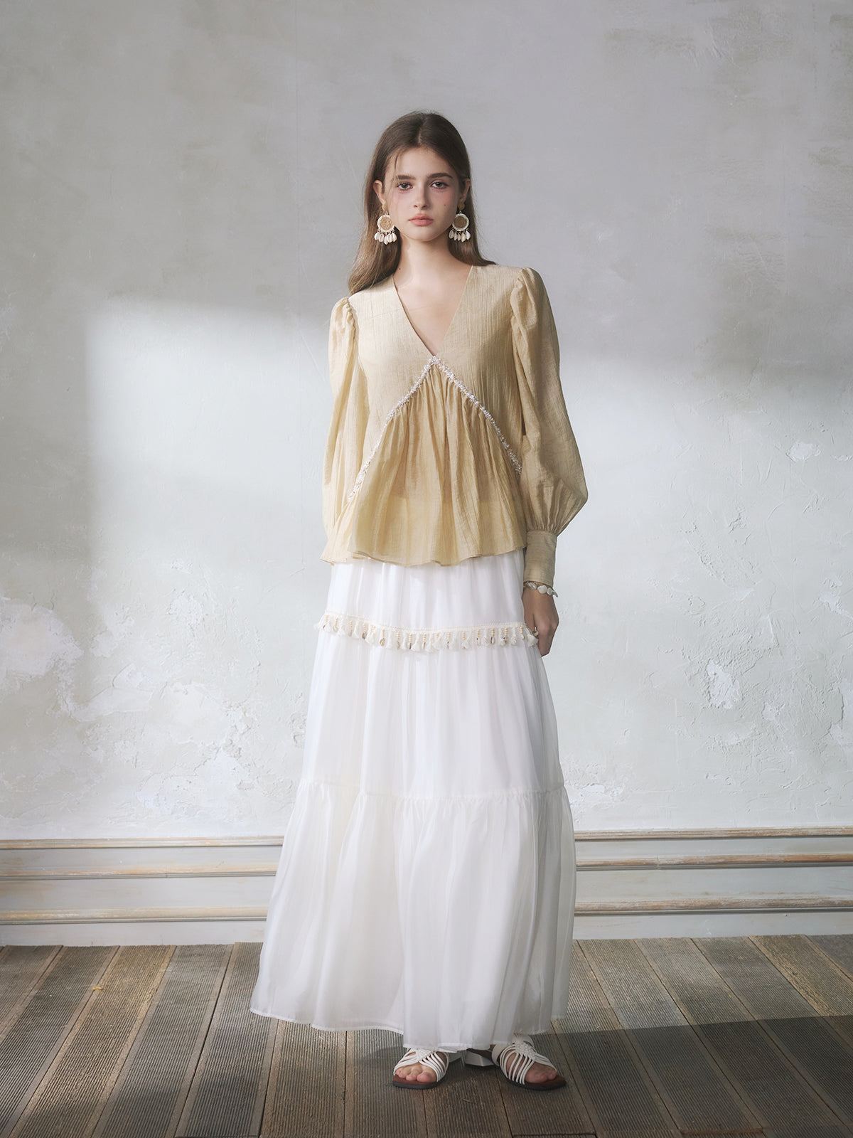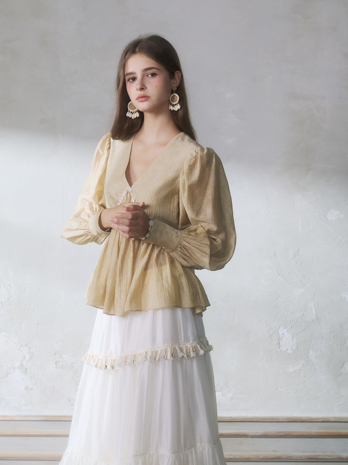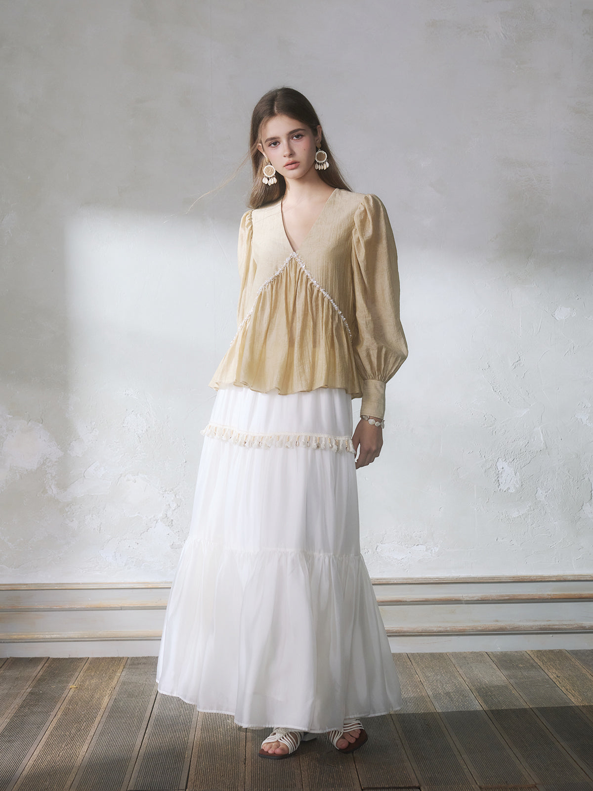 GUOJINGYI Light Khaki Pleated Beaded Lace Shirt & White Shimmer Organza Skirt Set