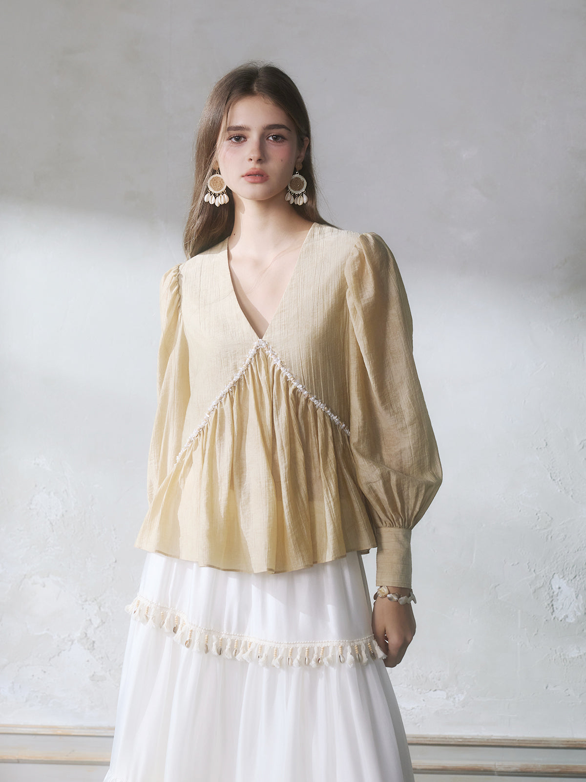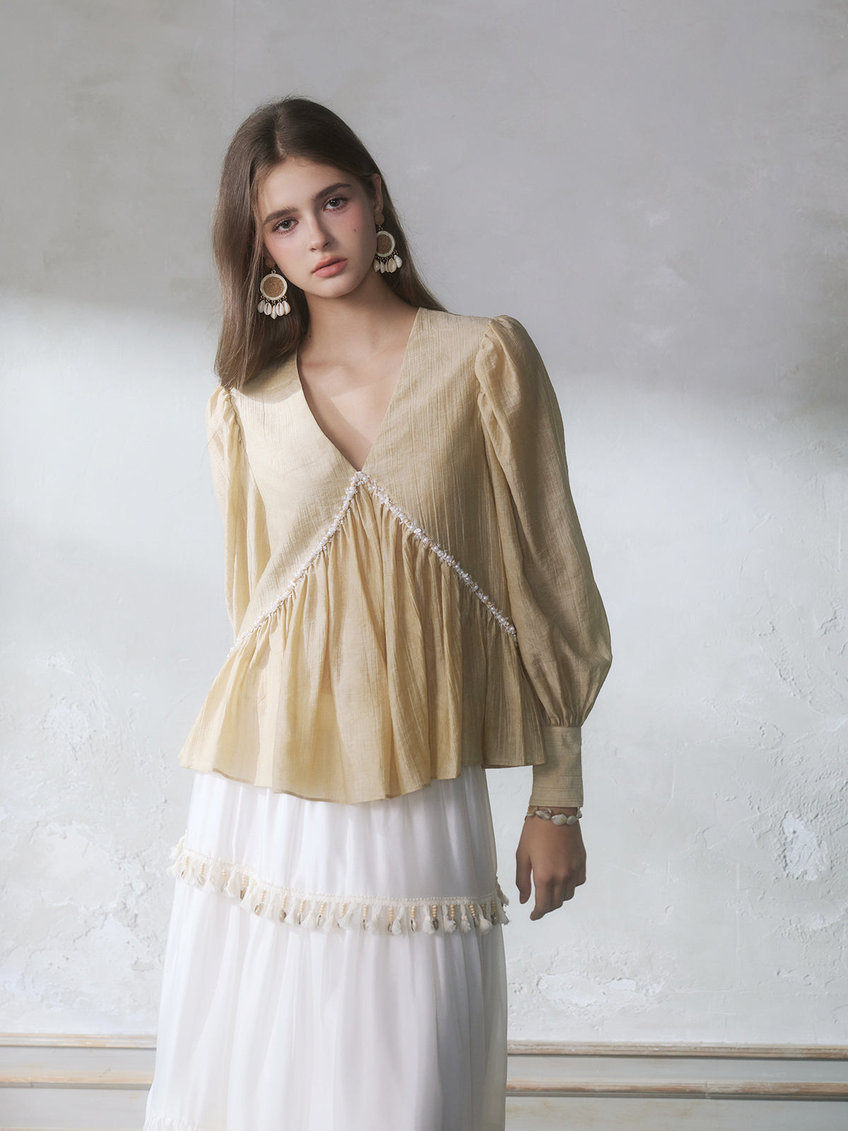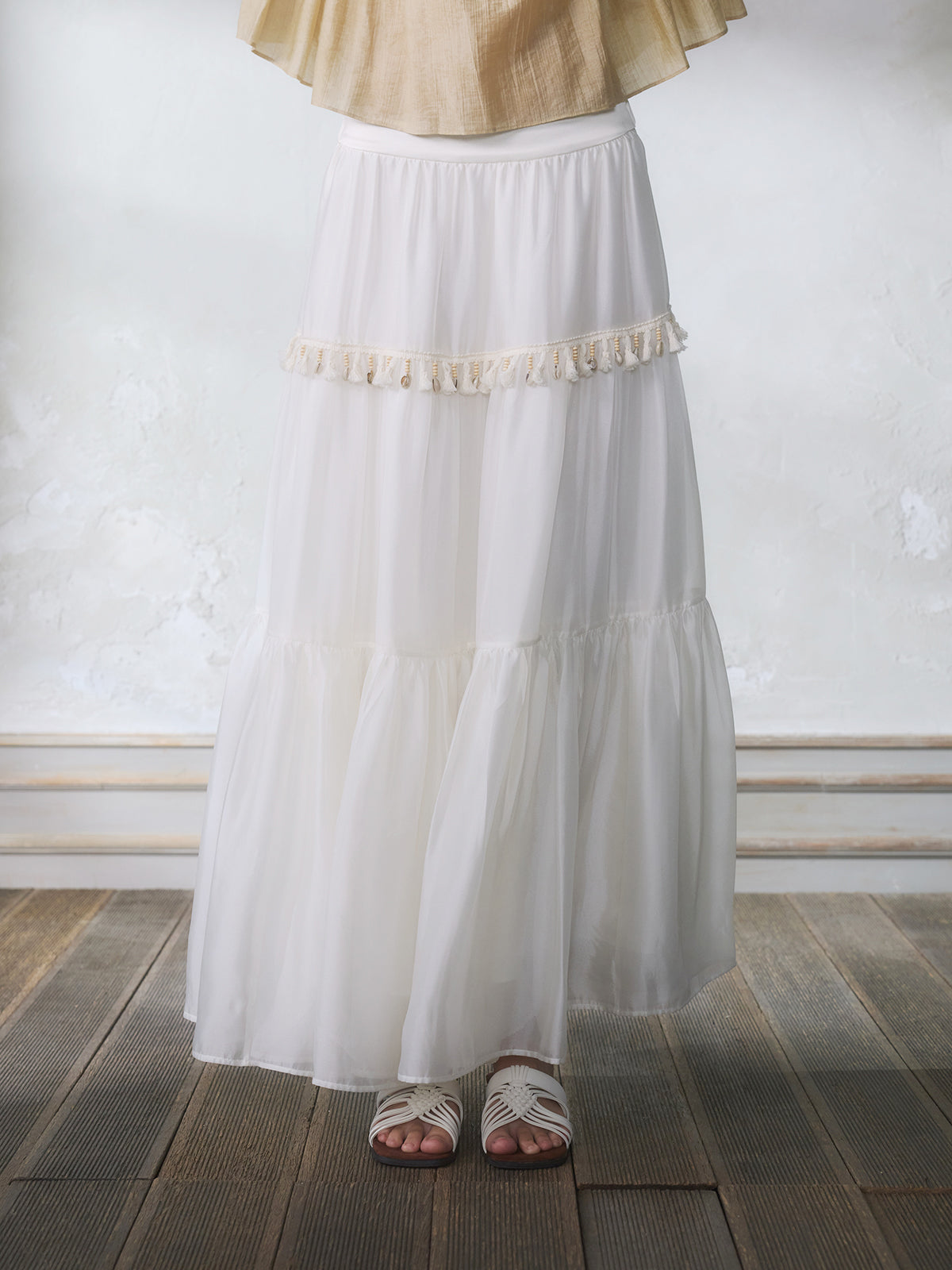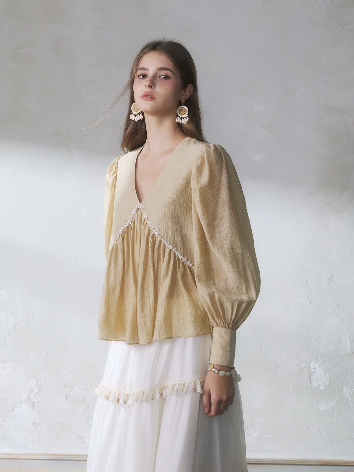 GUOJINGYI Light Khaki Pleated Beaded Lace Shirt & White Shimmer Organza Skirt Set