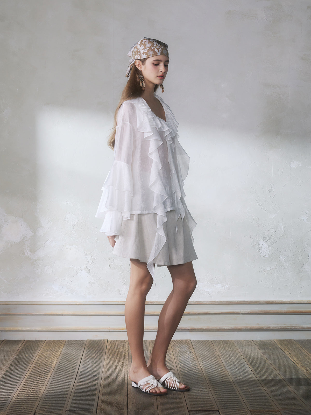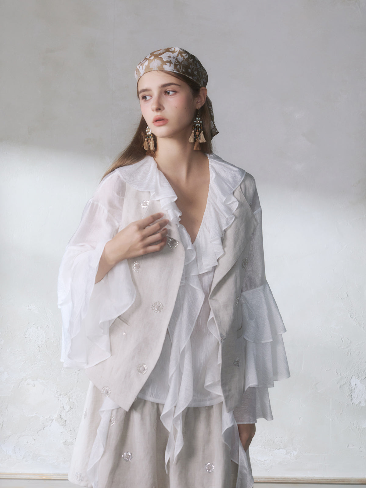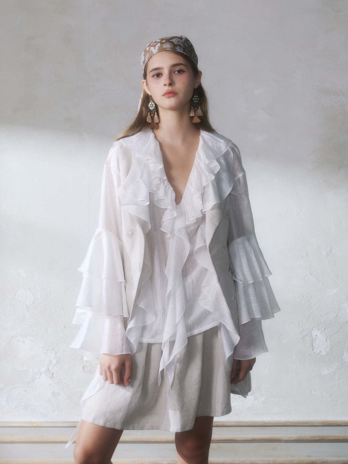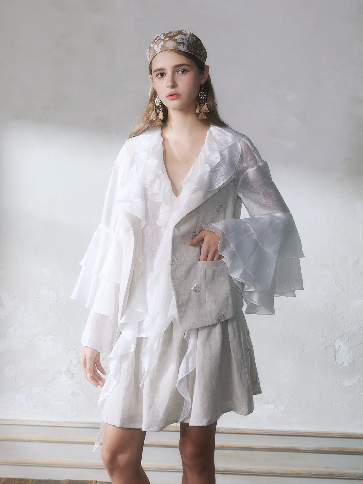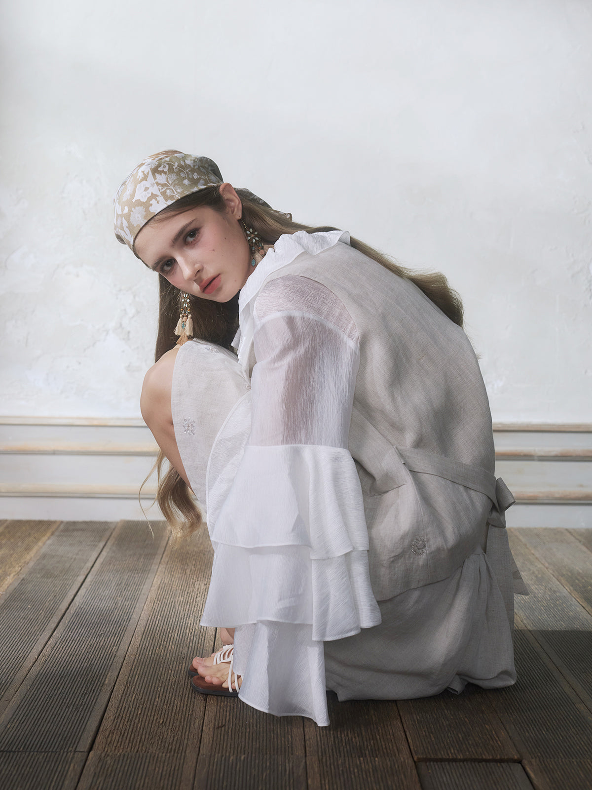 GUOJINGYI White Shimmer Acetate Ruffle Shirt Linen Skirt & Linen Vest Set