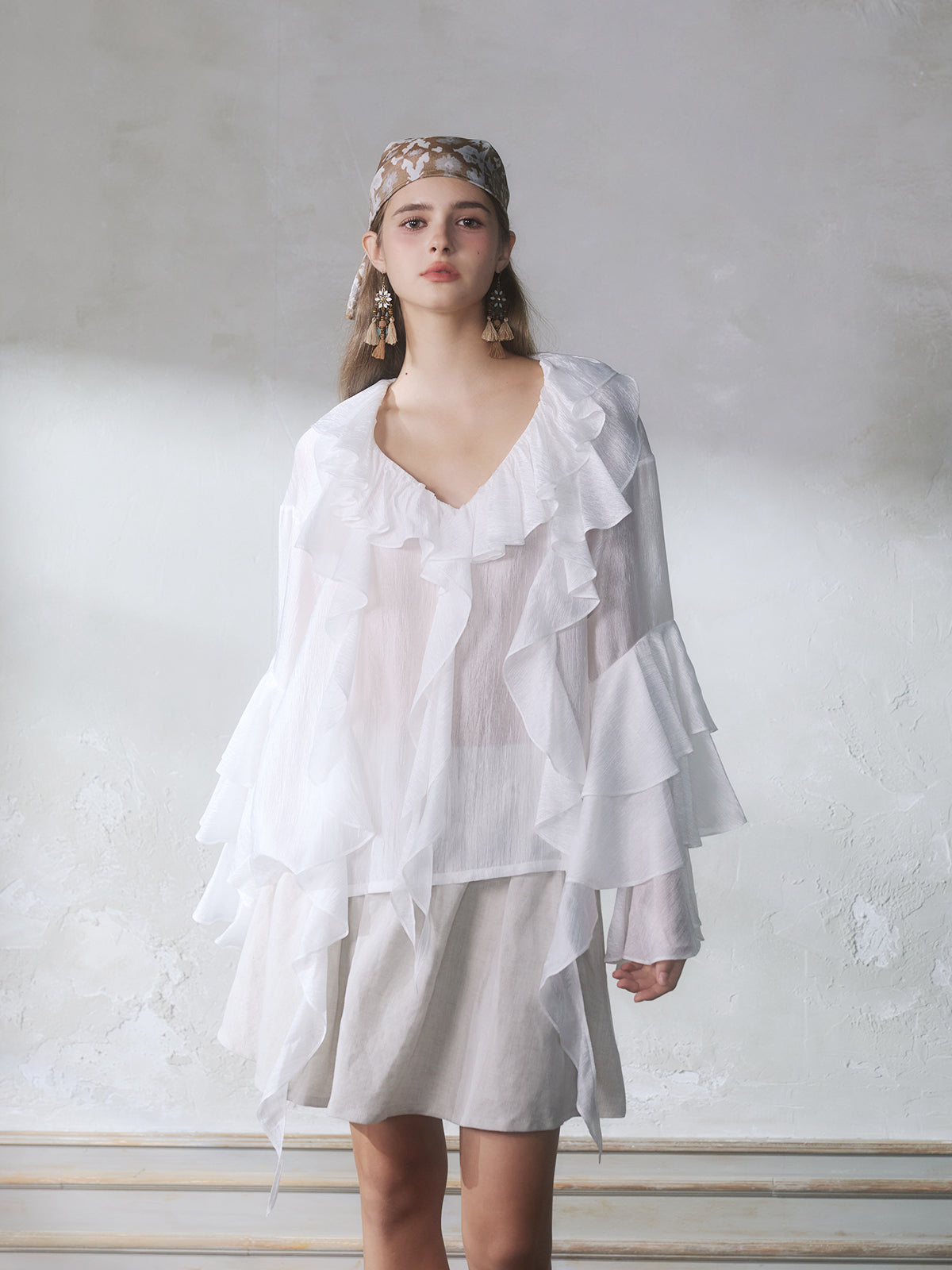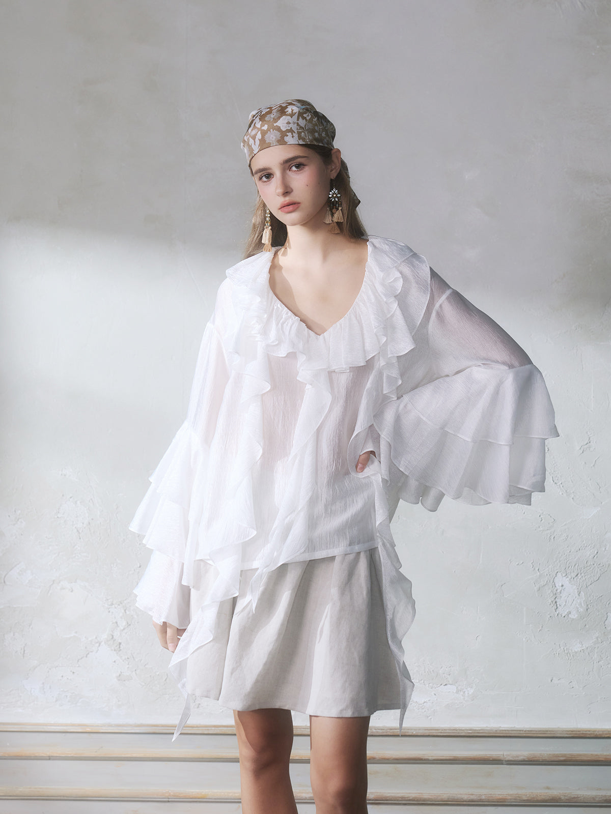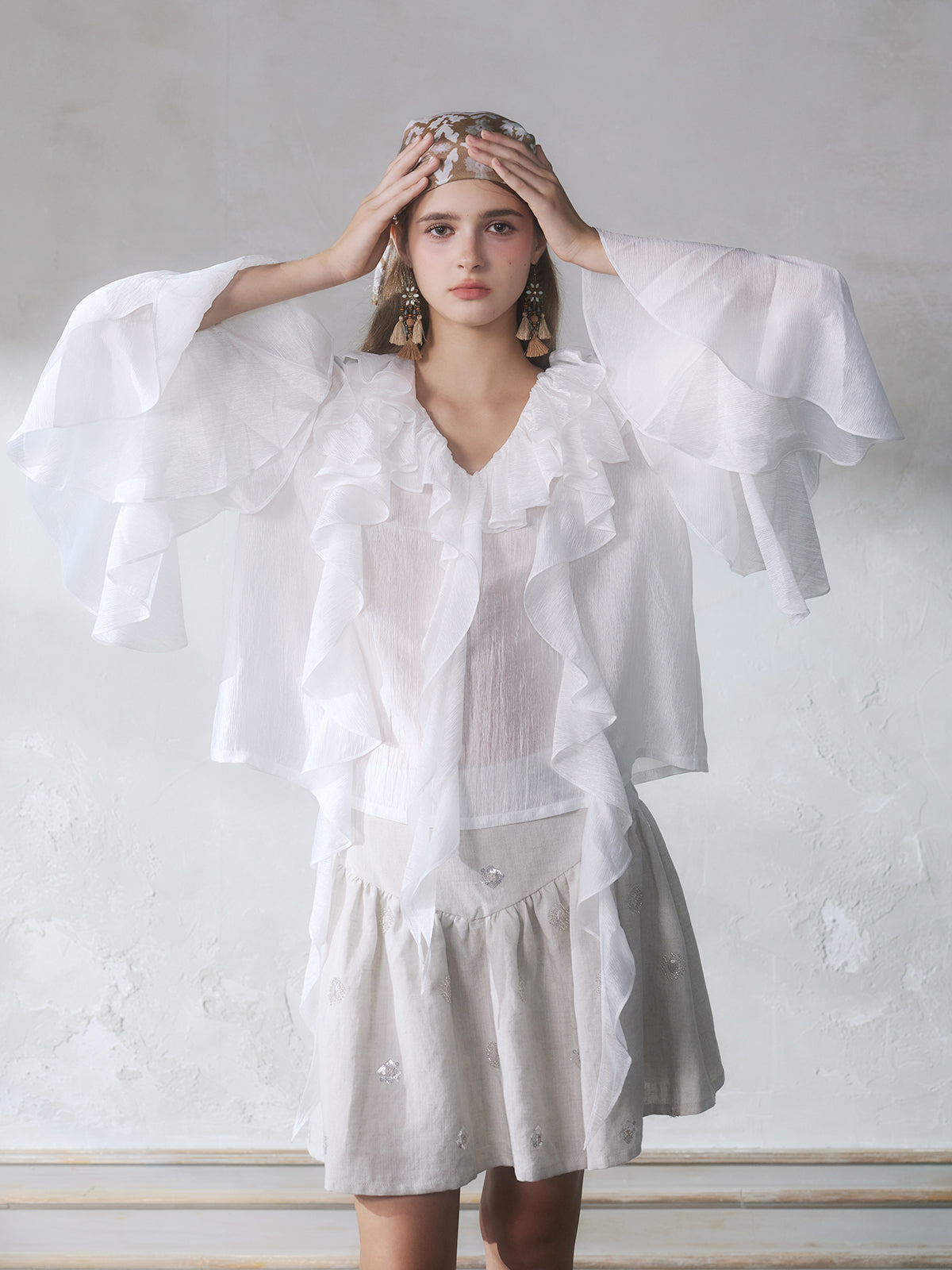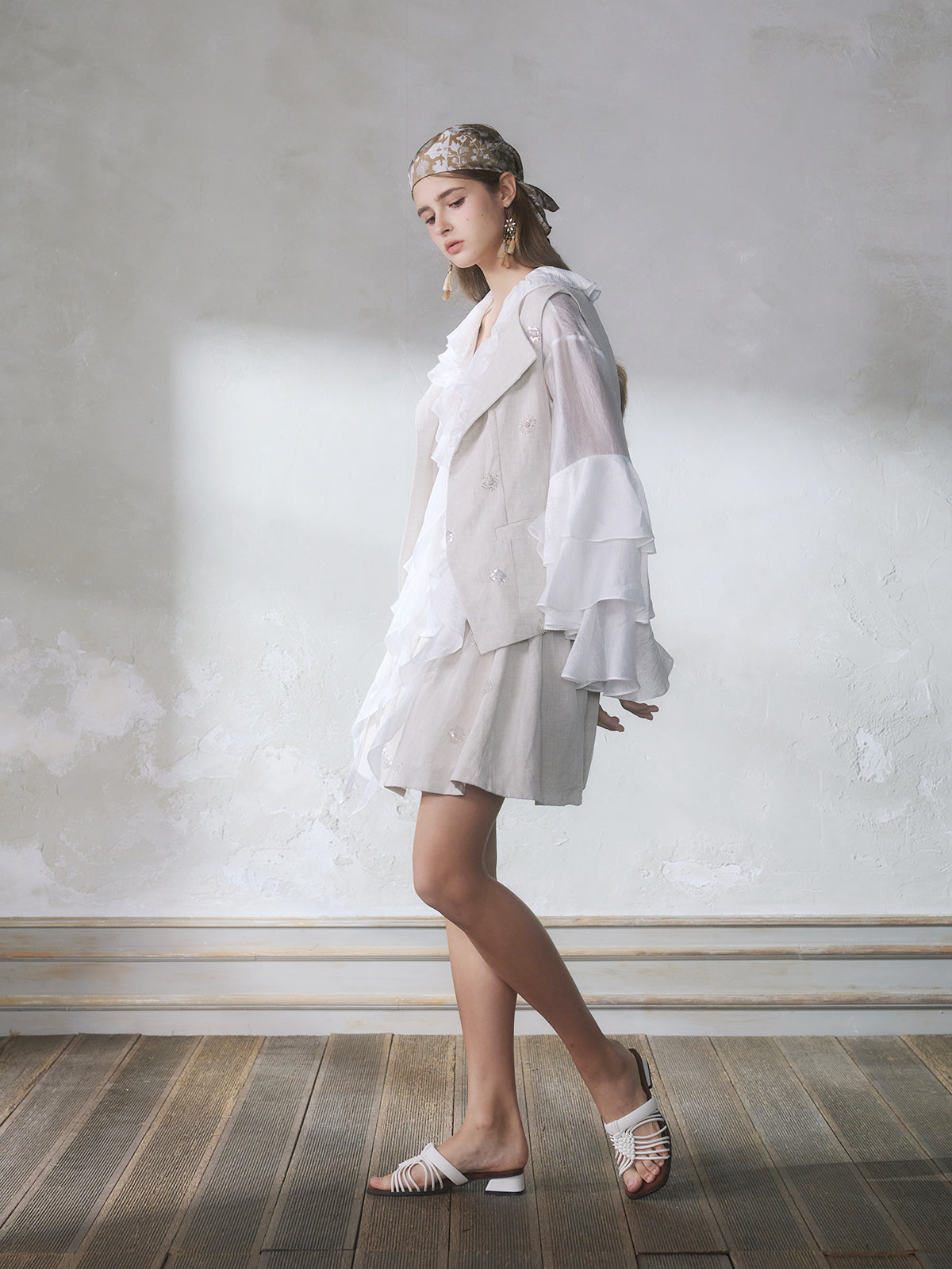 GUOJINGYI White Shimmer Acetate Ruffle Shirt Linen Skirt & Linen Vest Set