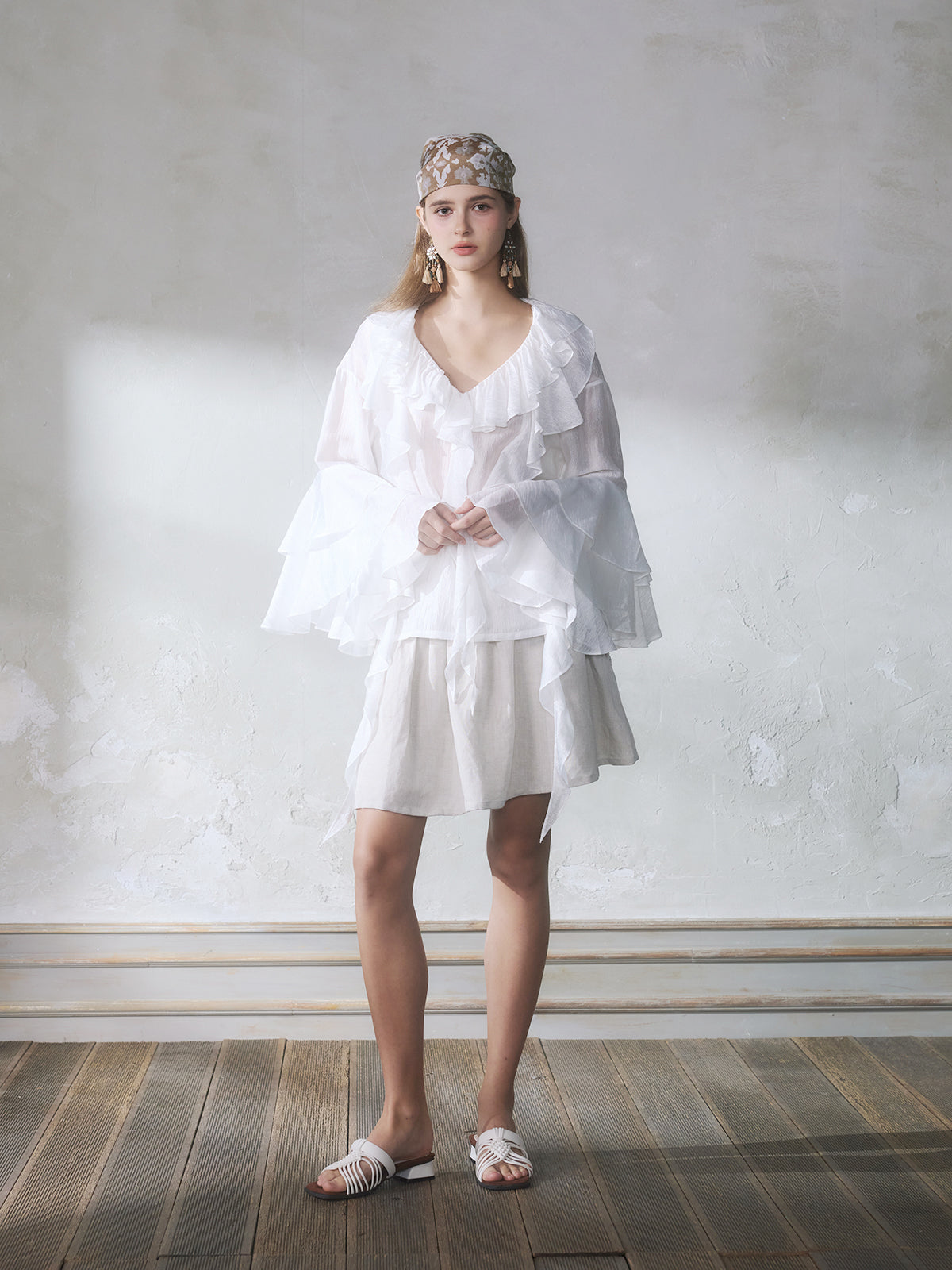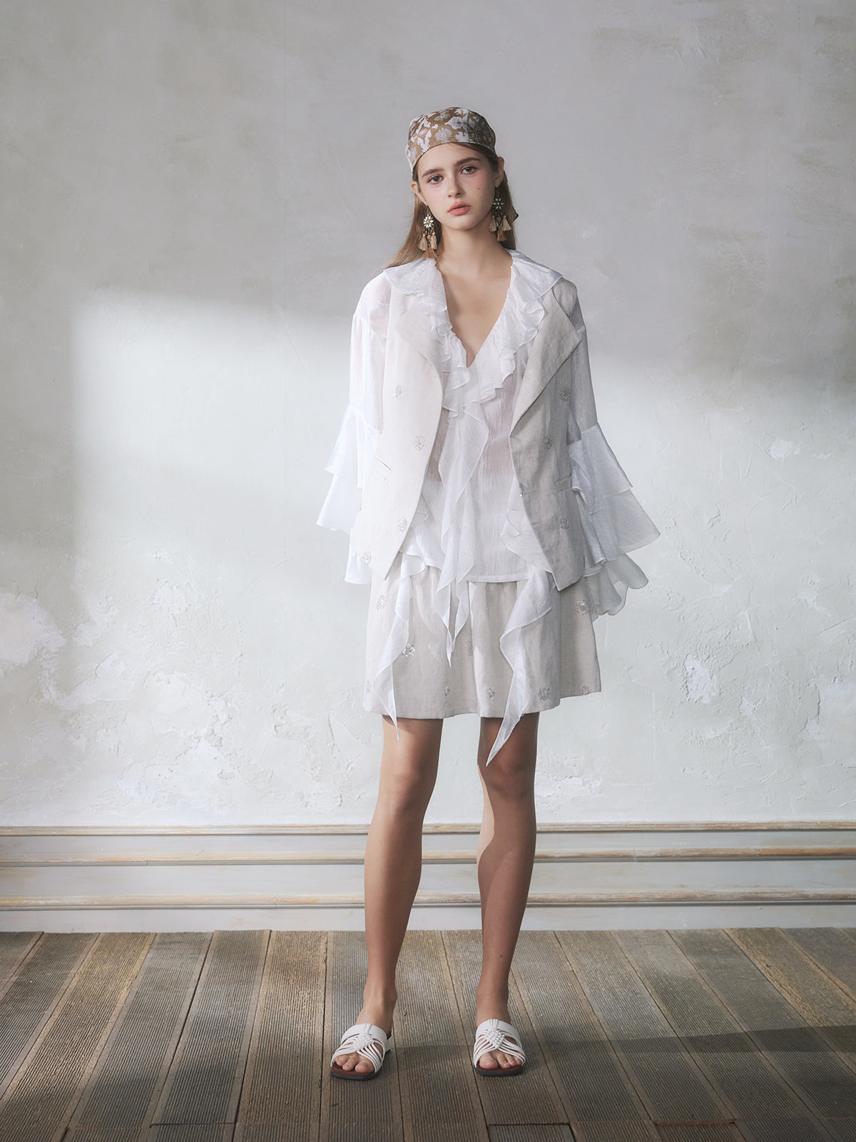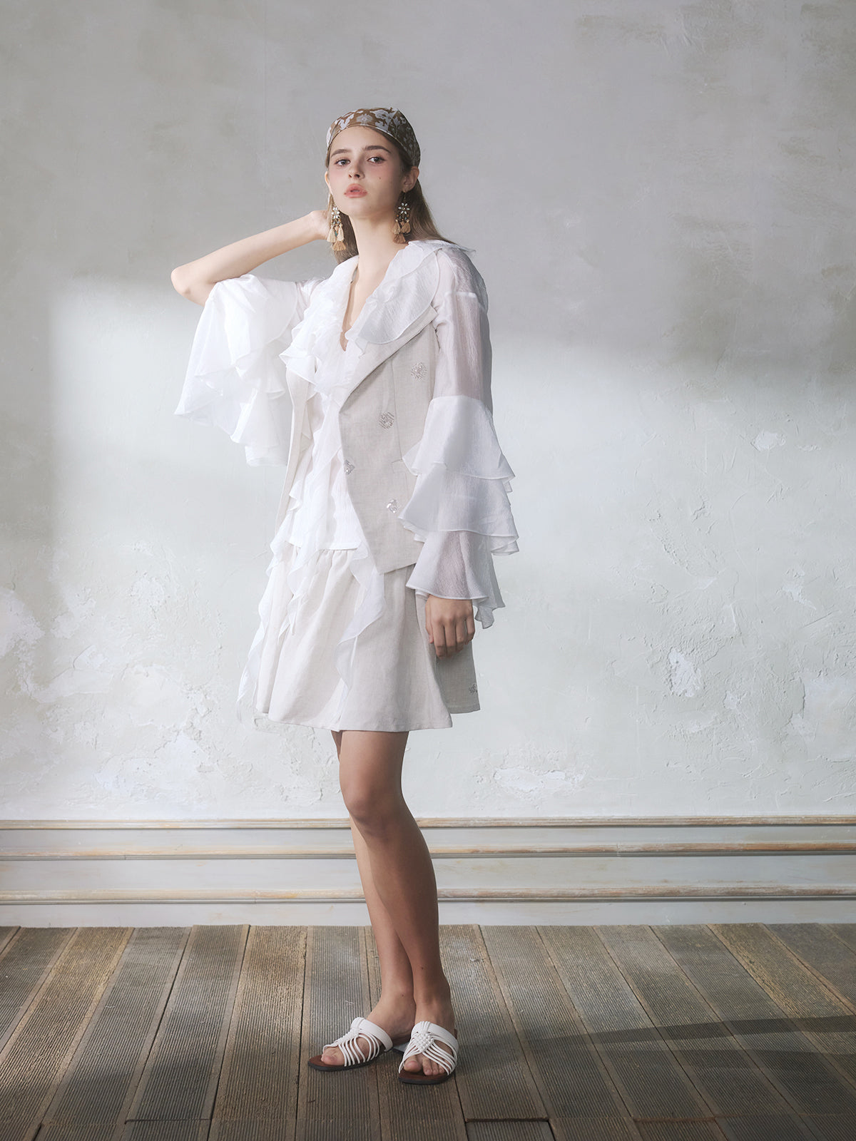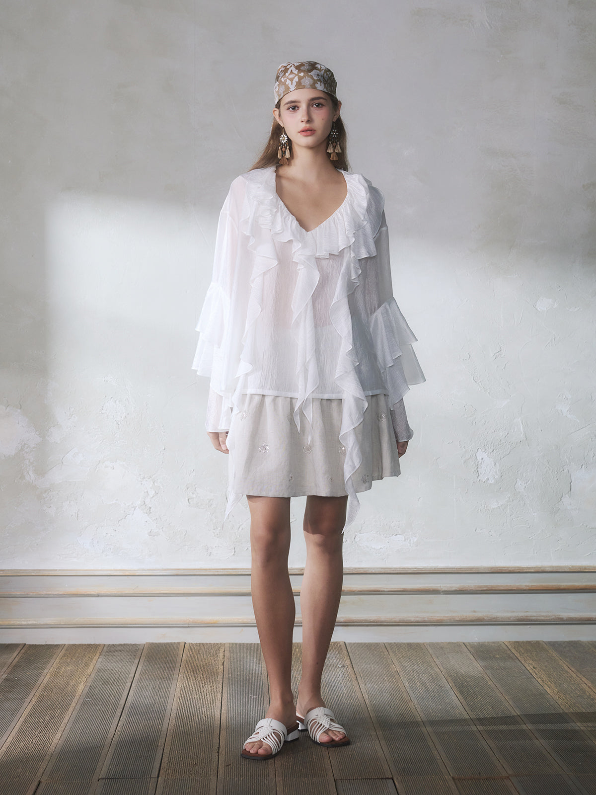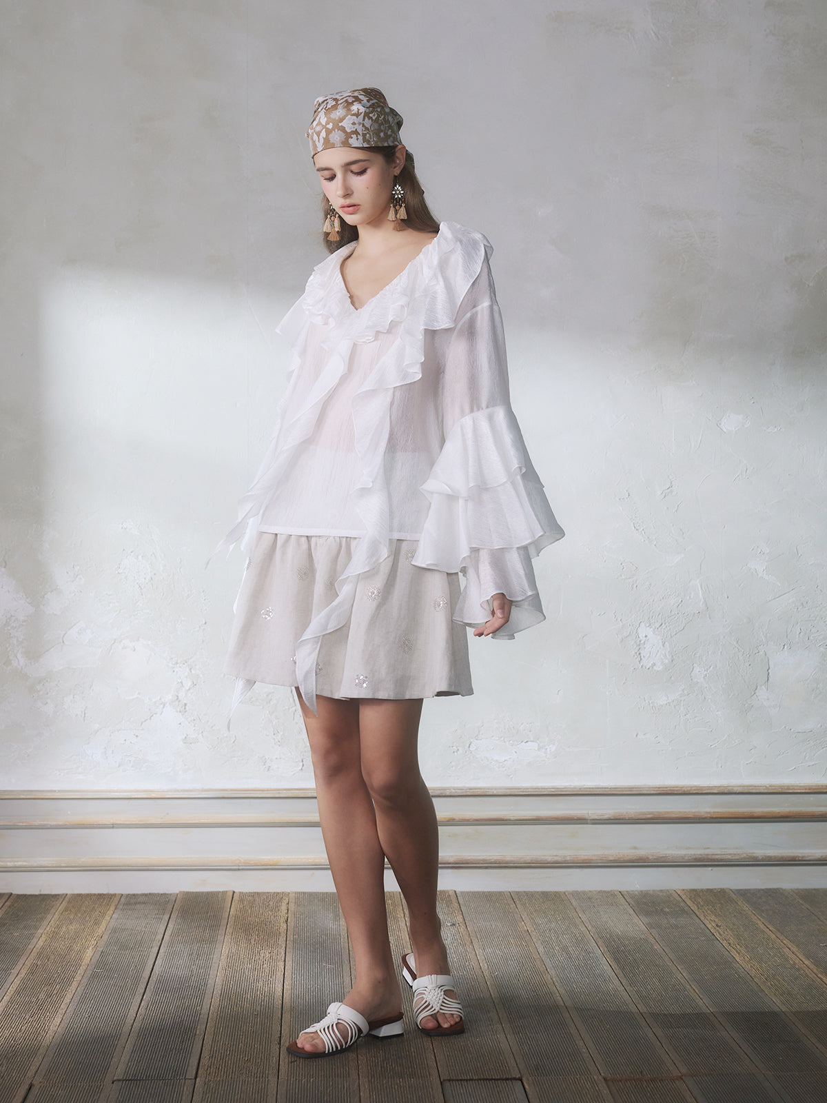 GUOJINGYI White Shimmer Acetate Ruffle Shirt Linen Skirt & Linen Vest Set