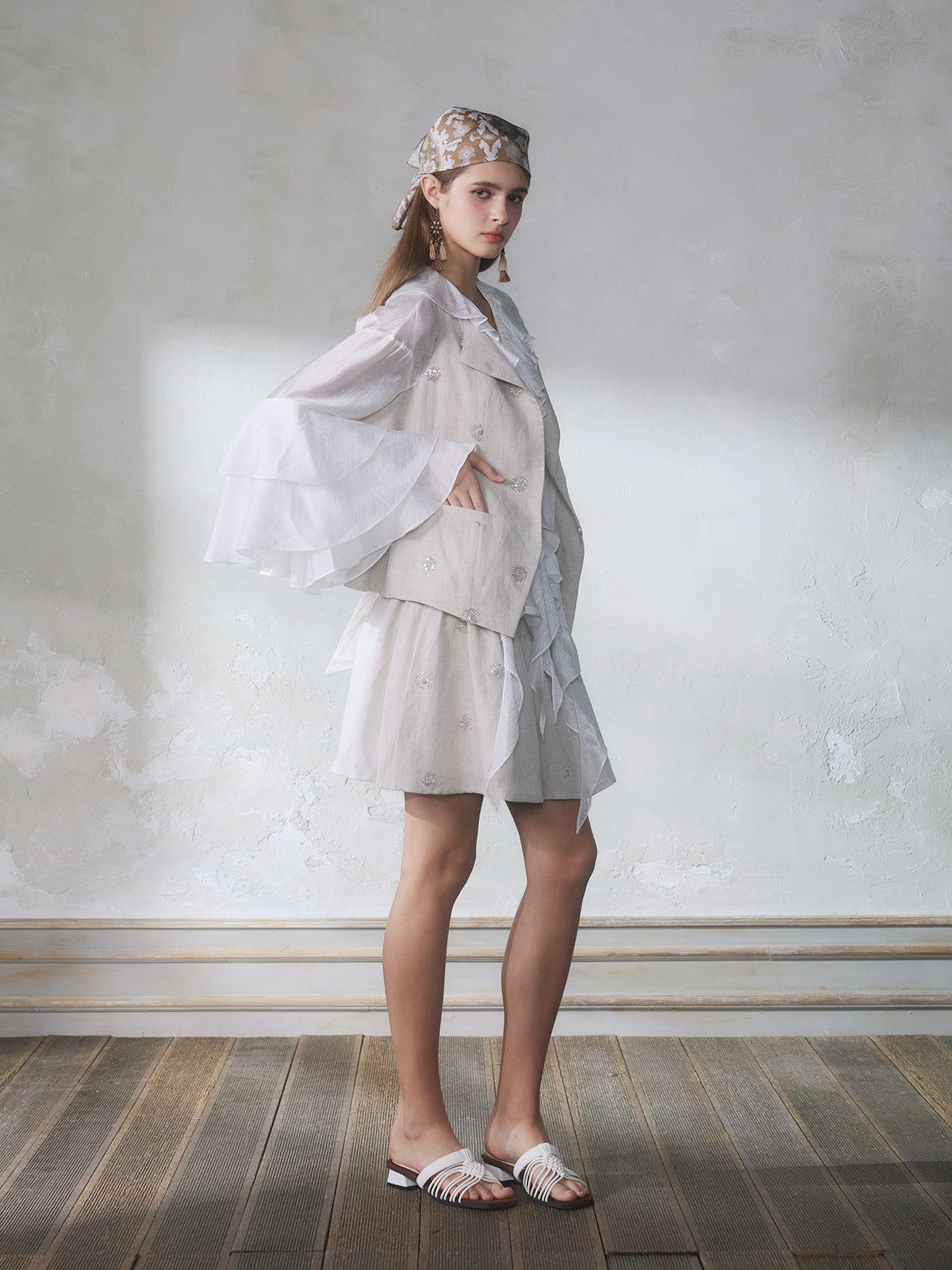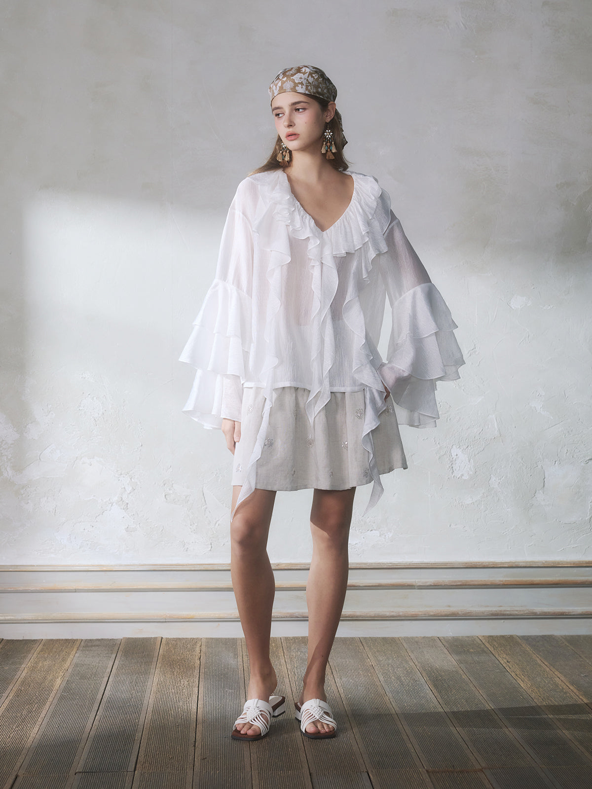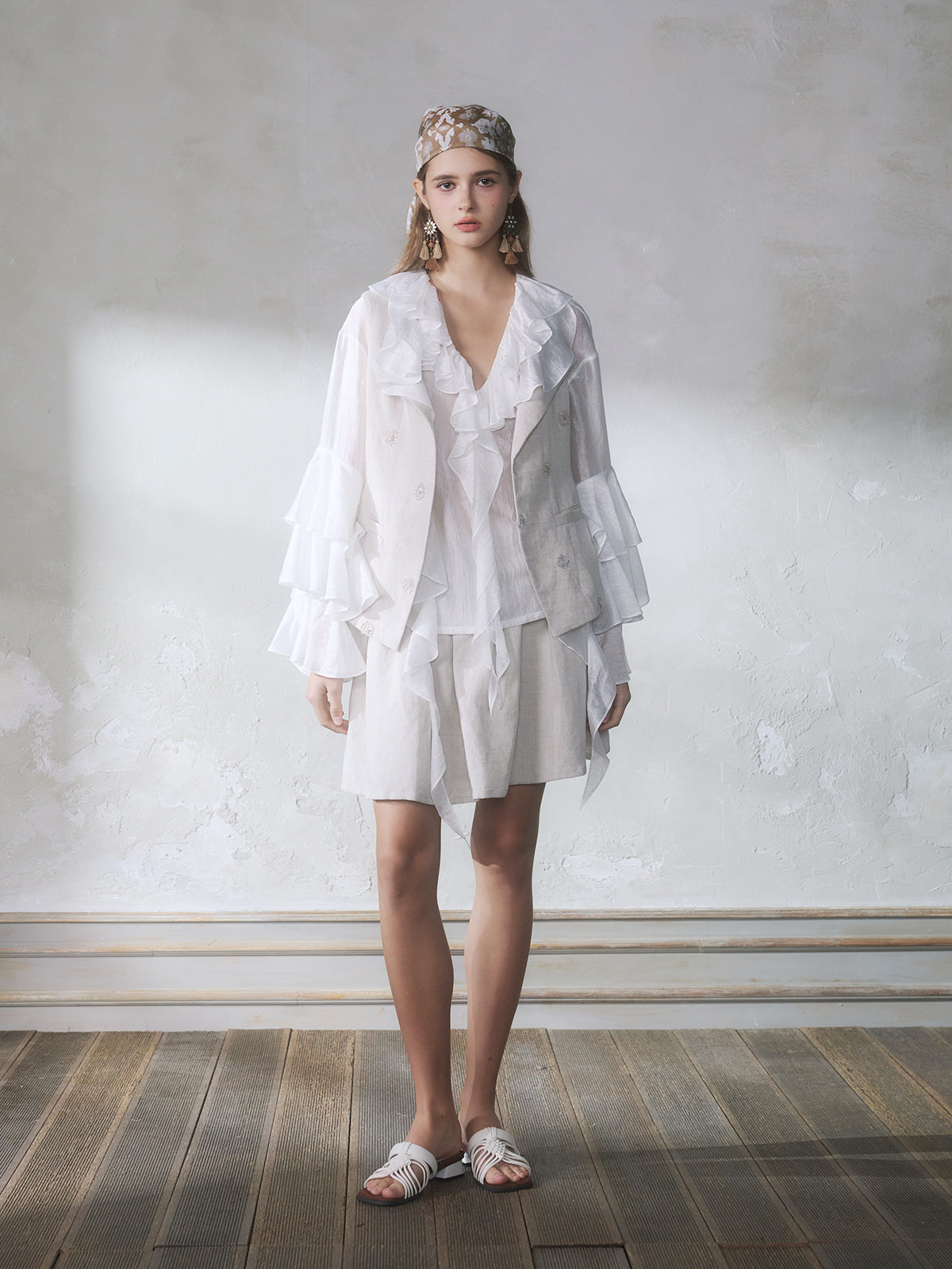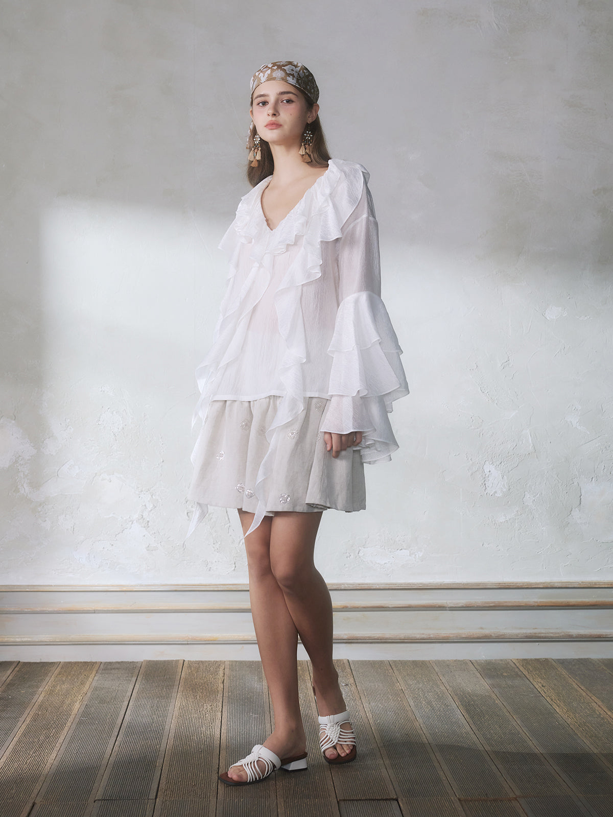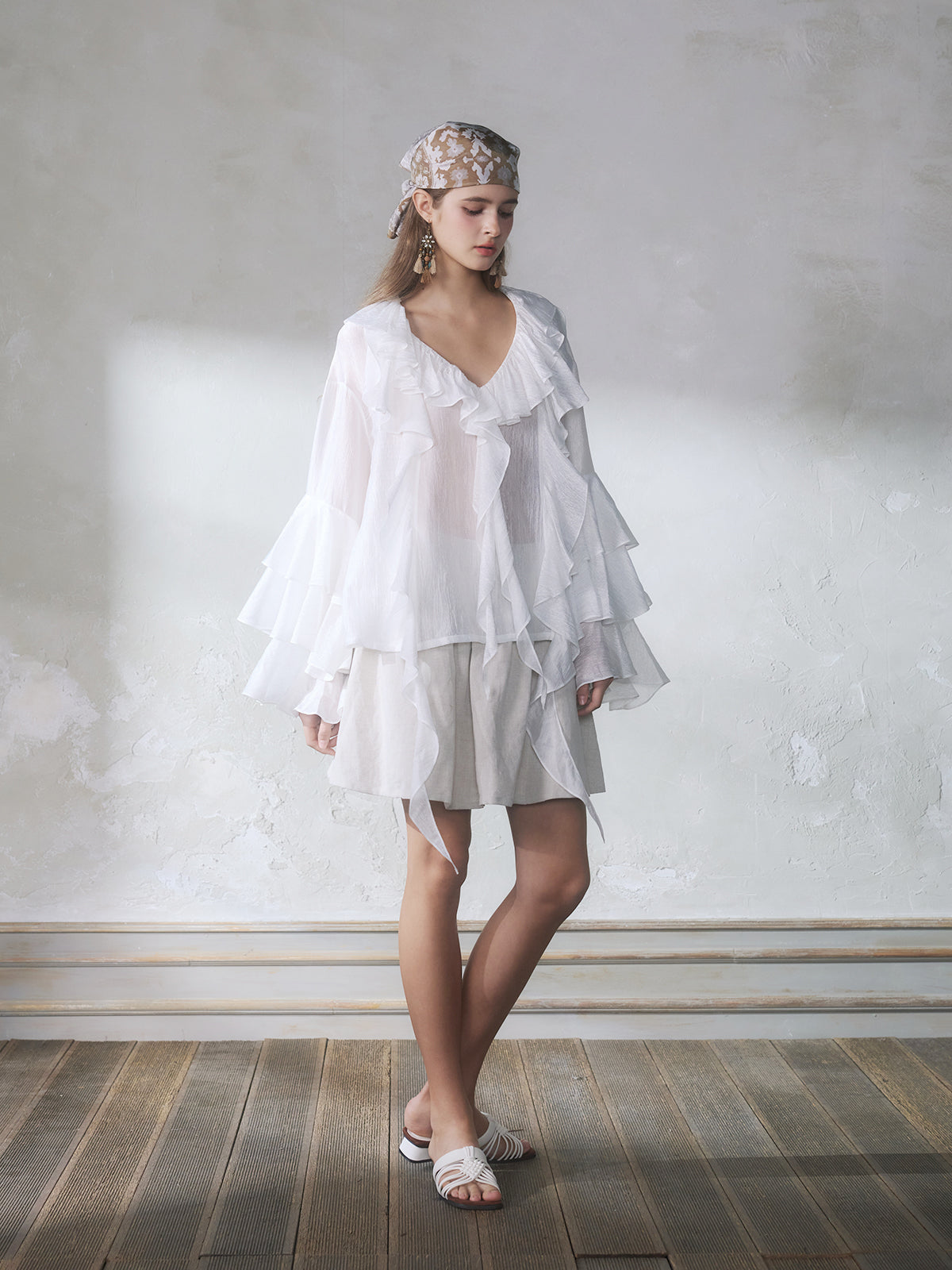 GUOJINGYI White Shimmer Acetate Ruffle Shirt Linen Skirt & Linen Vest Set