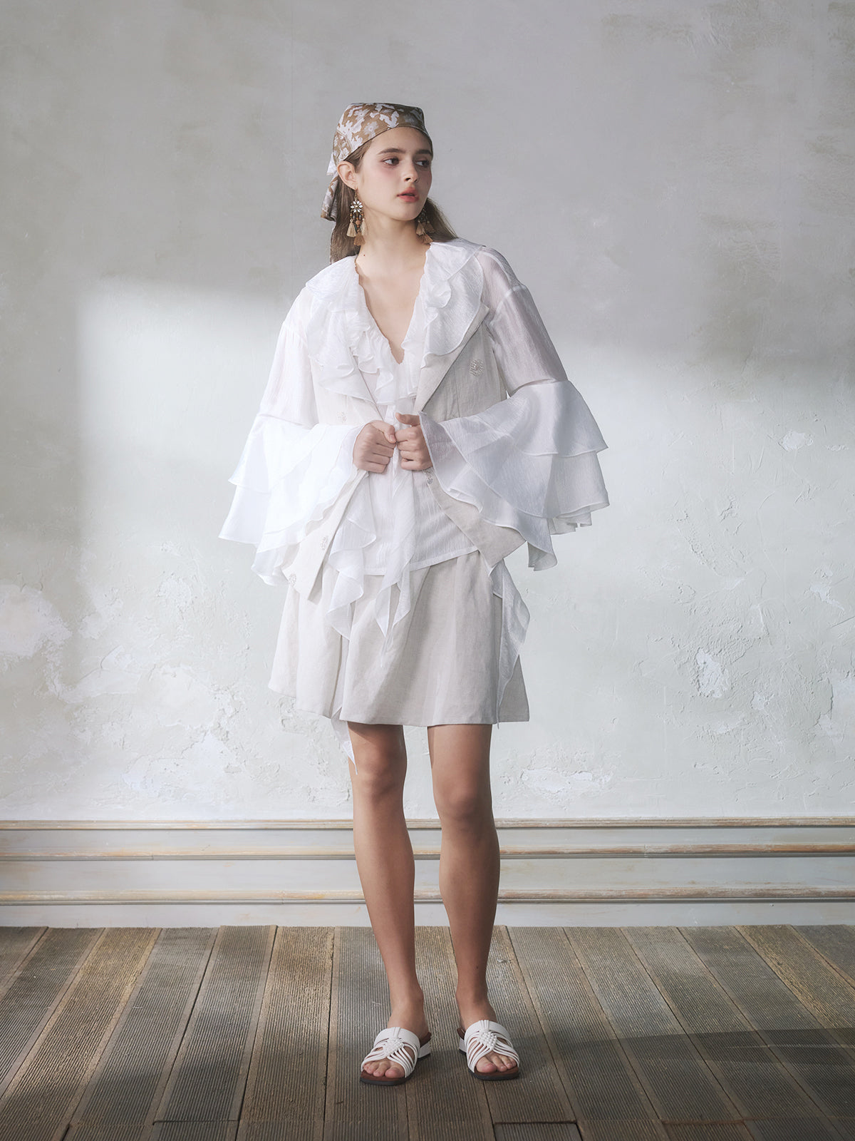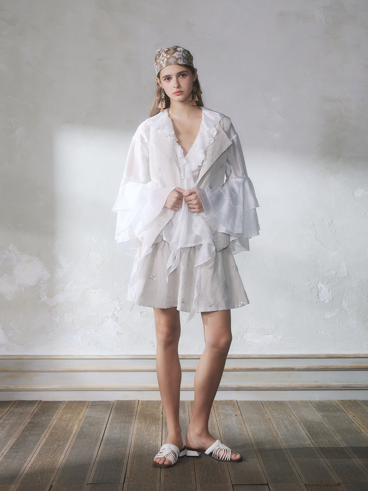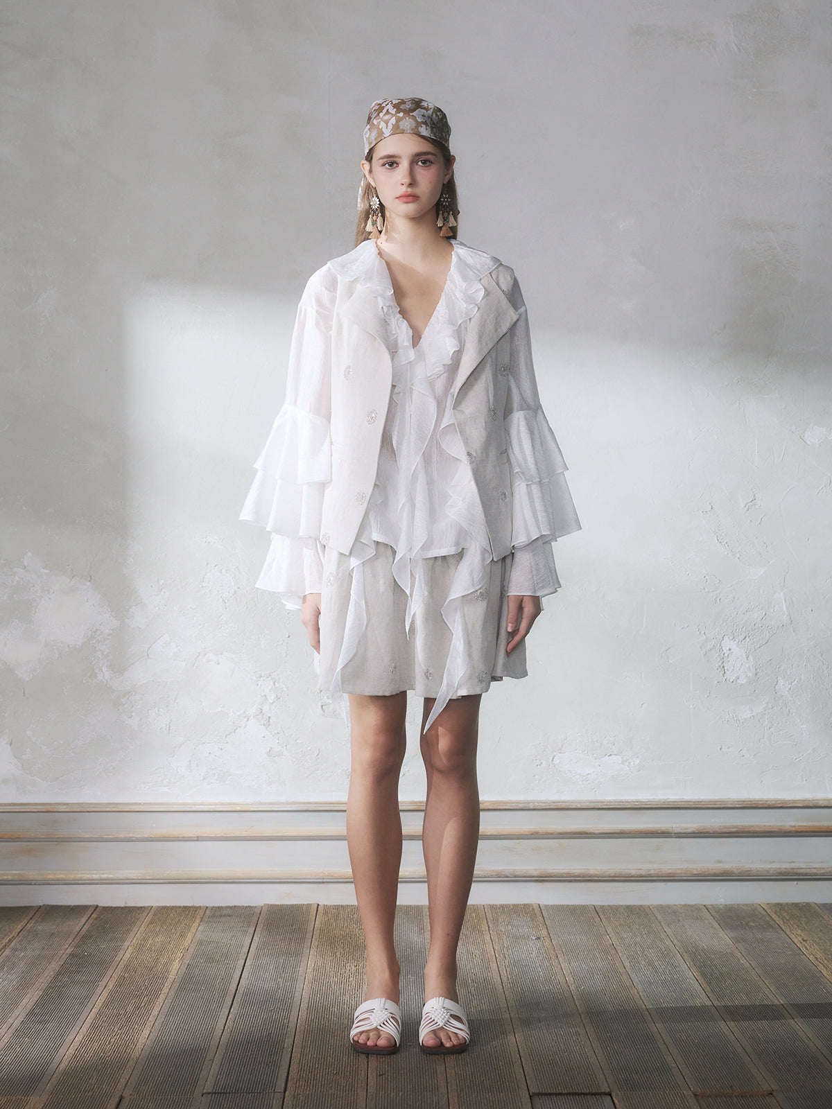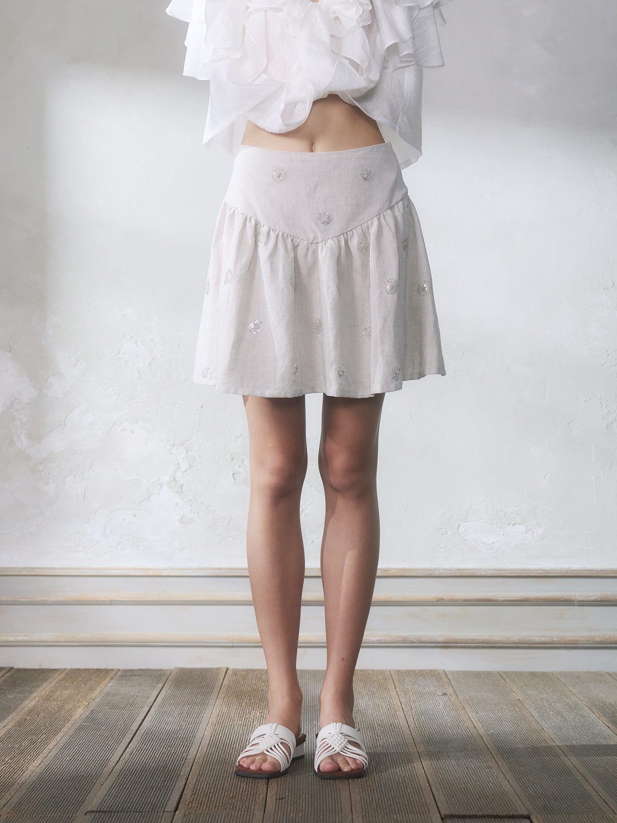 GUOJINGYI White Shimmer Acetate Ruffle Shirt Linen Skirt & Linen Vest Set