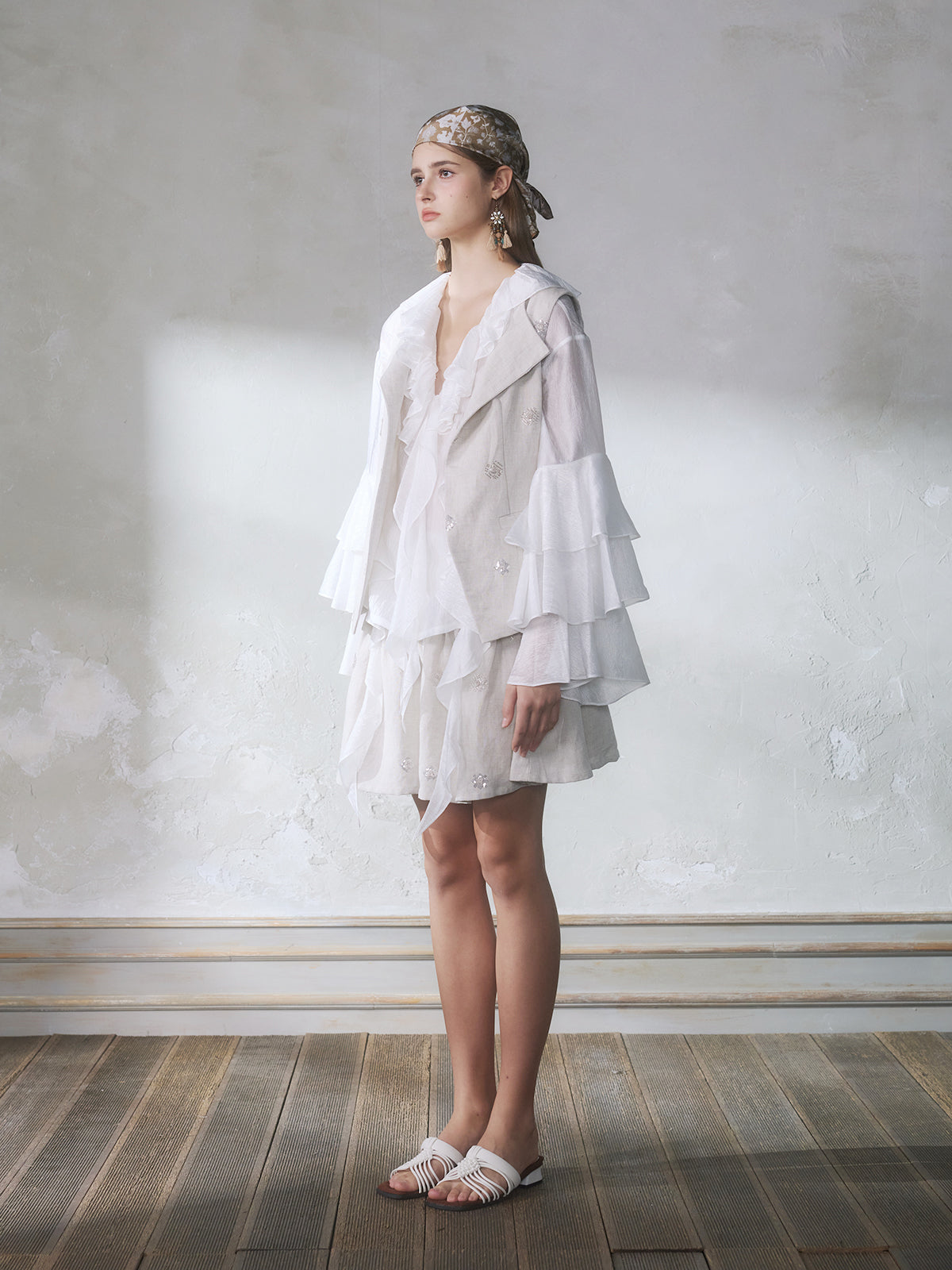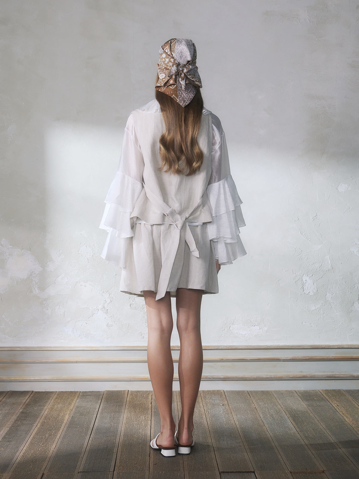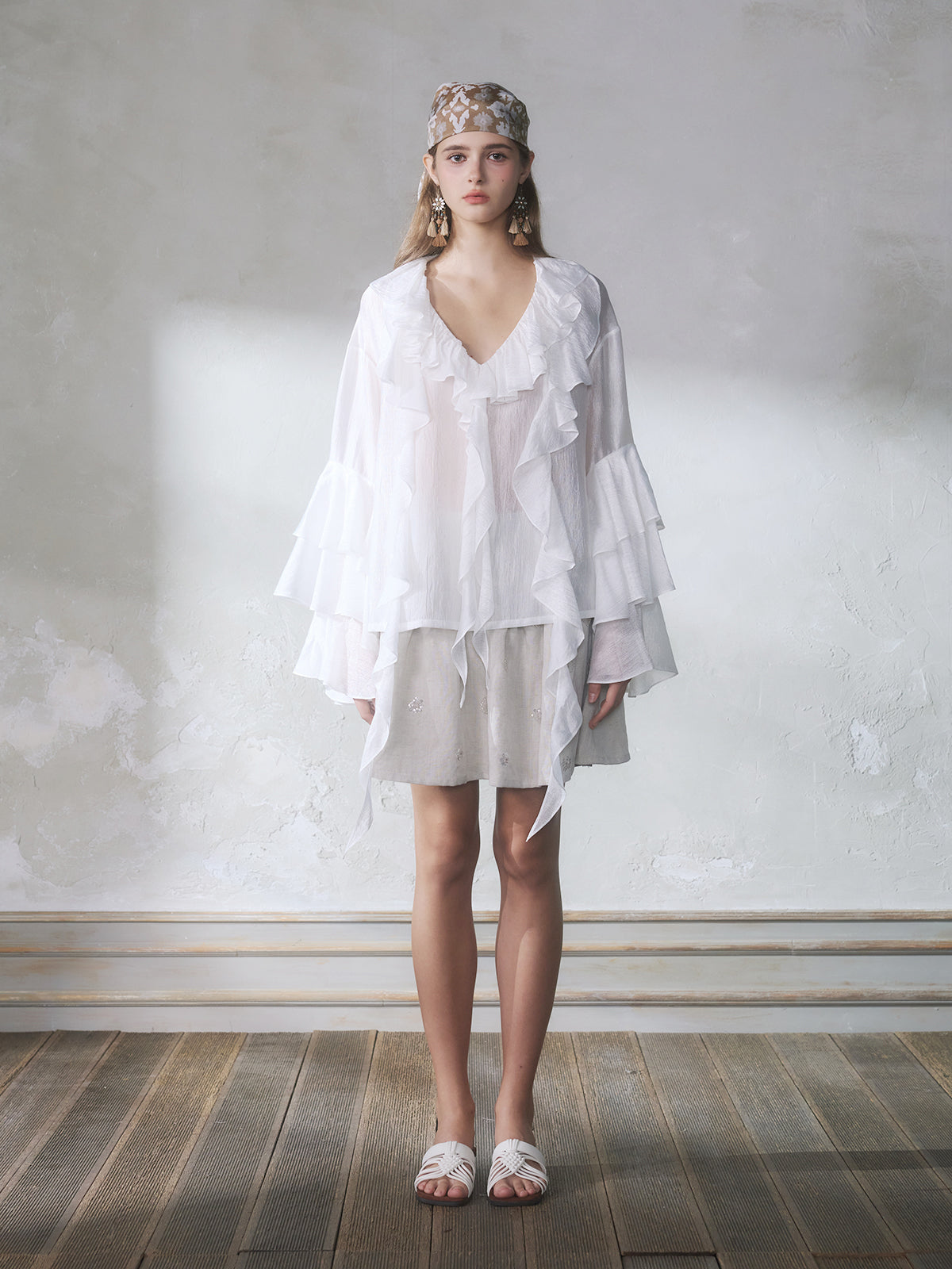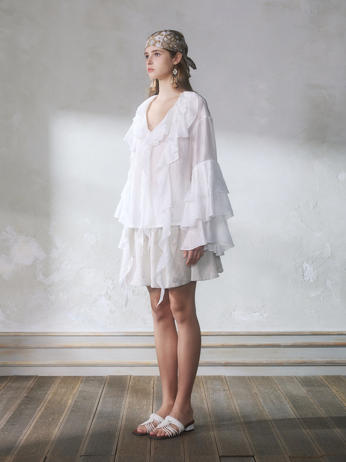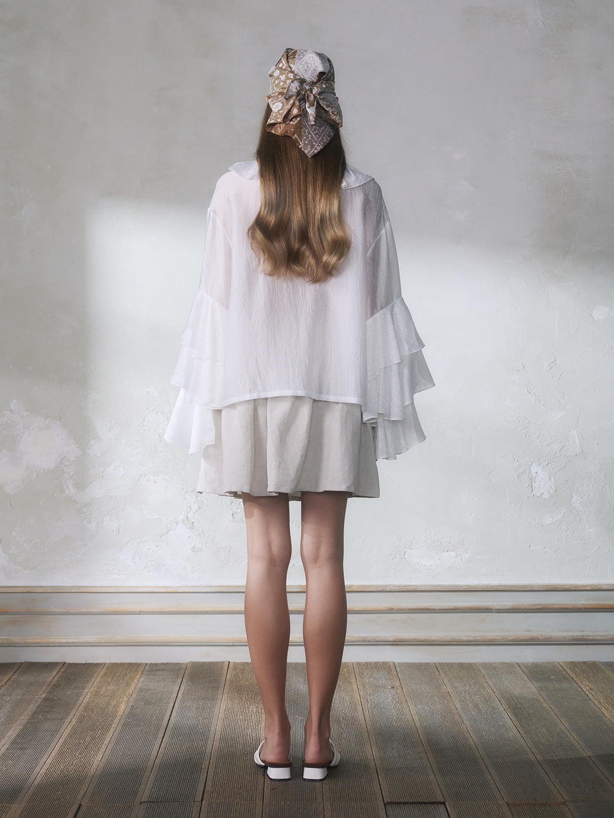 GUOJINGYI White Shimmer Acetate Ruffle Shirt Linen Skirt & Linen Vest Set