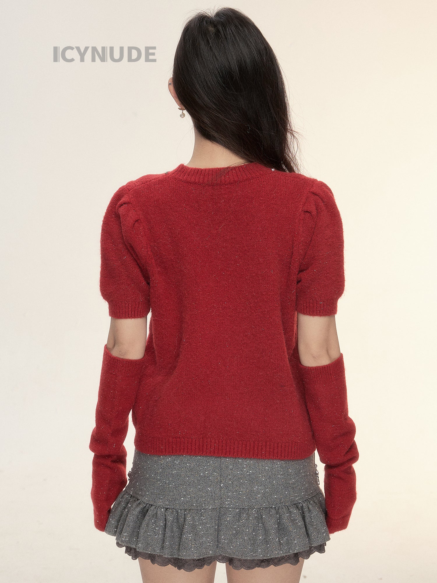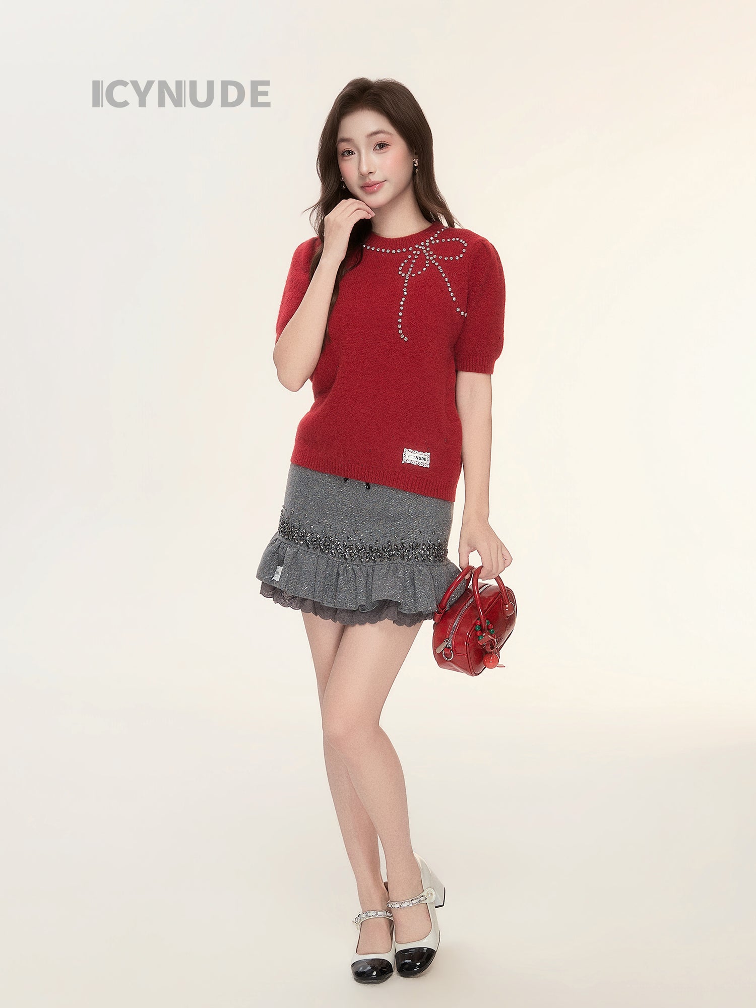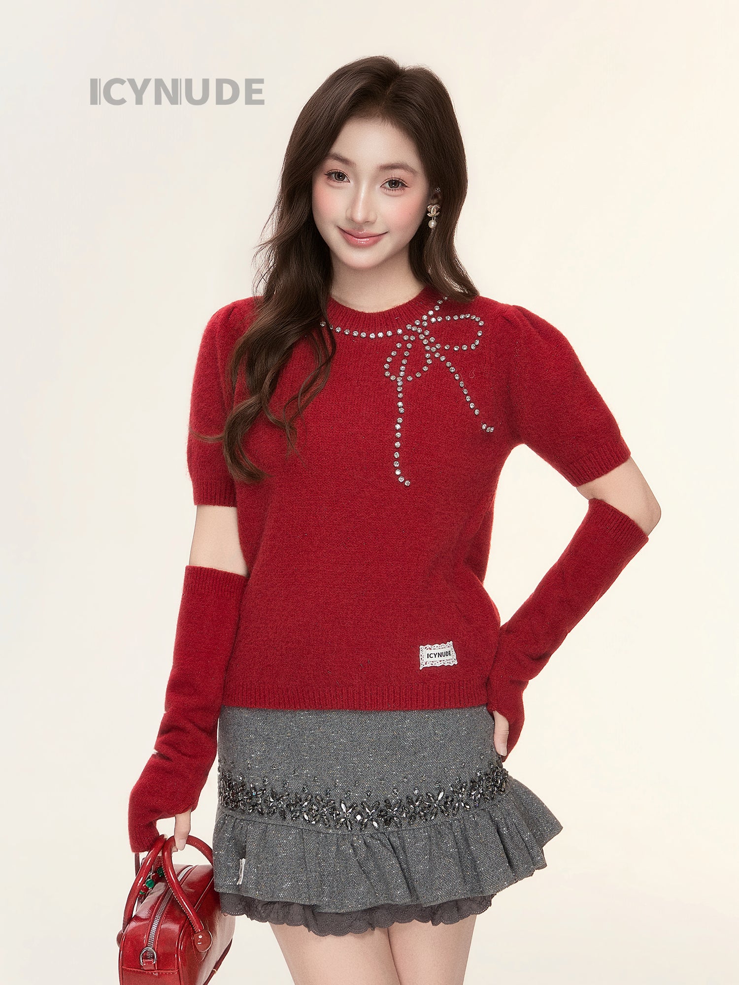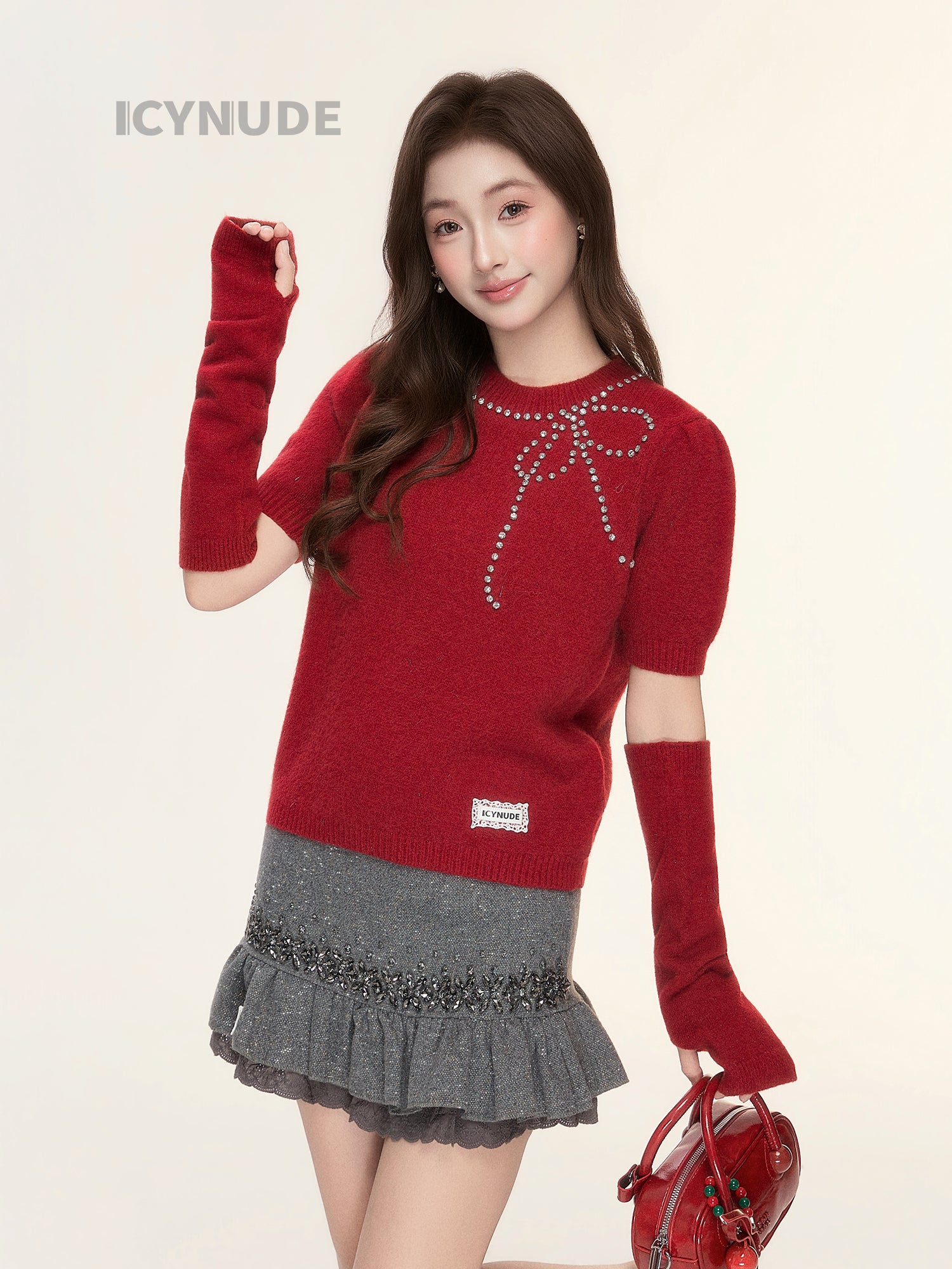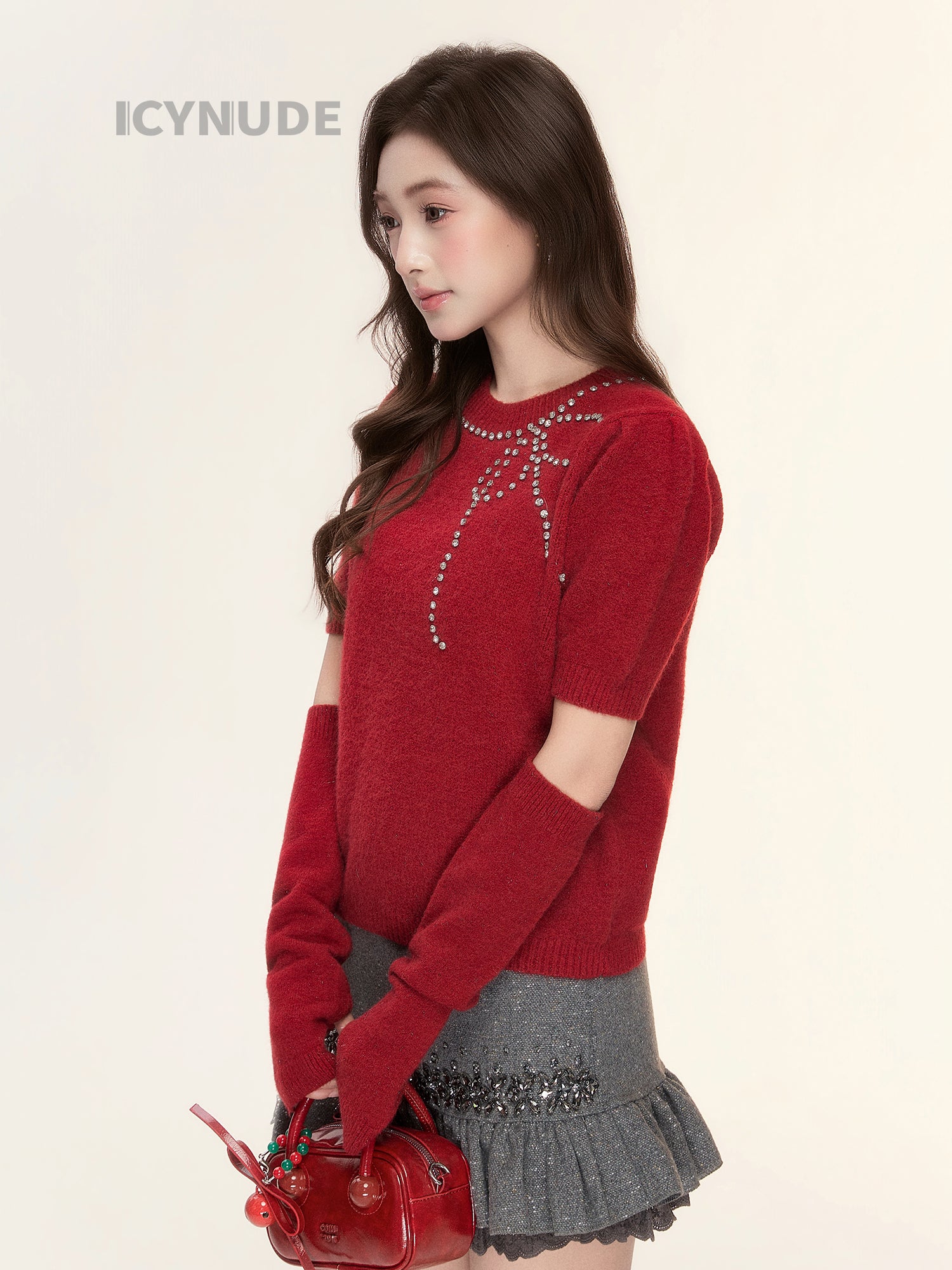 ICY NUDE Bow-Detail Crystal Embellished Sleeve Knit Top