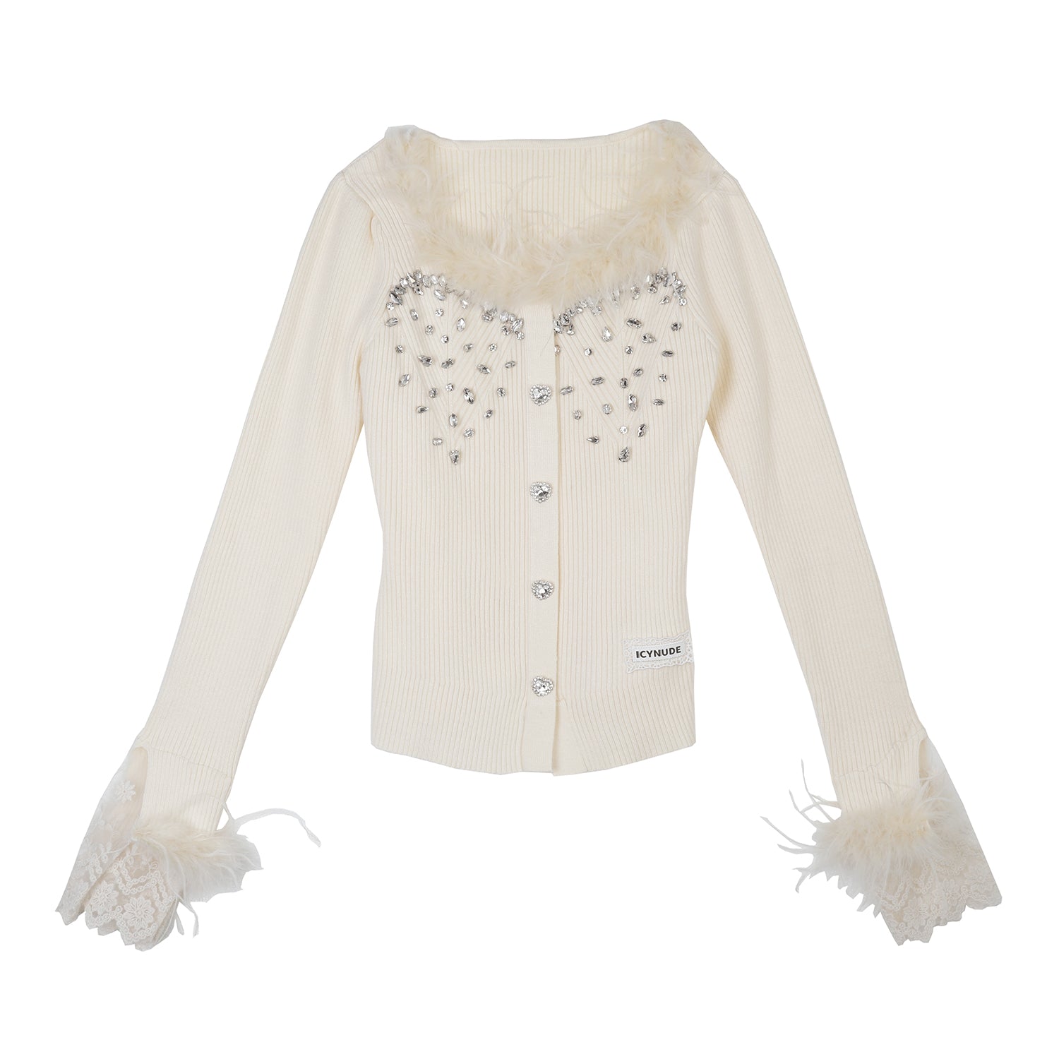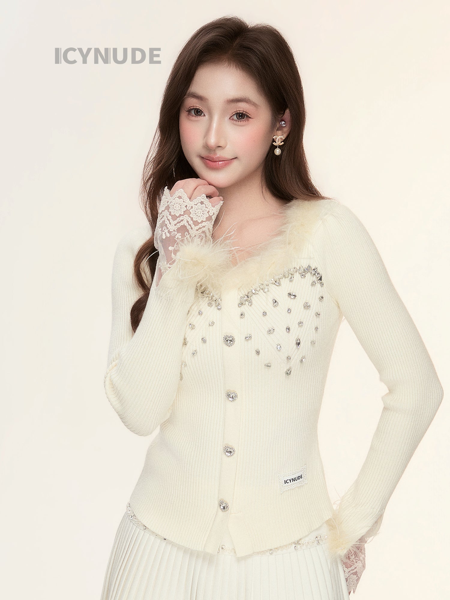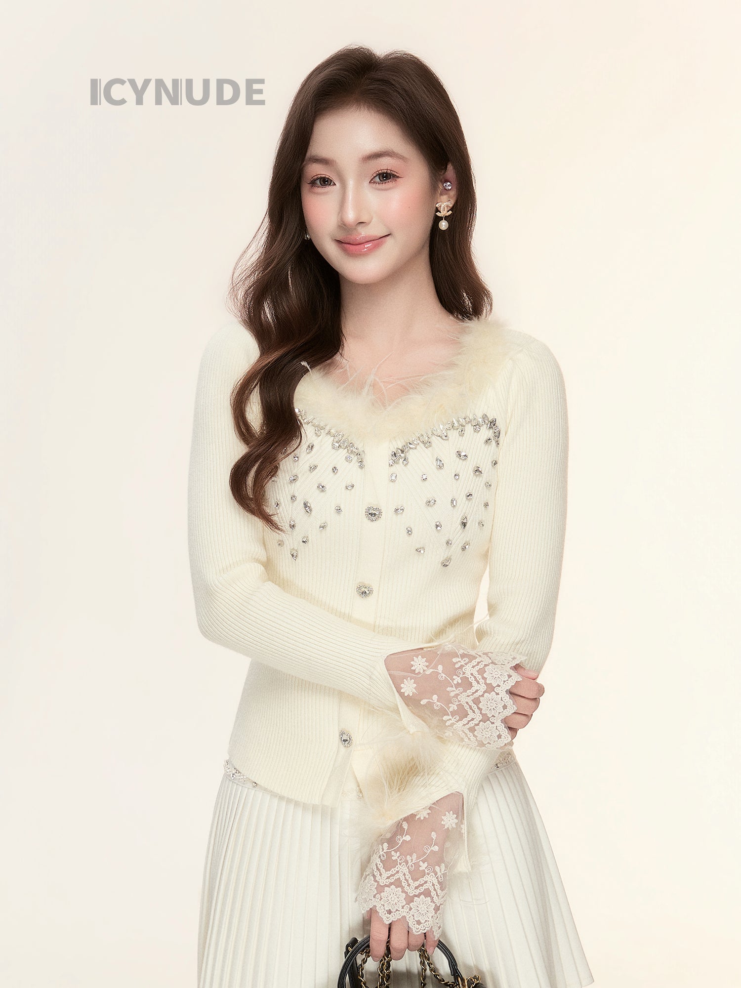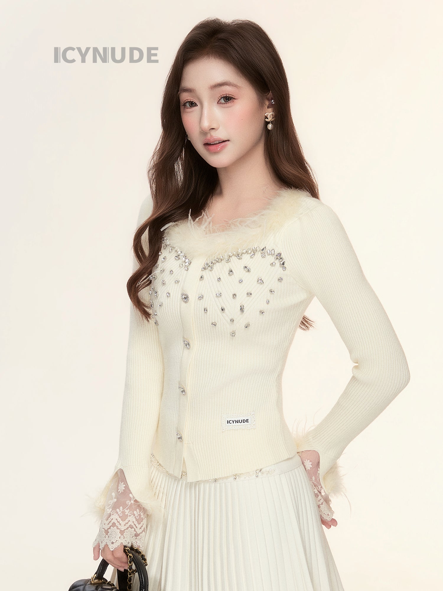 ICY NUDE Fur Collar Crystal-Embellished Knit Top