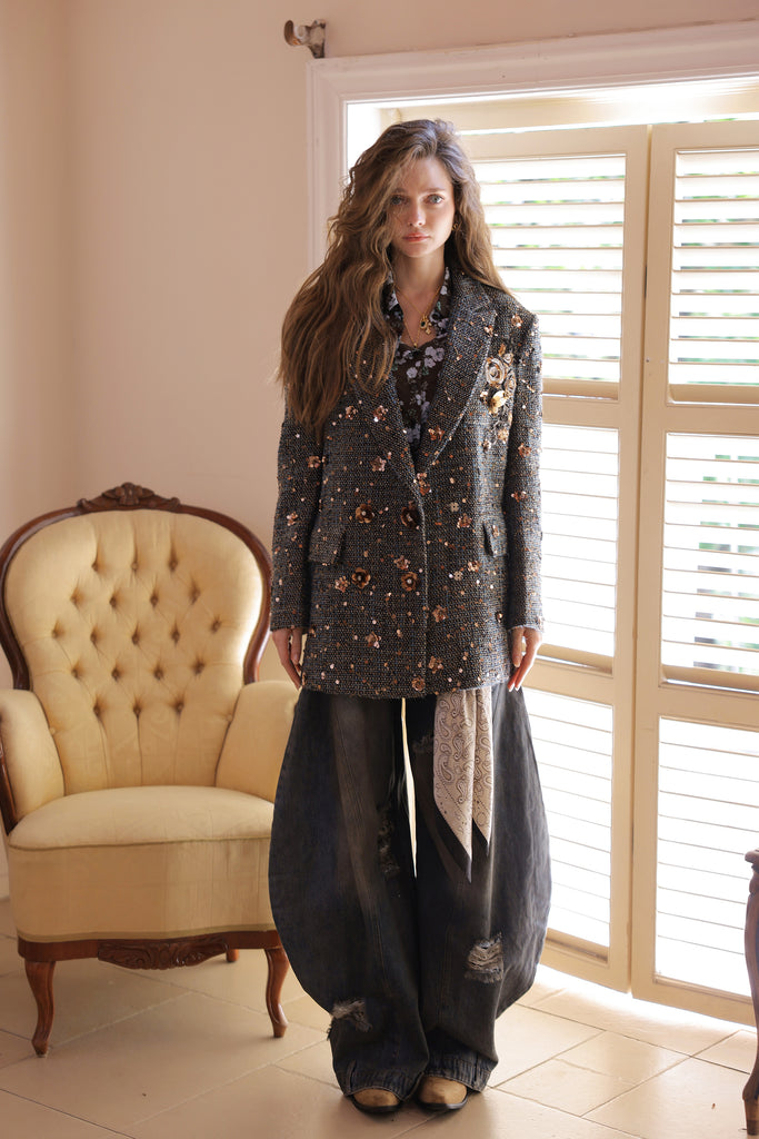 ROCHA ROMA Sequin Tweed Jacket+Floral Belt Jeans