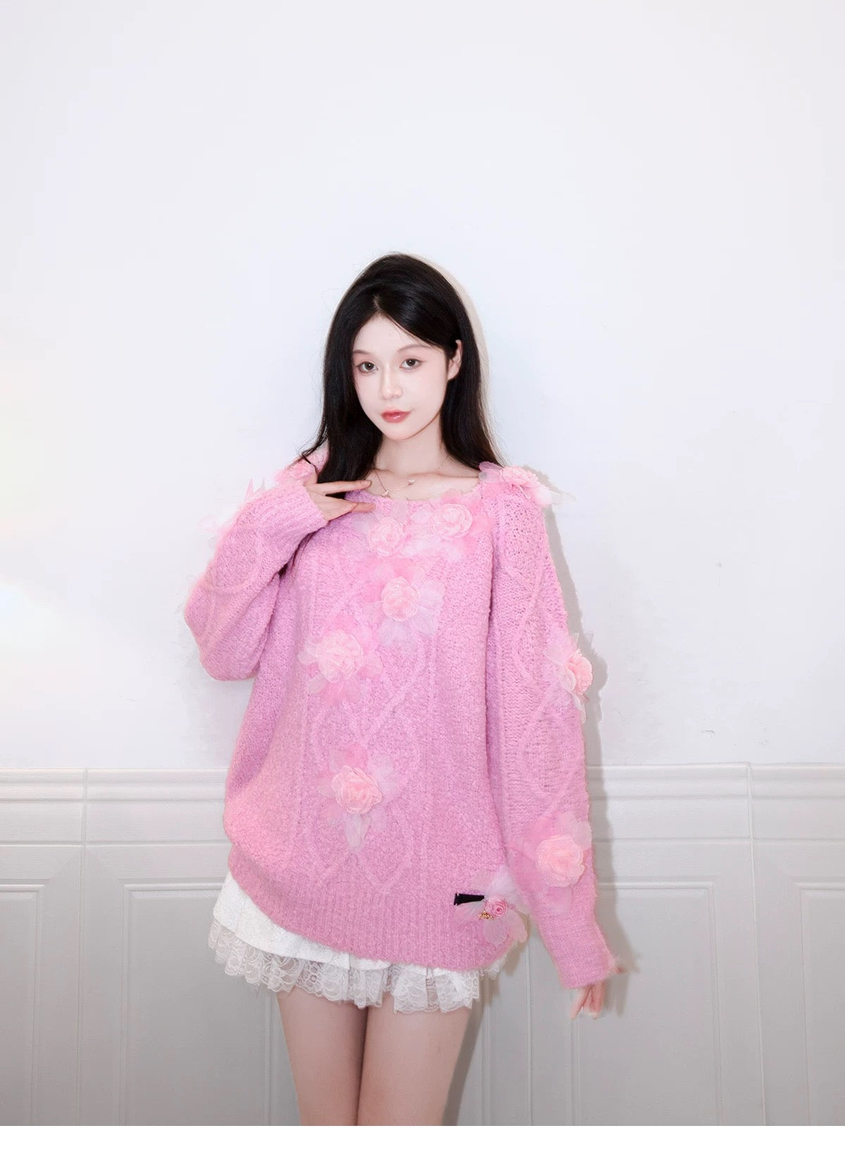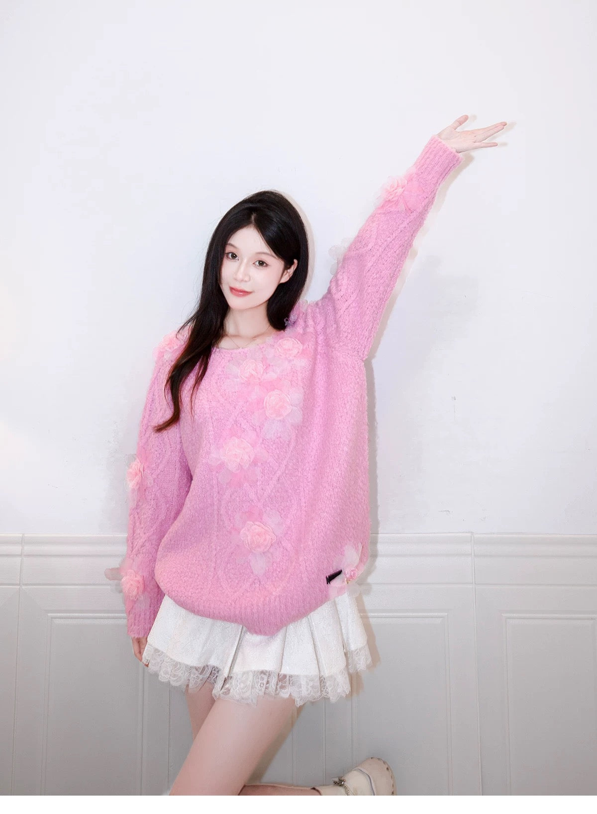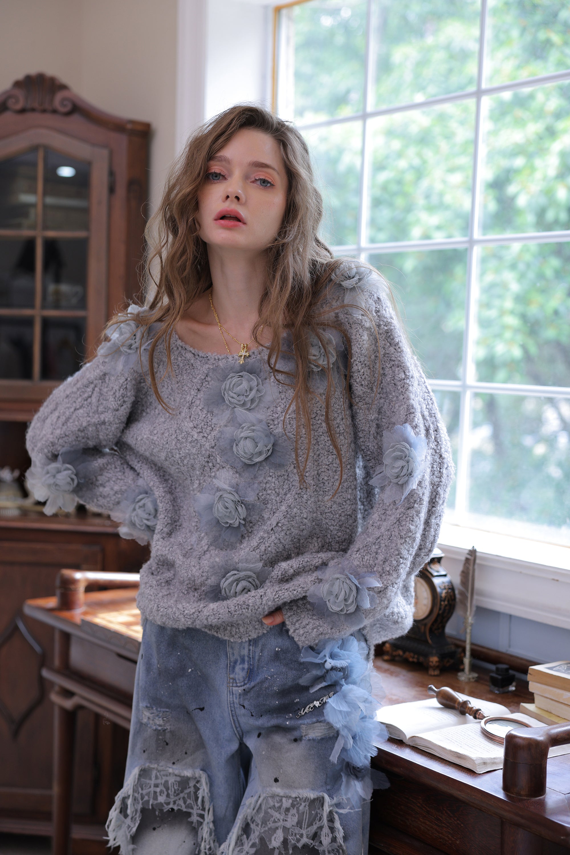 AKEMO Embossed Floral Pullover Sweater (Grey) (Pink)