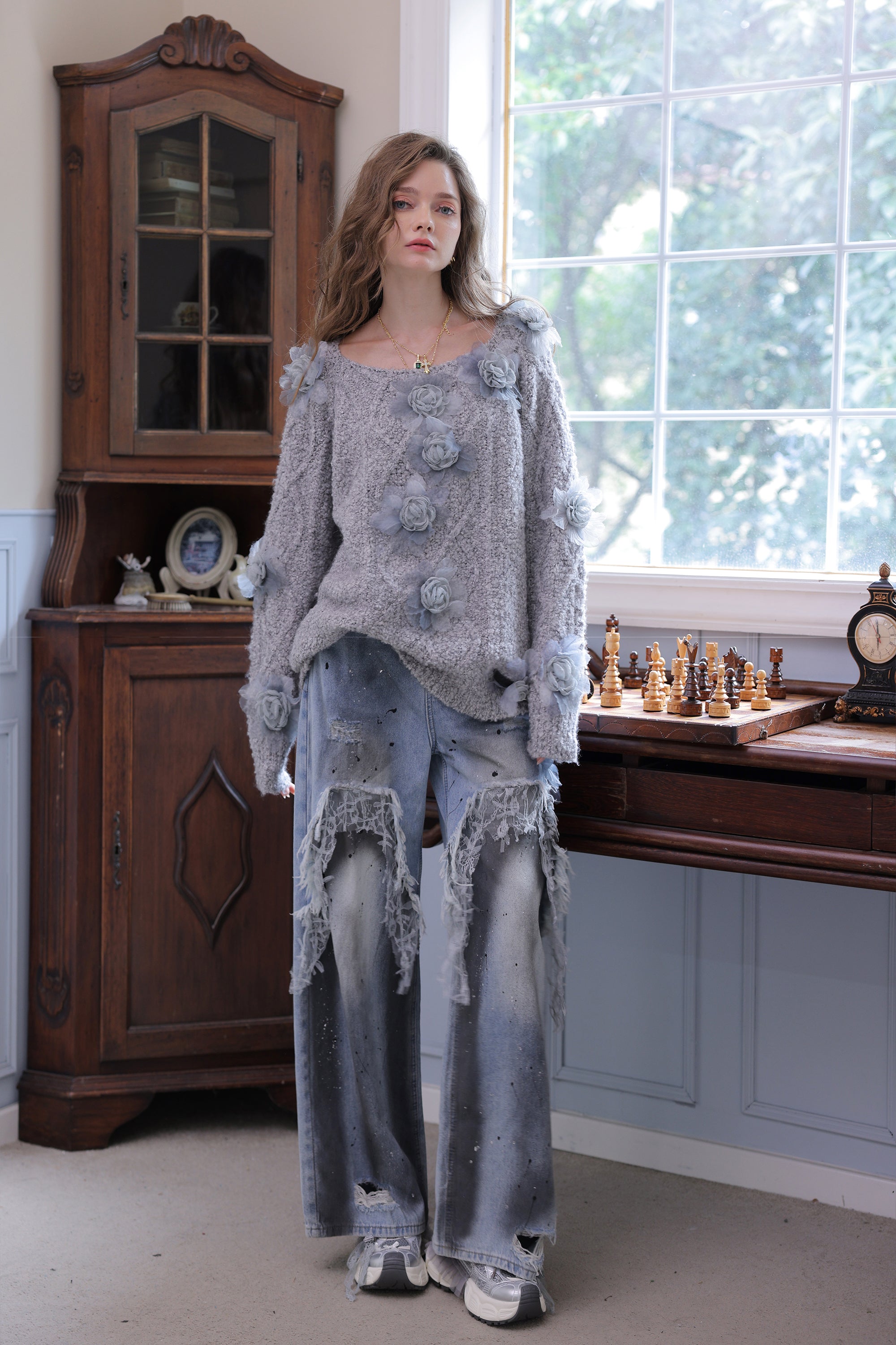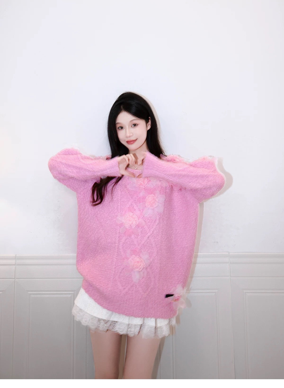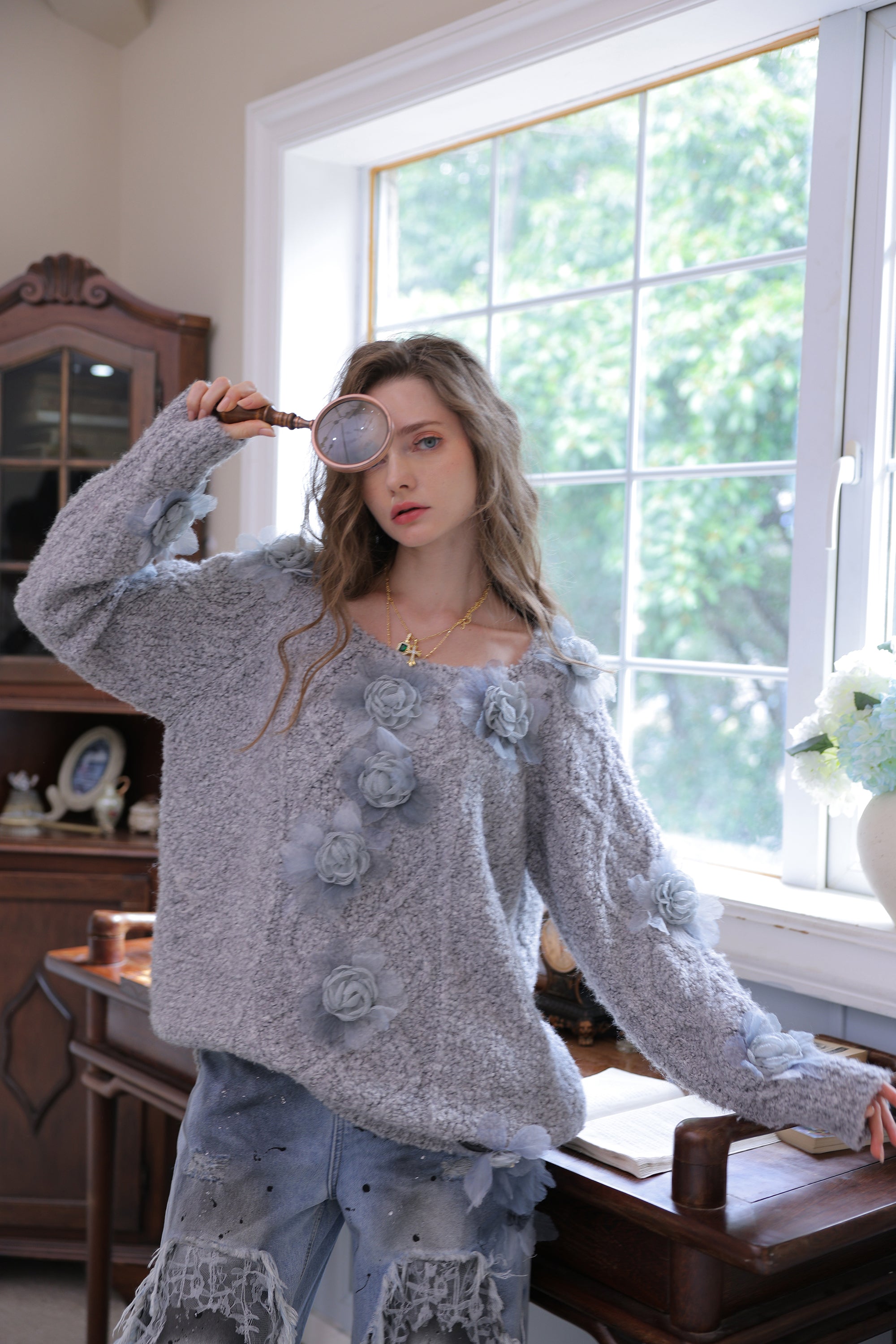 AKEMO Embossed Floral Pullover Sweater (Grey) (Pink)