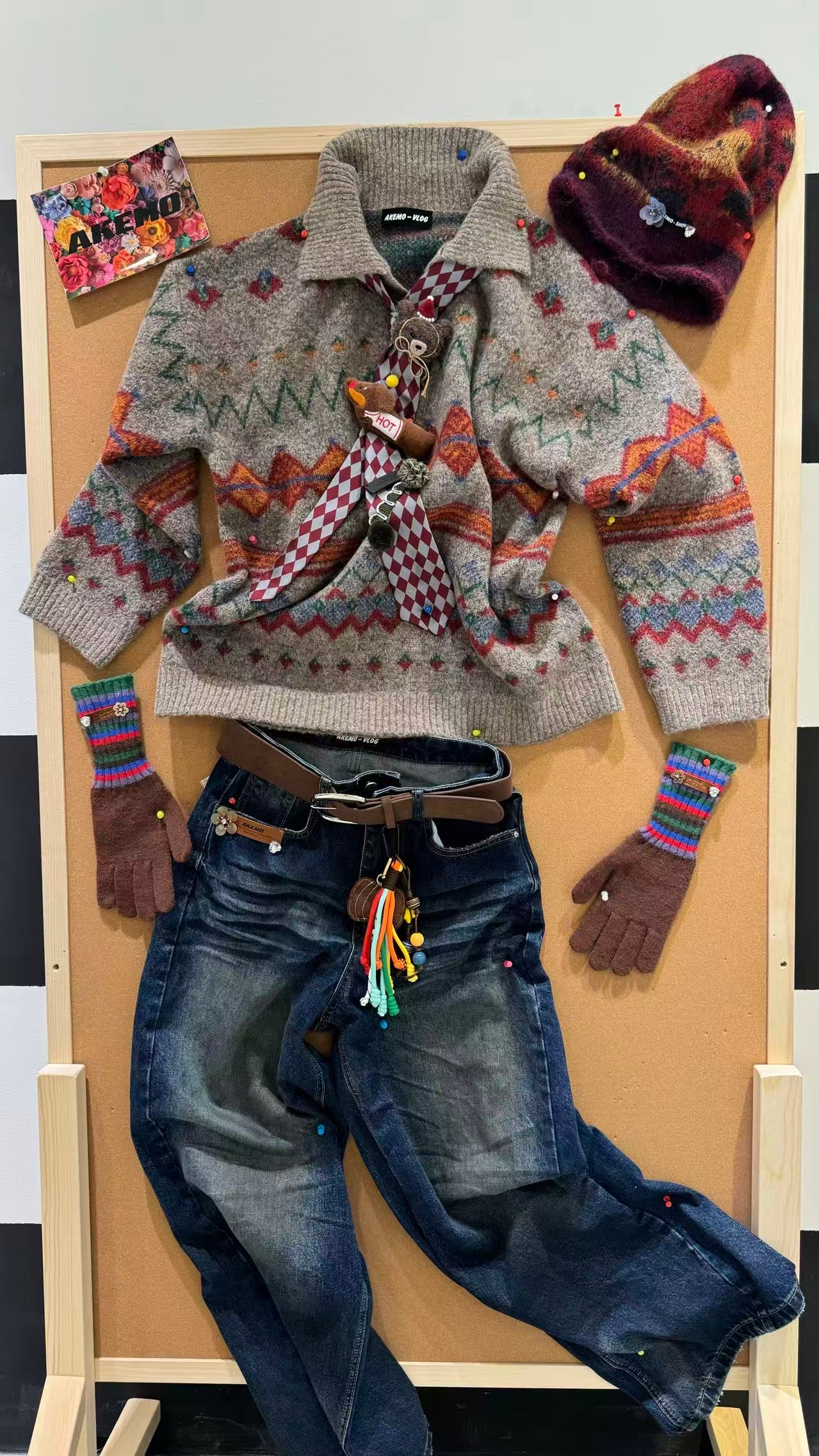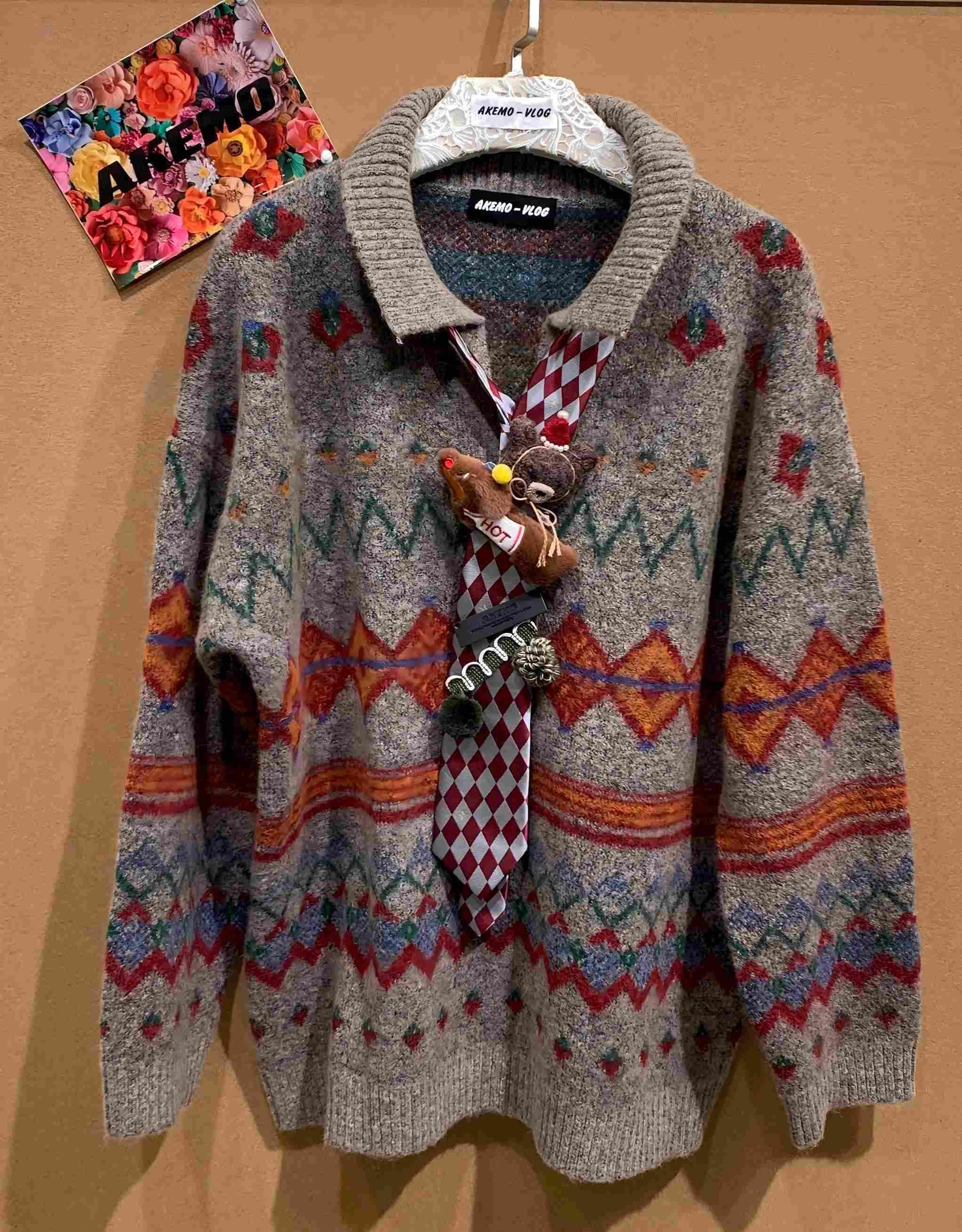 AKEMO Plush Toy Sweater(BROWN) + Retro Preppyl Jeans