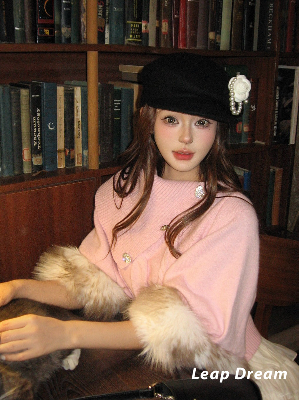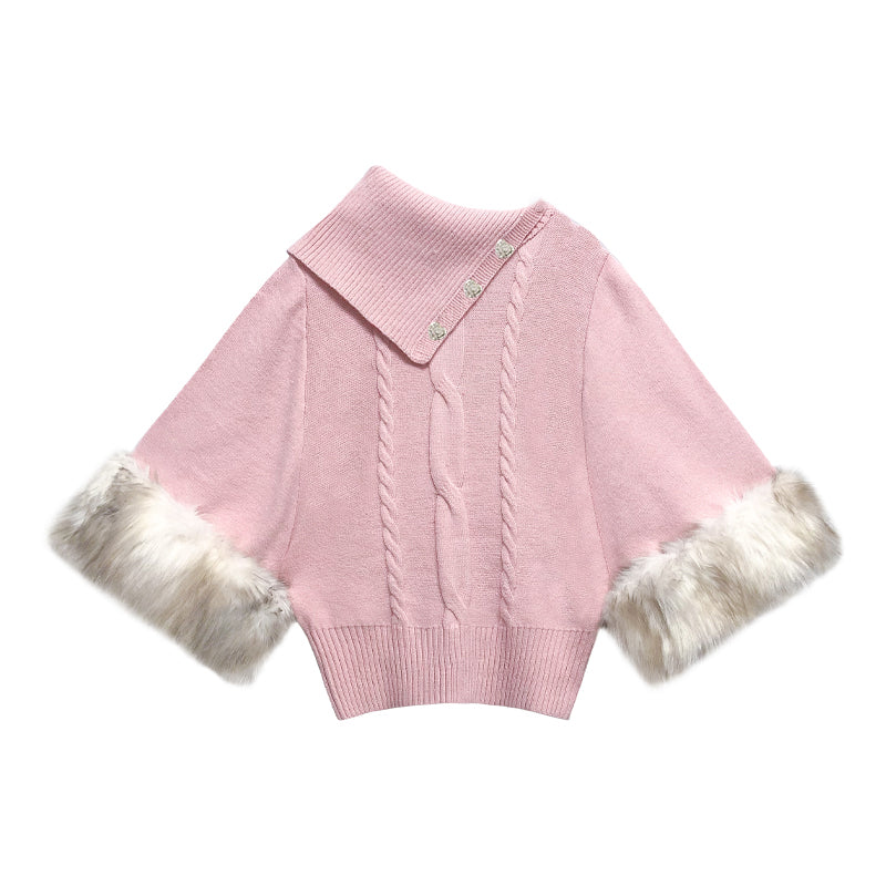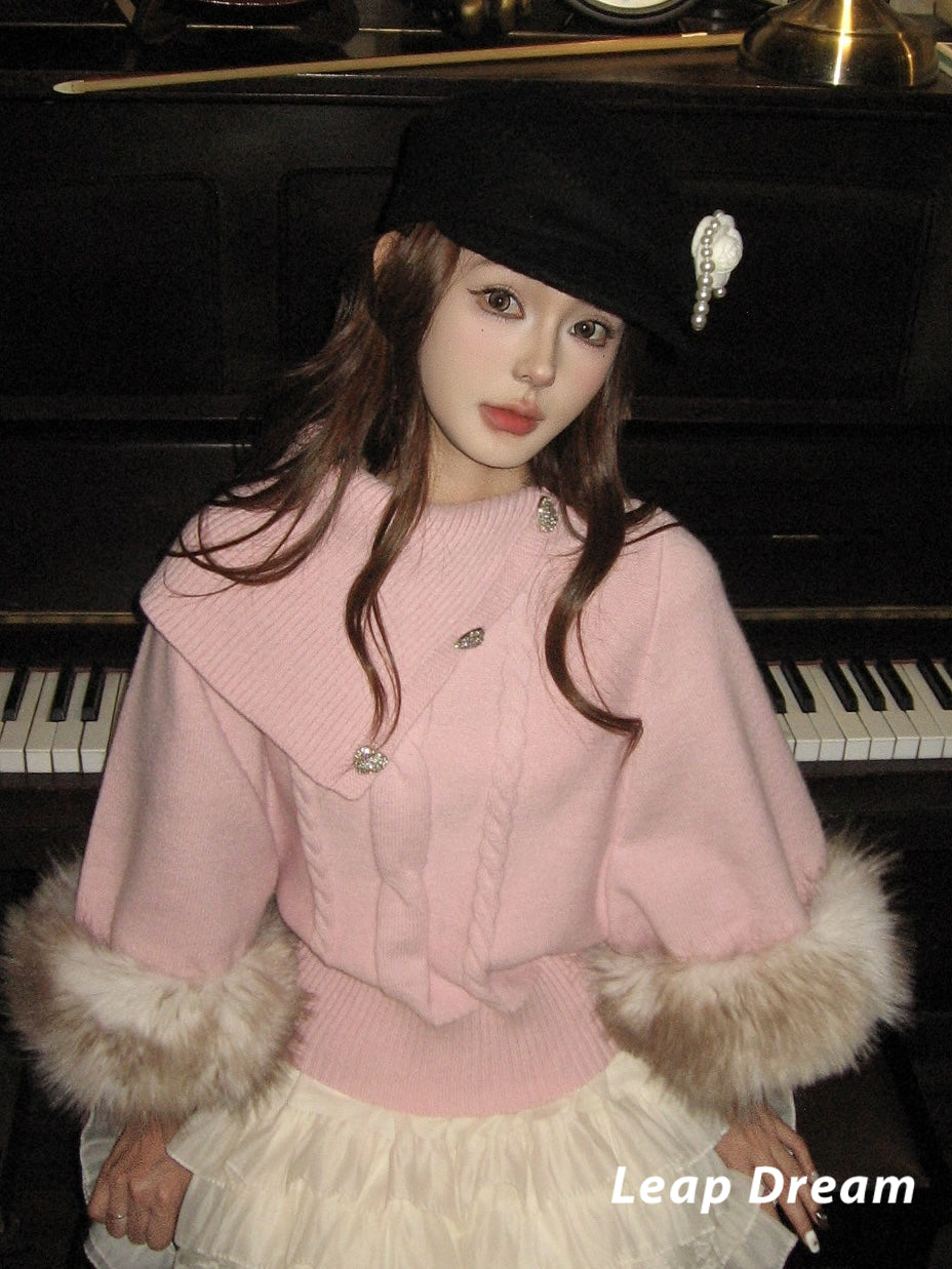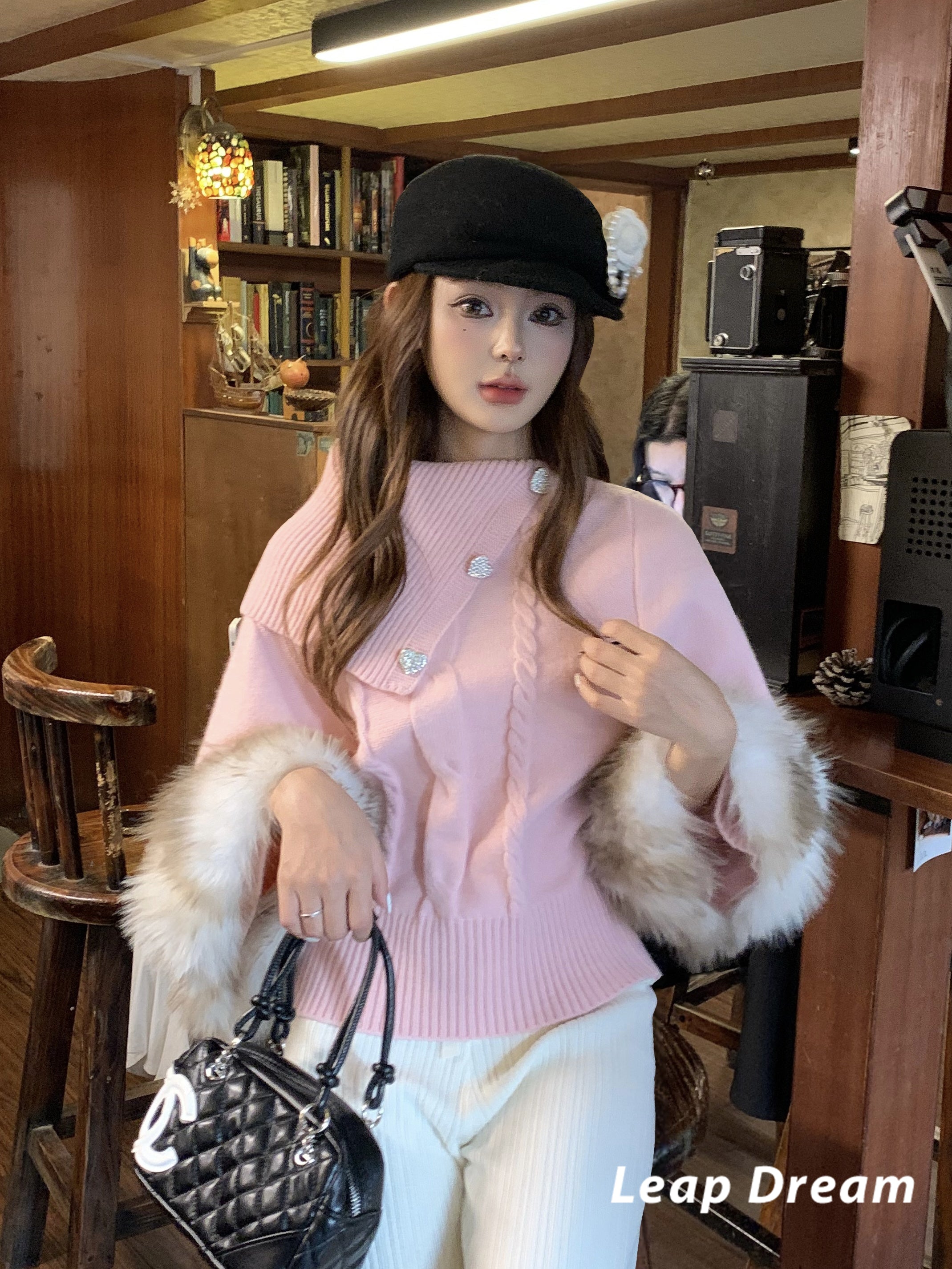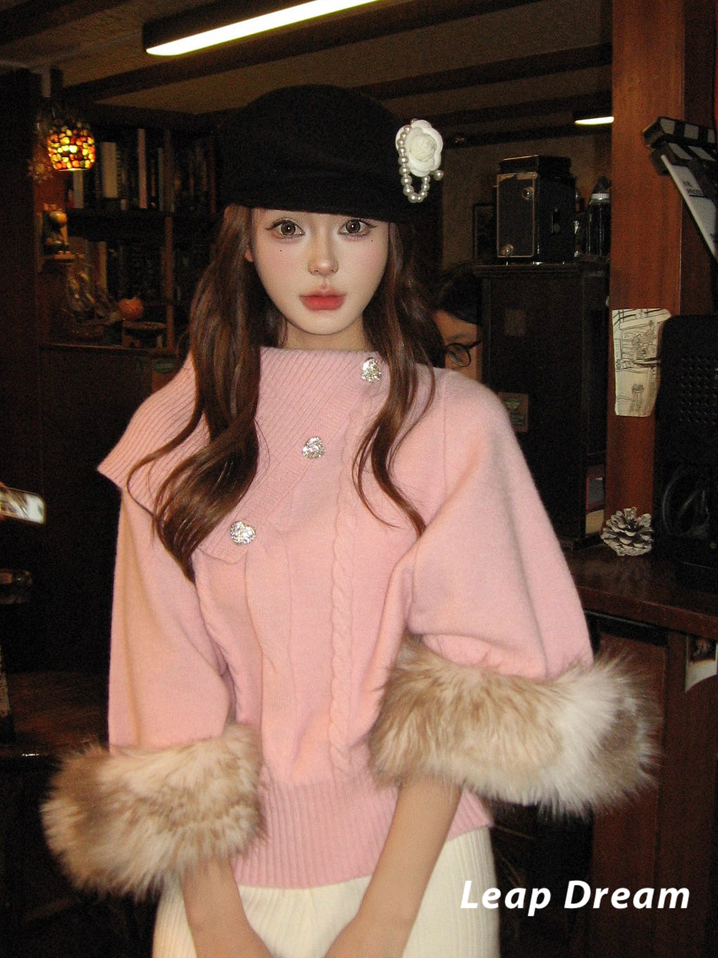 LEAPDREAM Crystal Button Furry Sleeves Knit Sweater