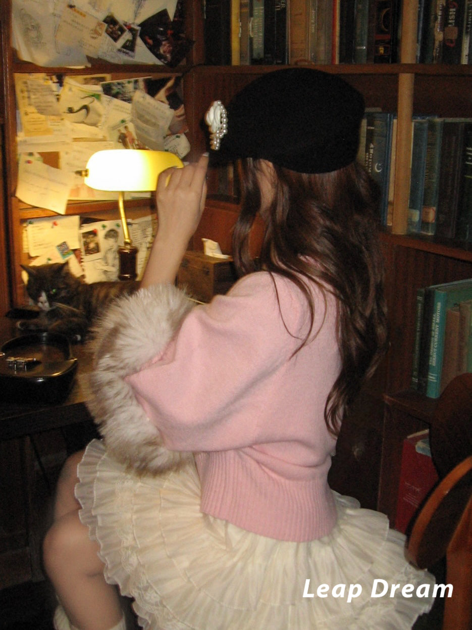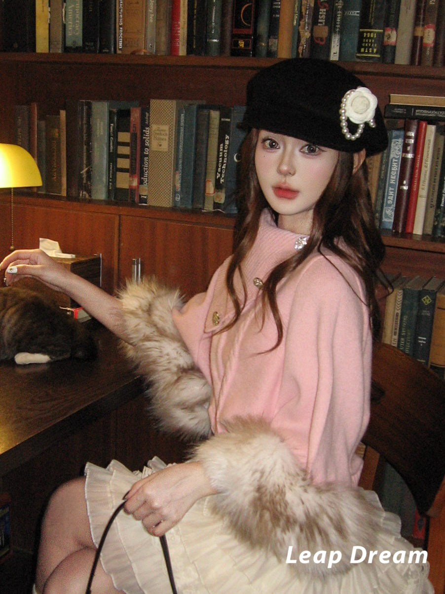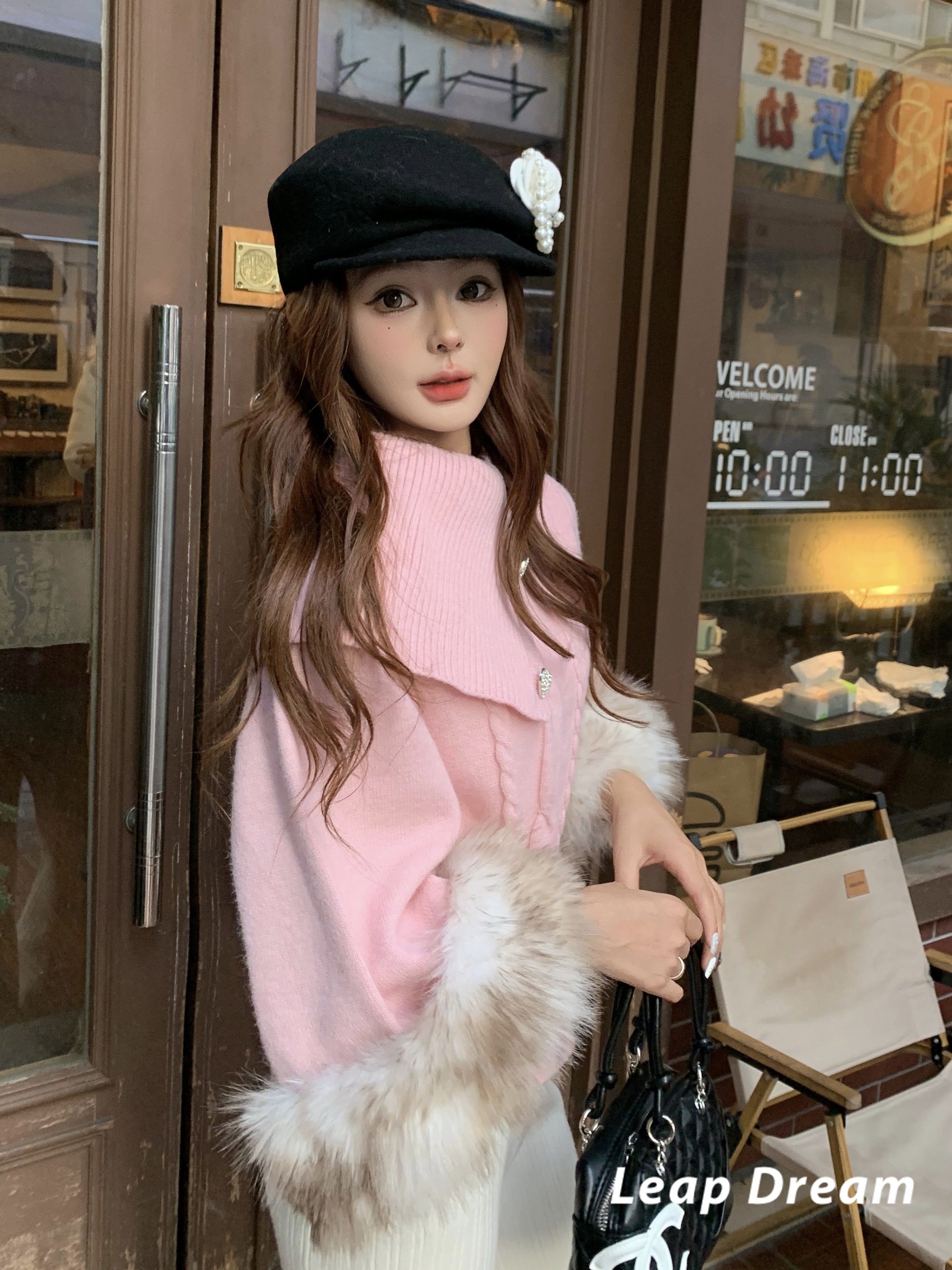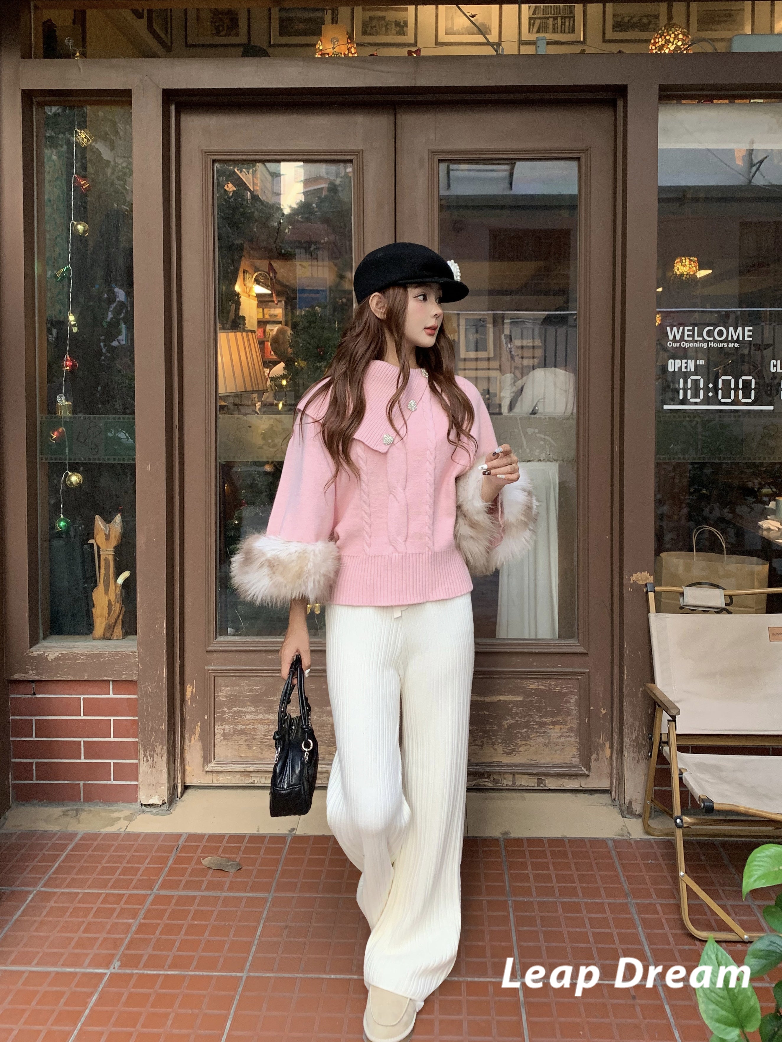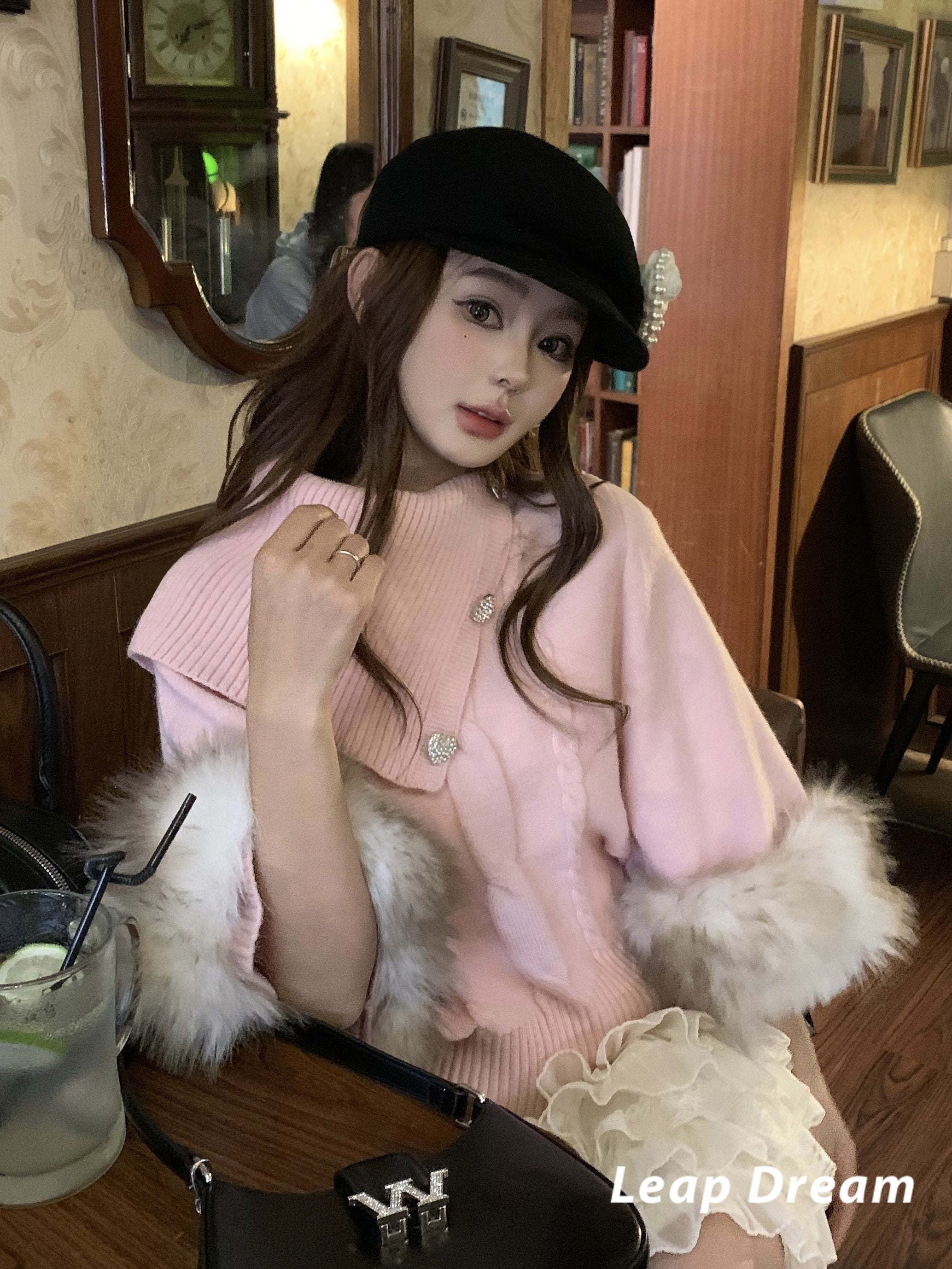 LEAPDREAM Crystal Button Furry Sleeves Knit Sweater