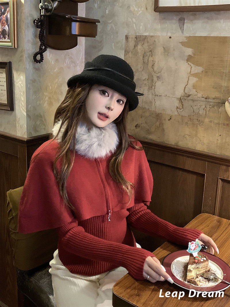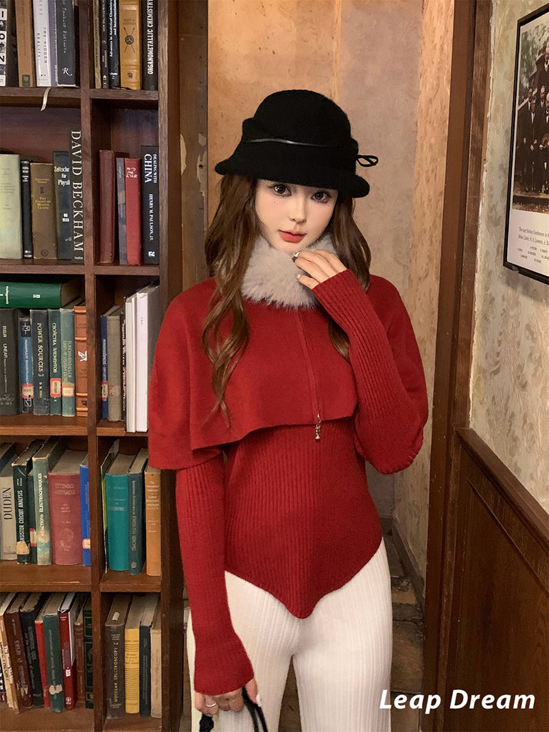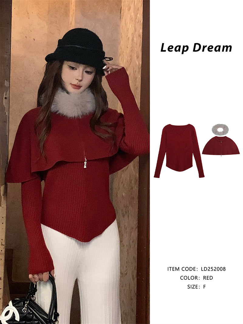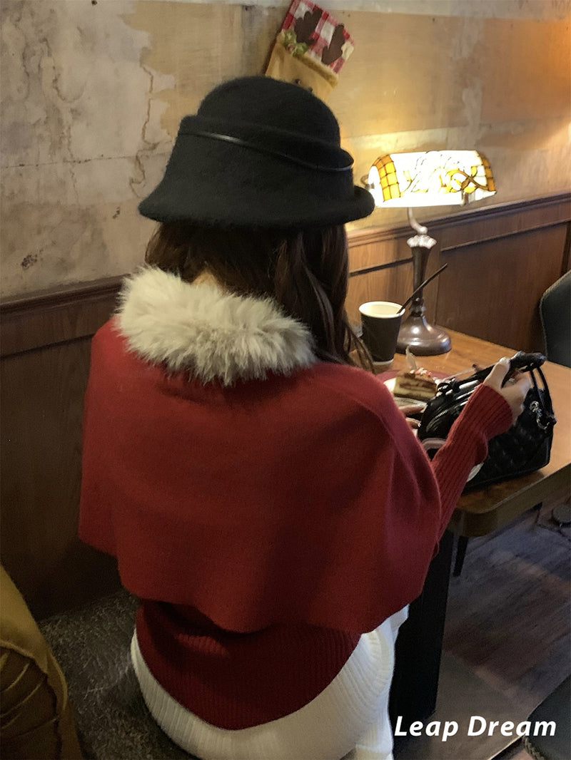 LEAPDREAM Fur Collar Cape Shawl Knit Three-Piece Set
