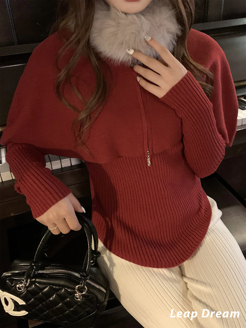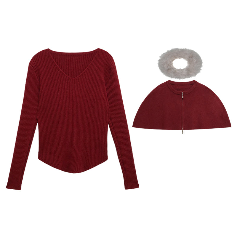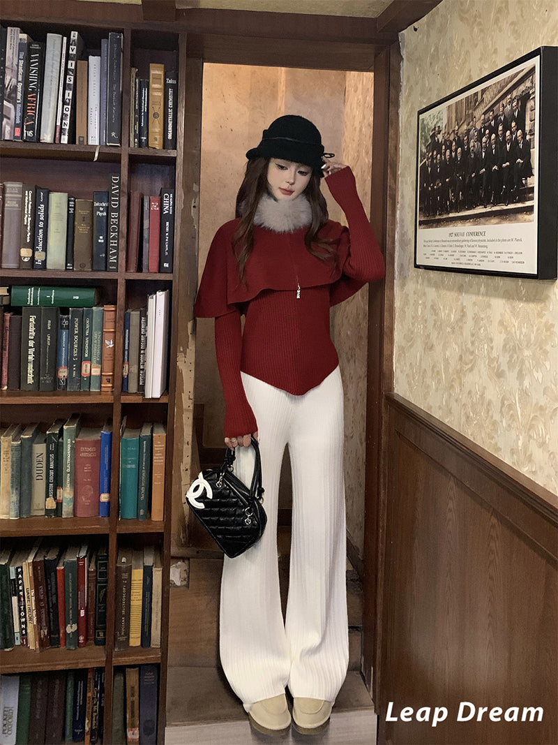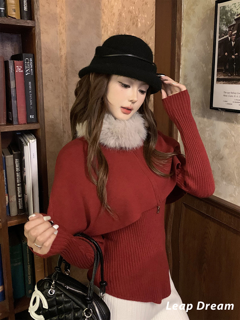 LEAPDREAM Fur Collar Cape Shawl Knit Three-Piece Set