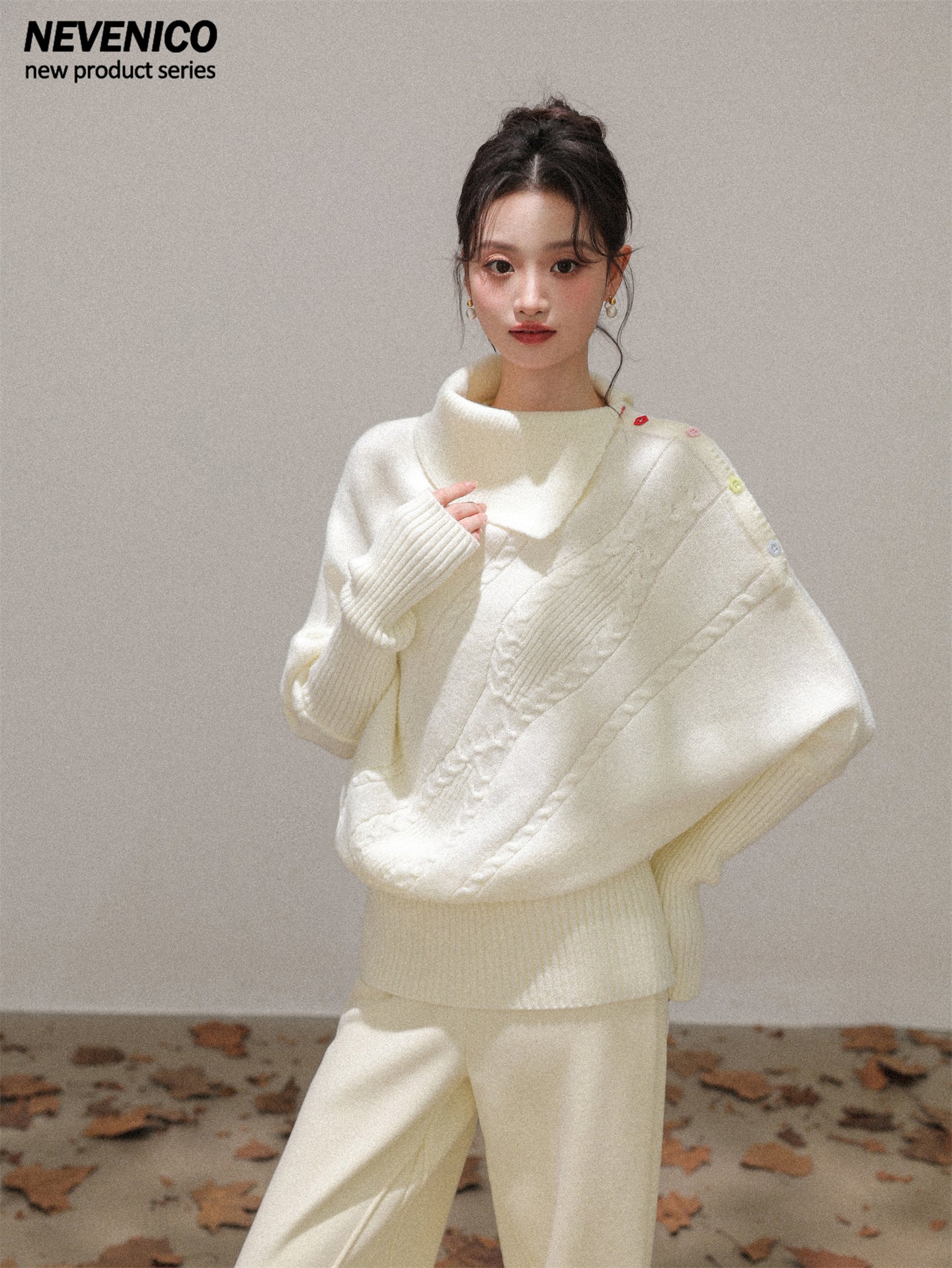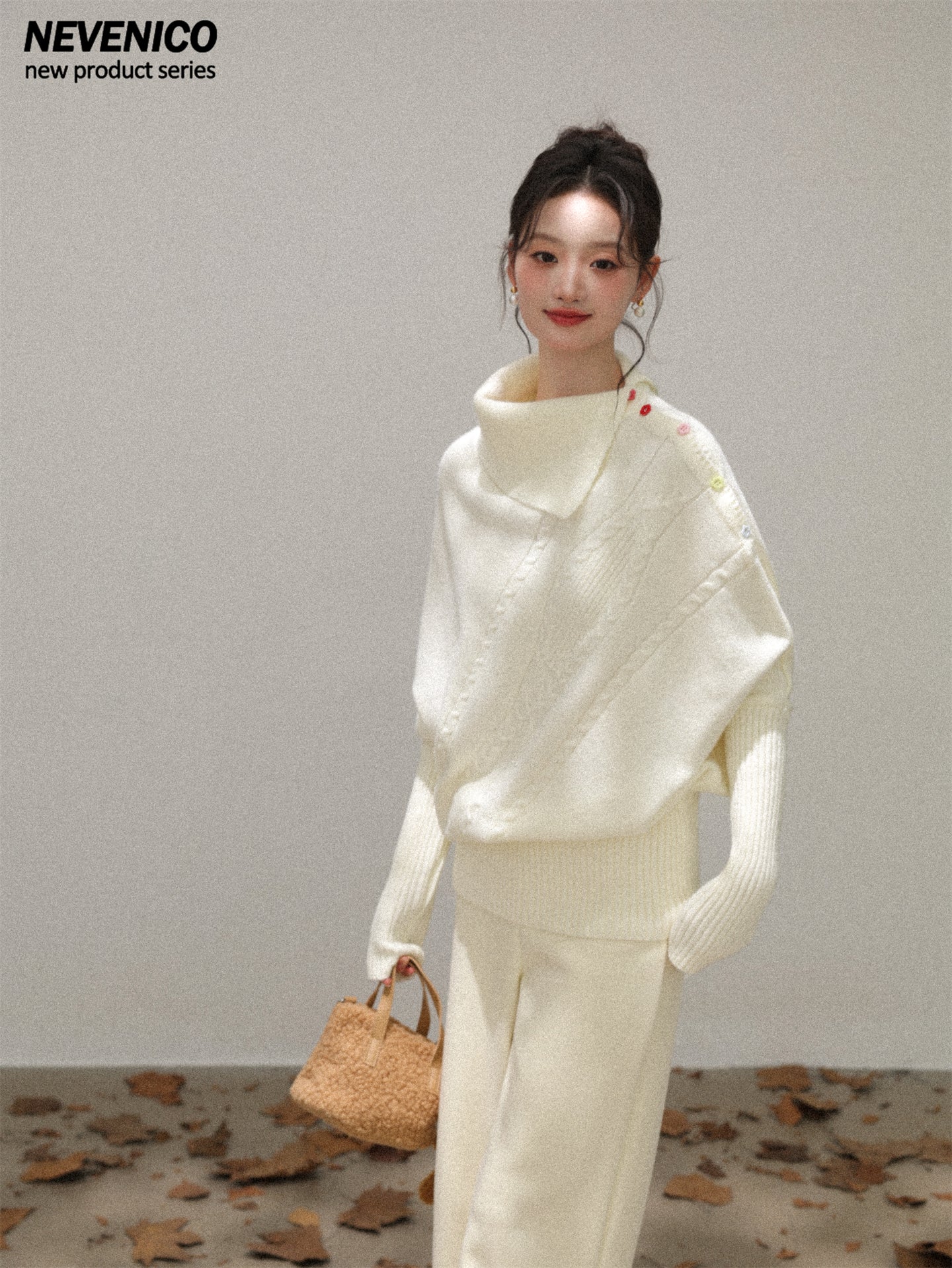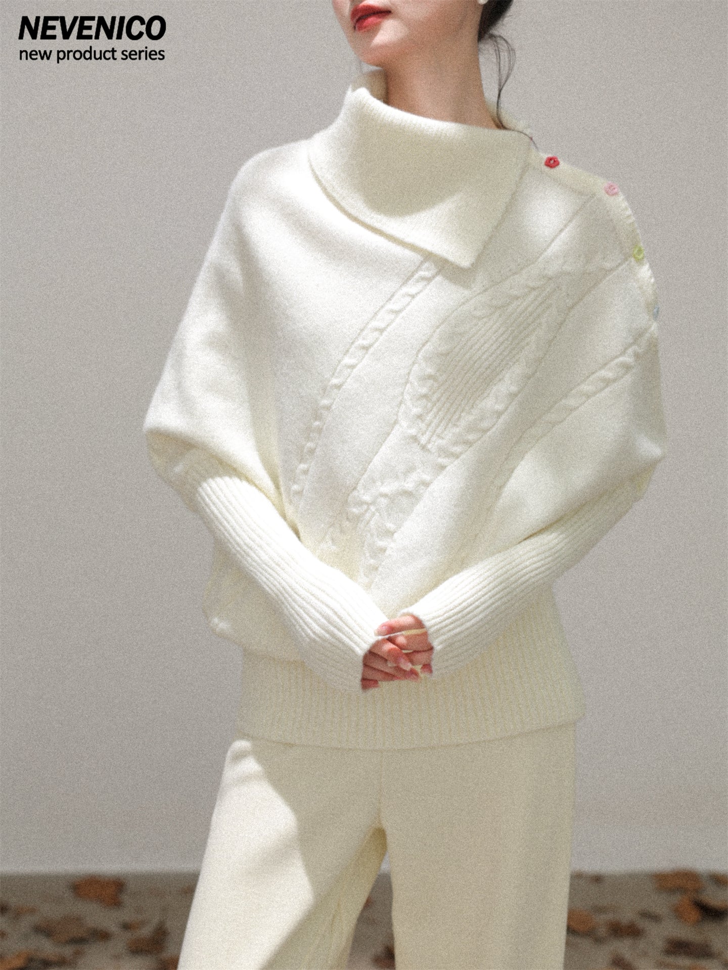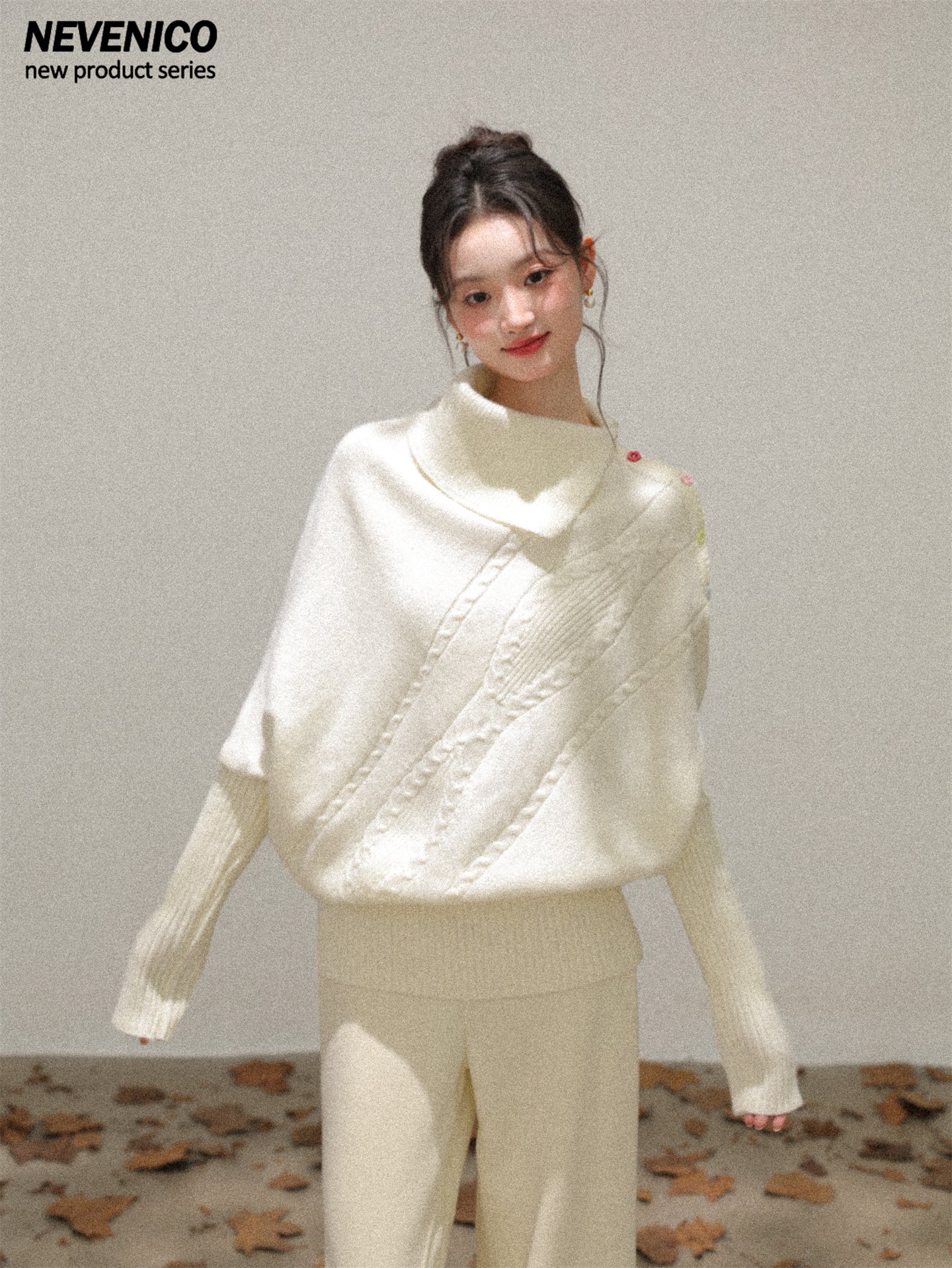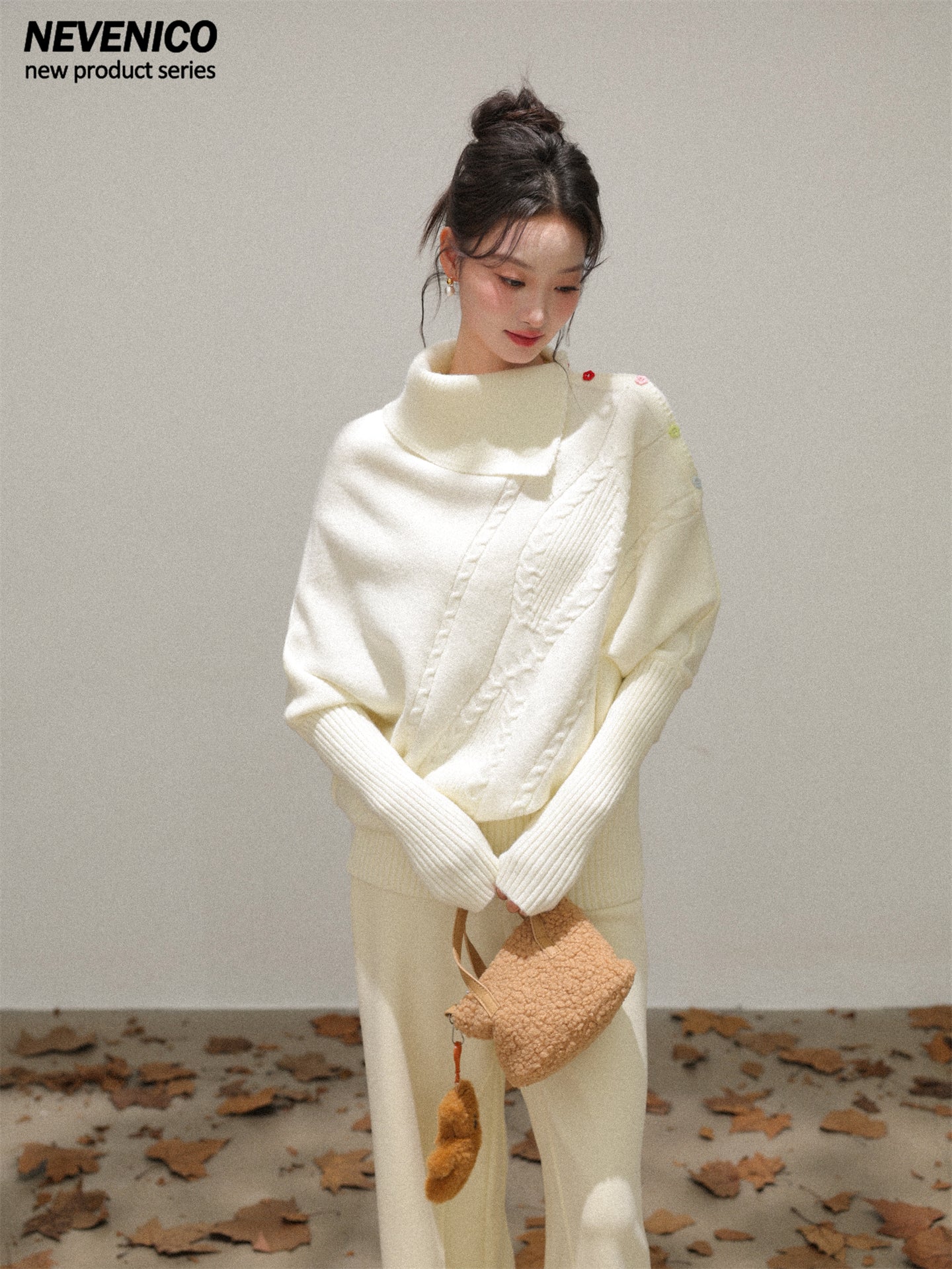 NEVENICO Cable-Knit Turtleneck Cape Sweater