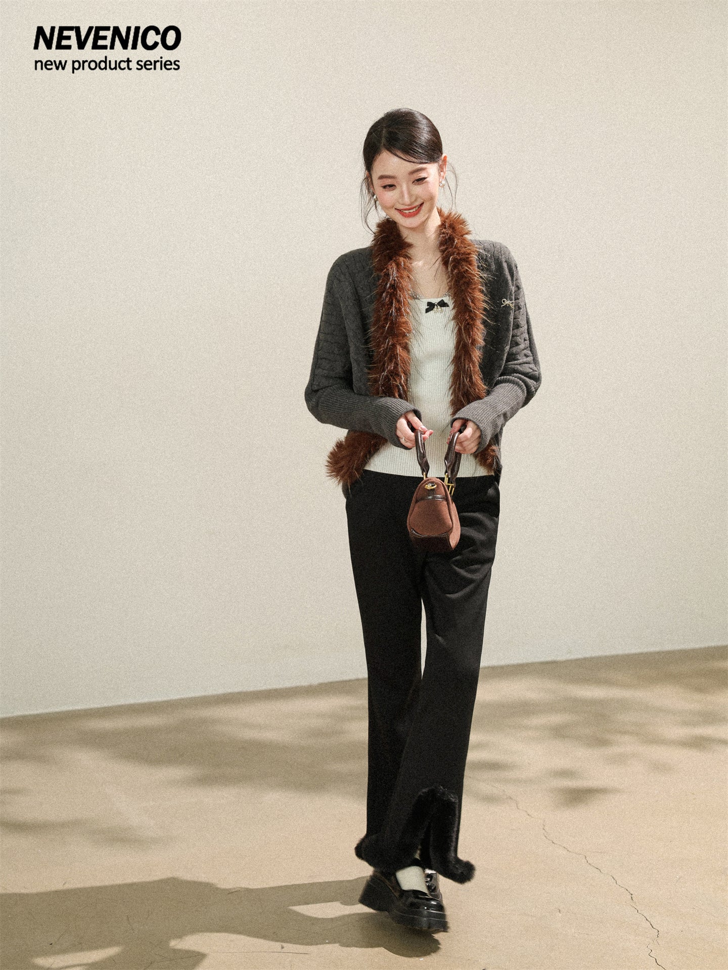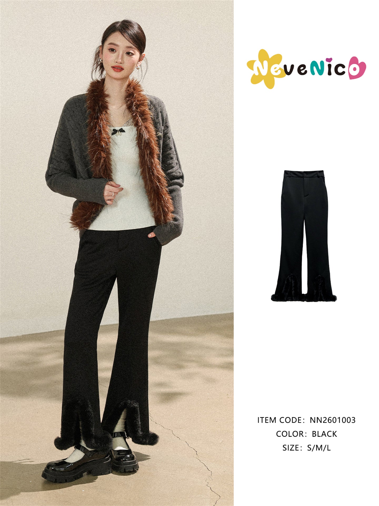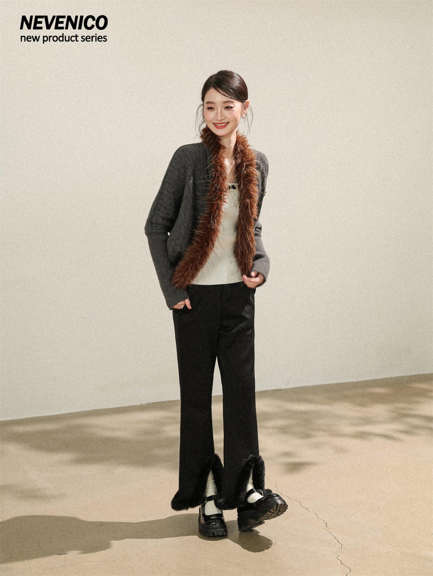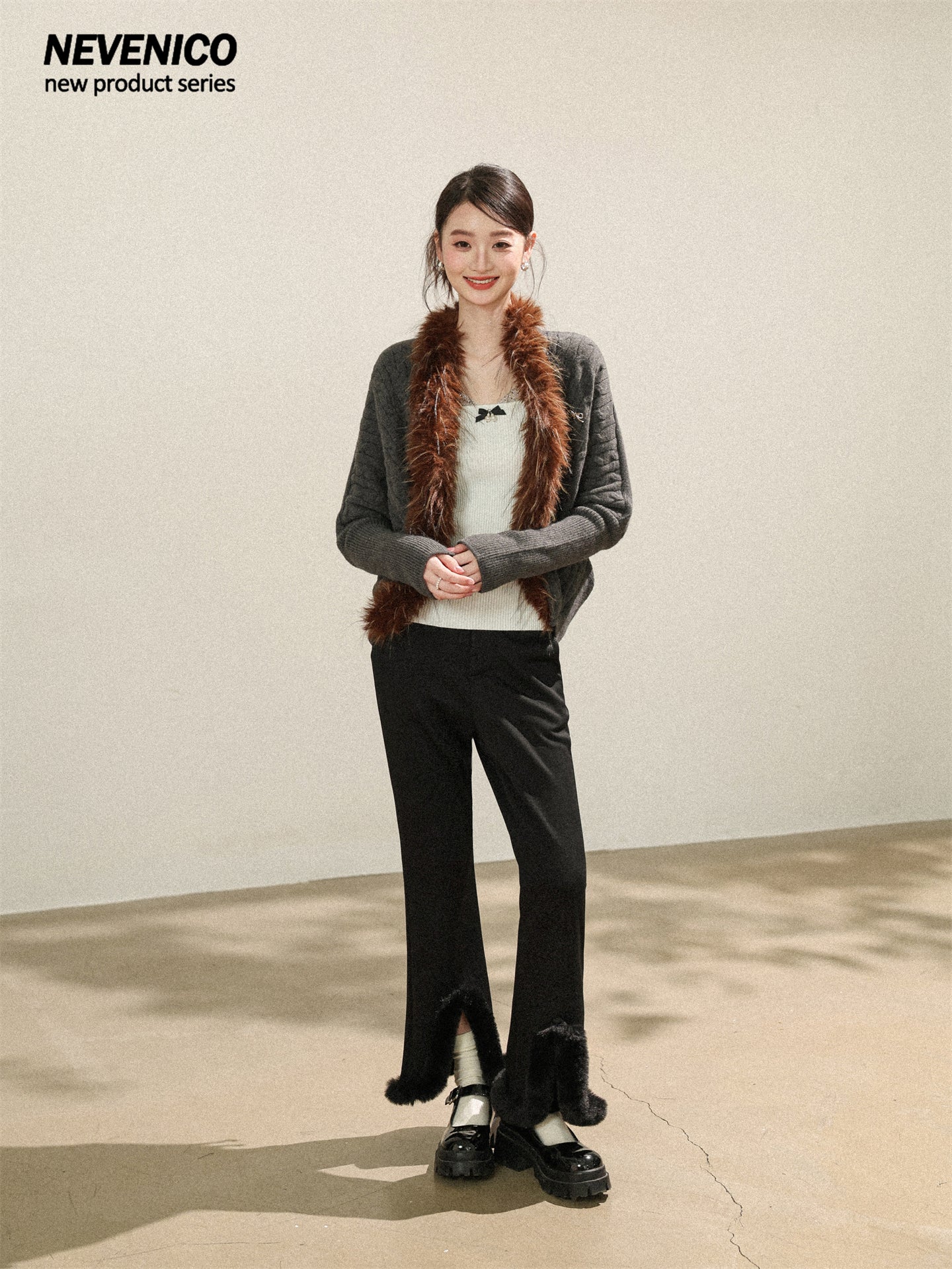 NEVENICO Fleece Lined Furry Panel Slit Pants