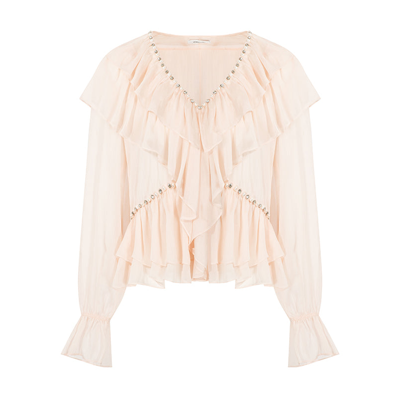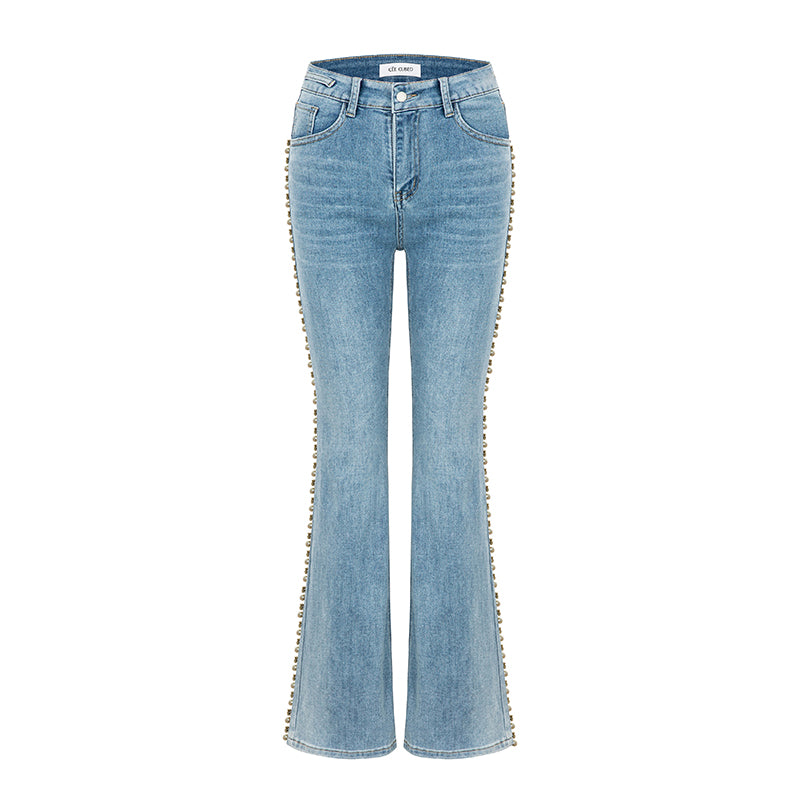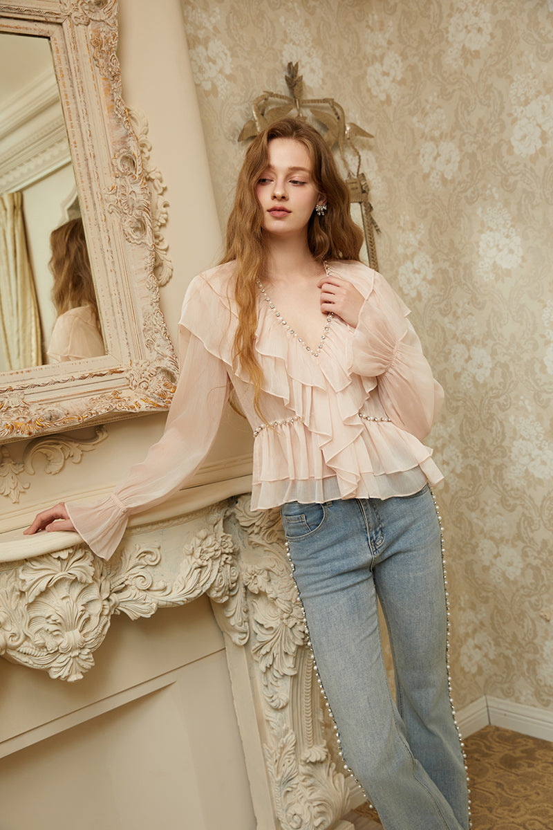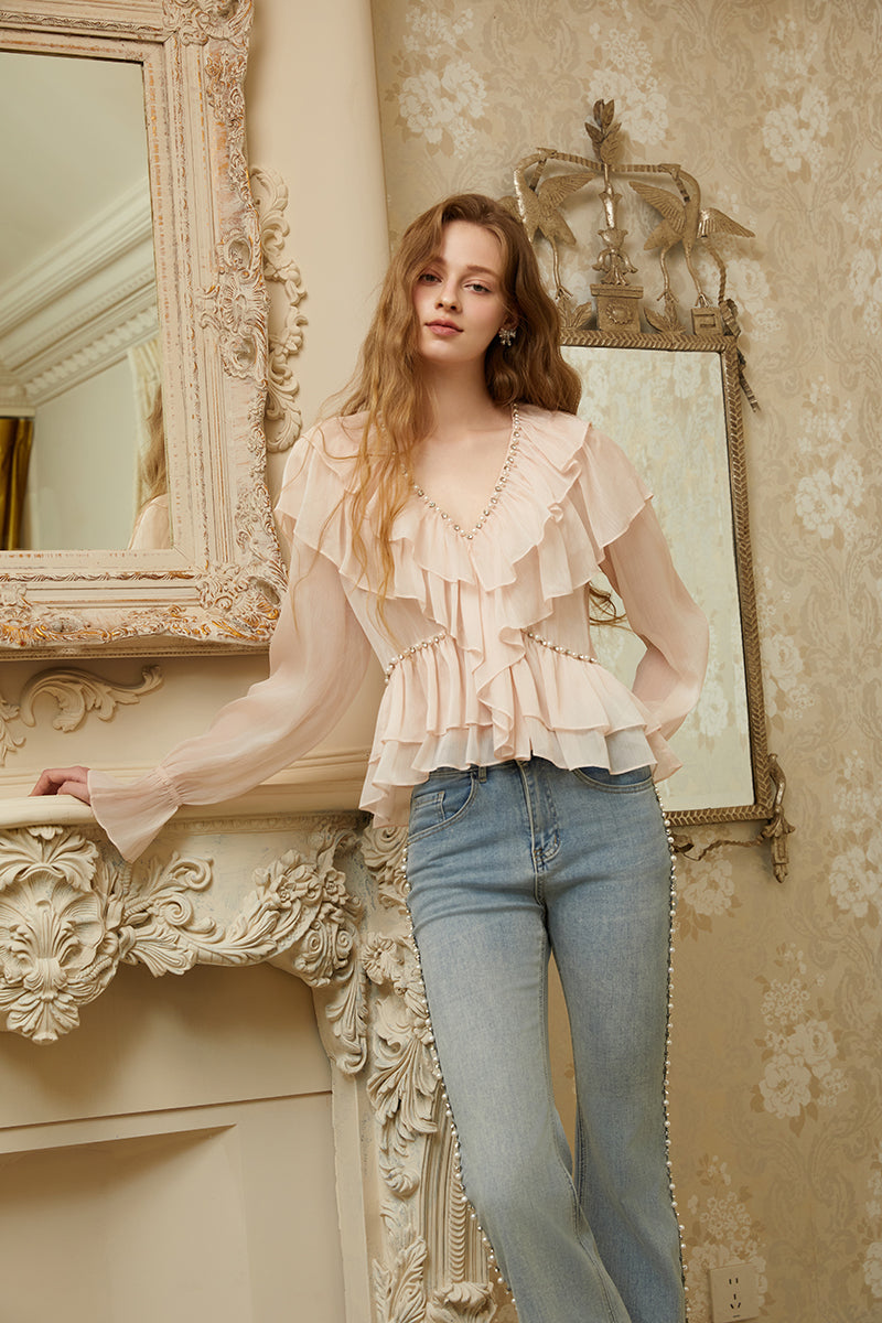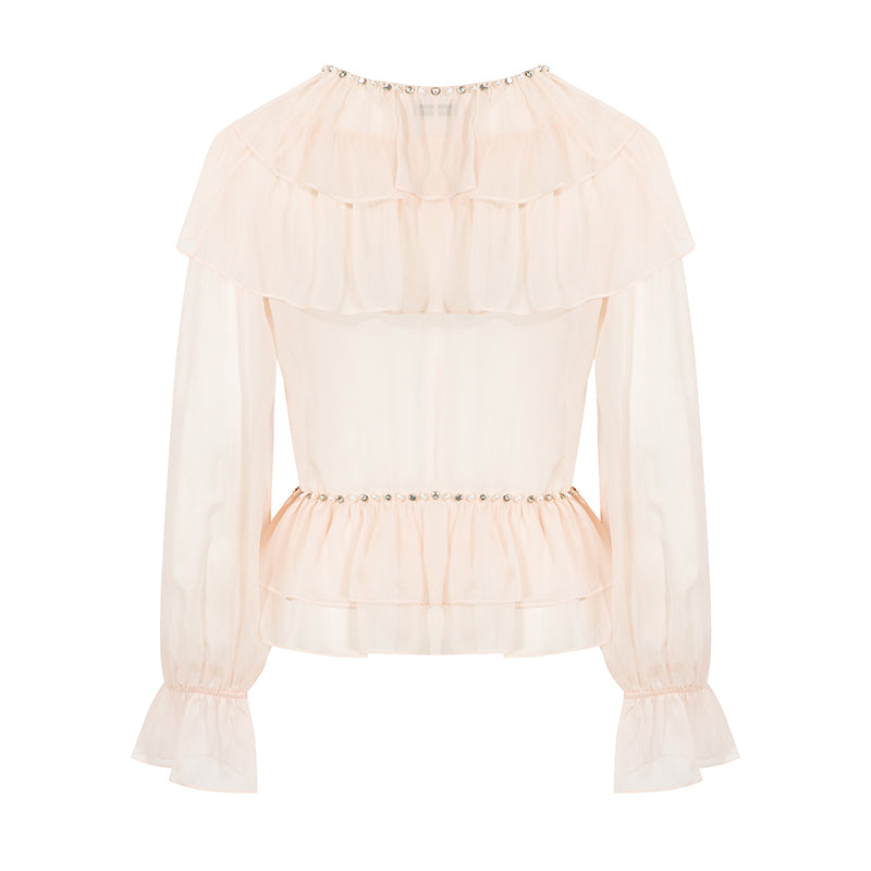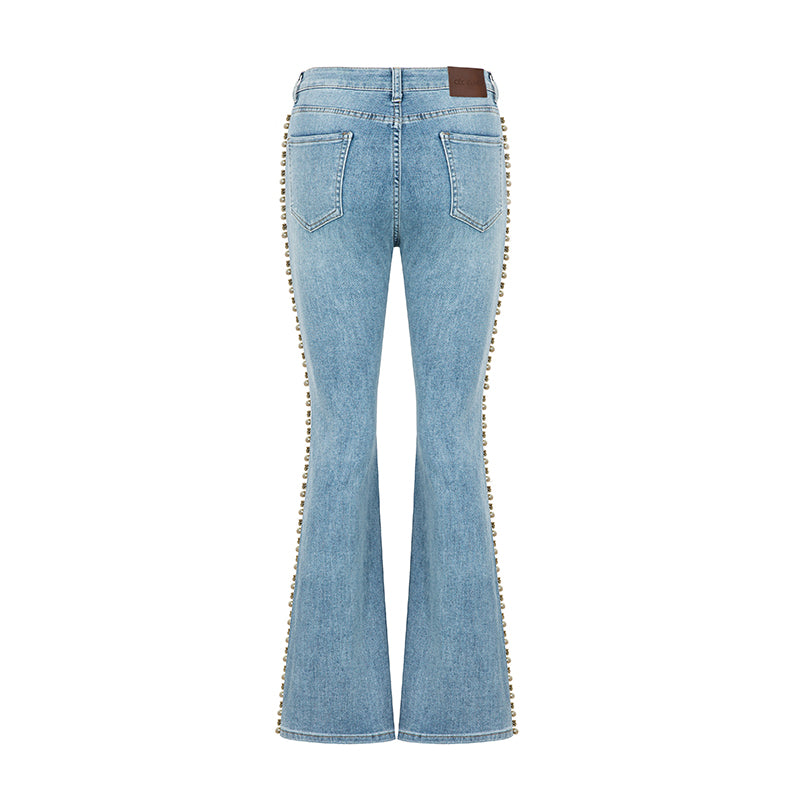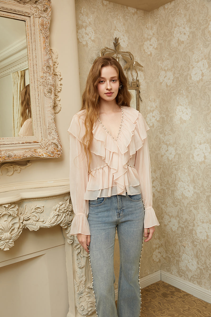 CEE CUBED Light Pink Lace Trim Blouse & Embellished Flared Jeans Set