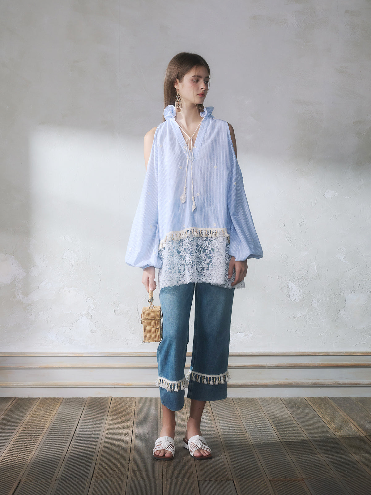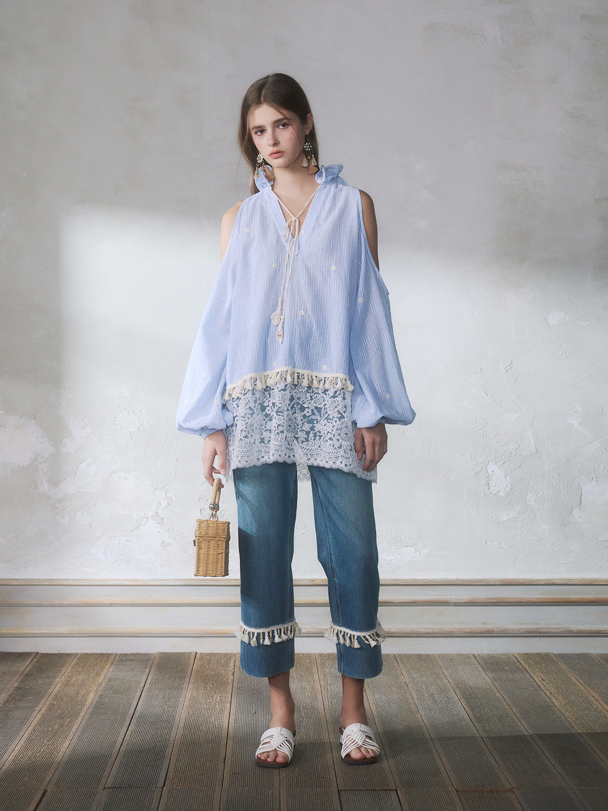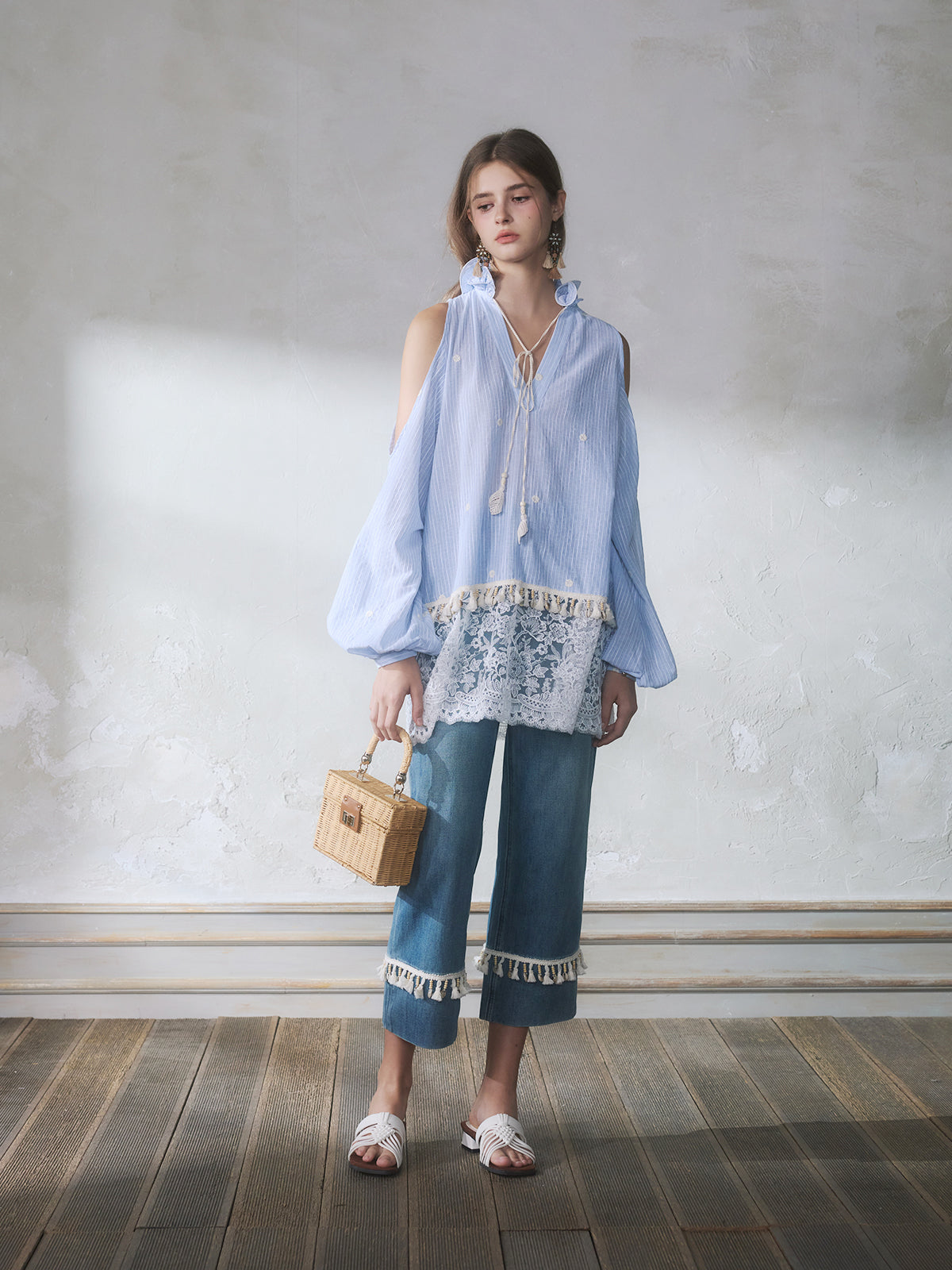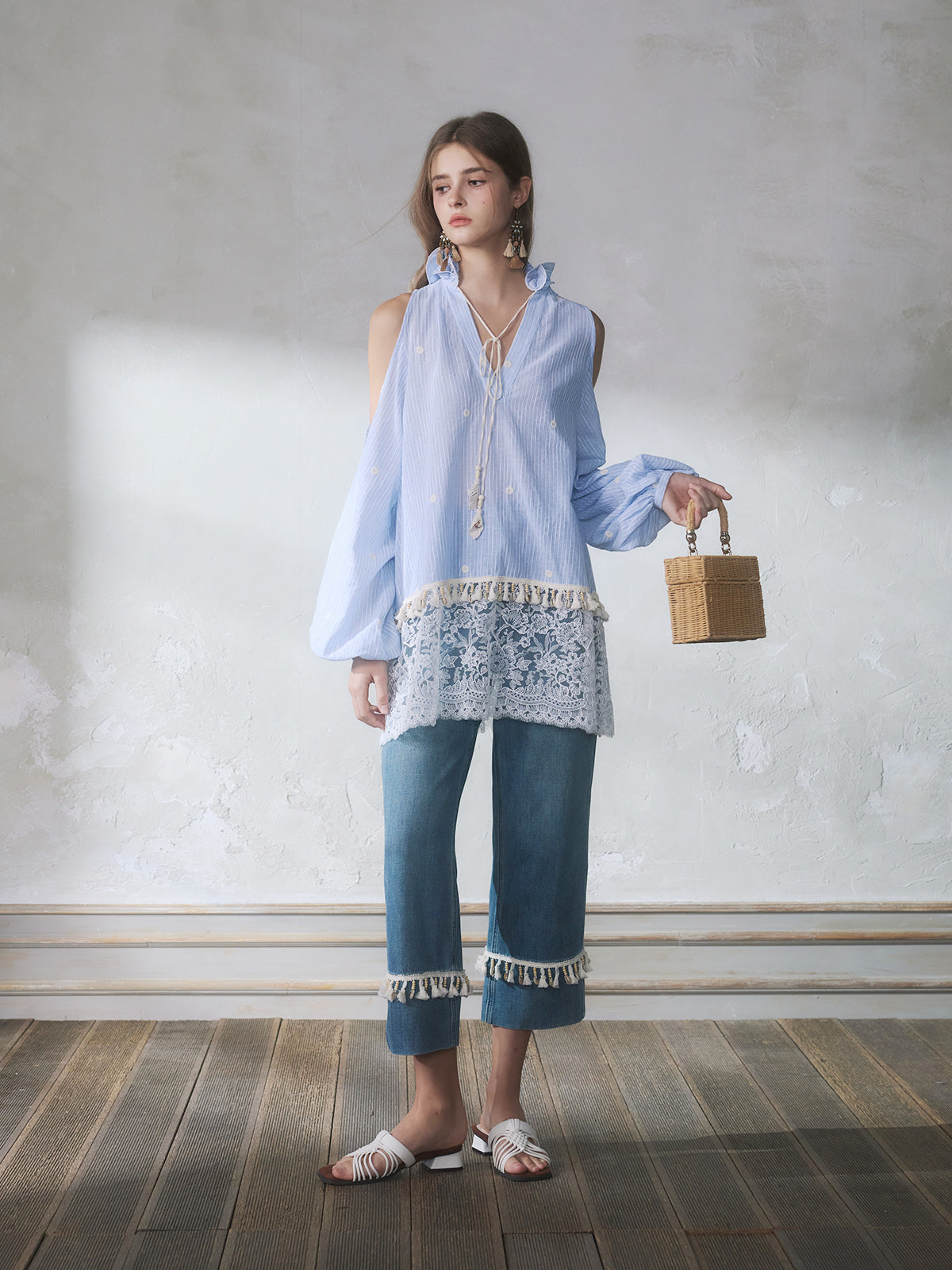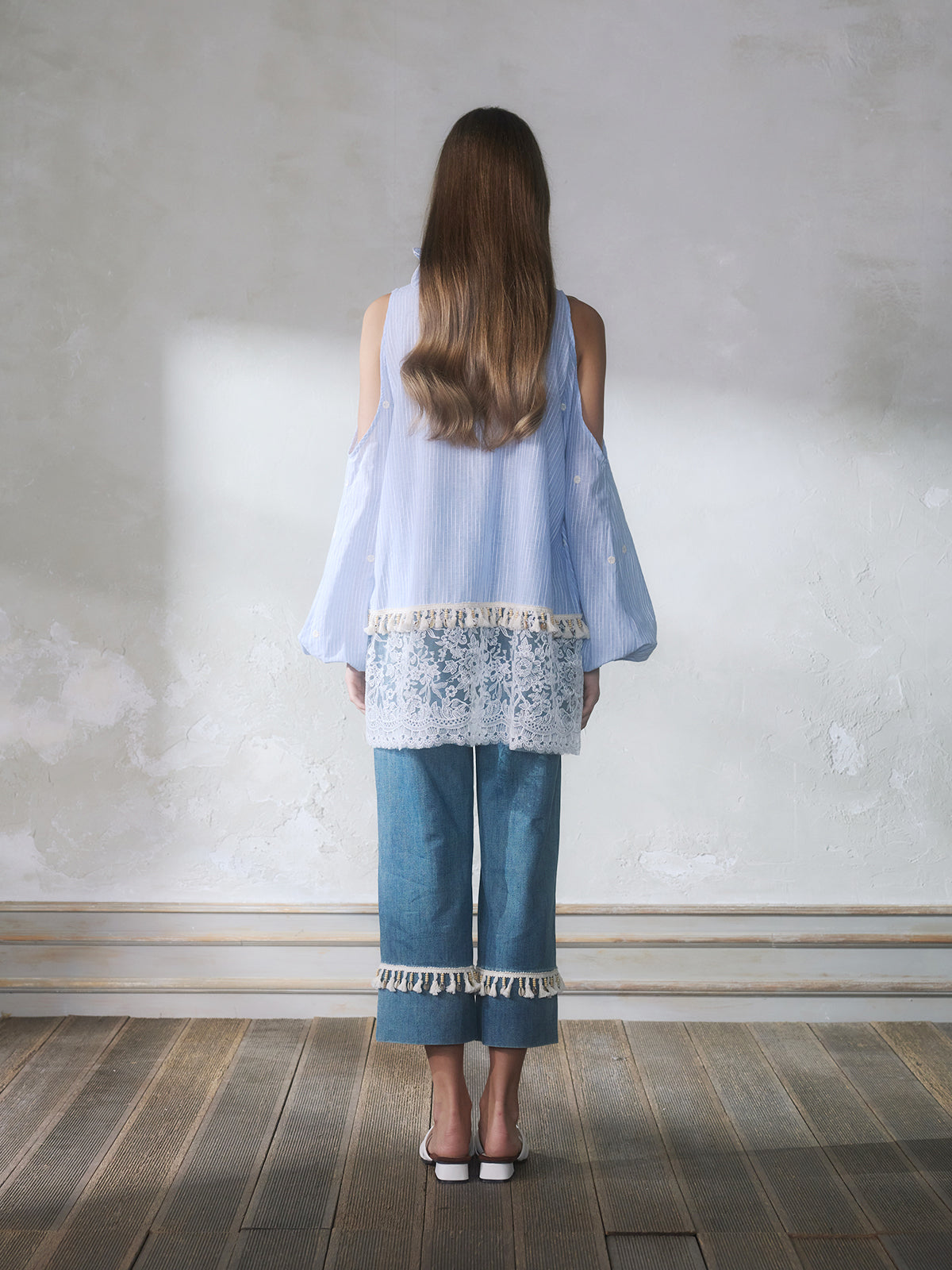 GUOJINGYI Blue Embroidered Lace-Panel Off-Shoulder Top & Cropped Jeans Set