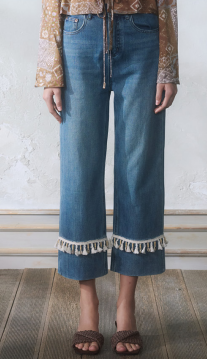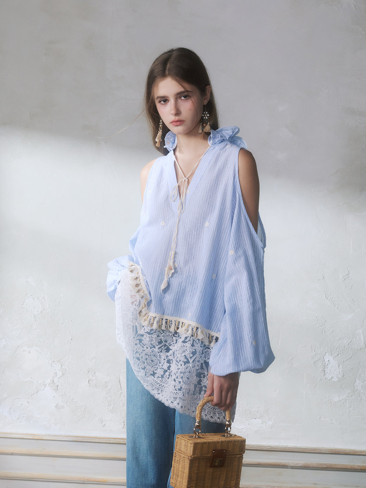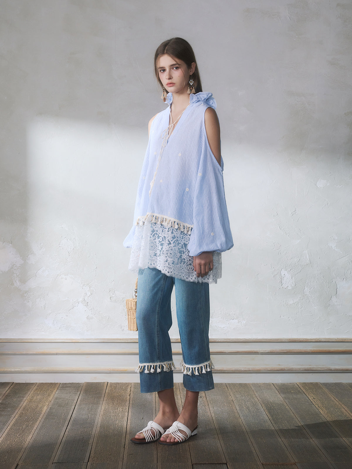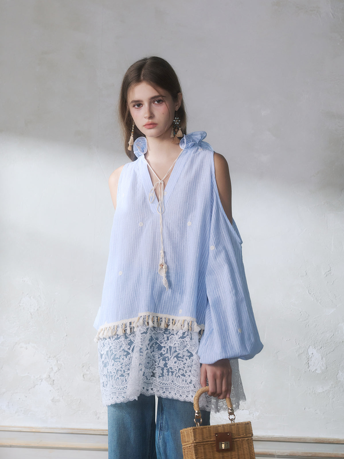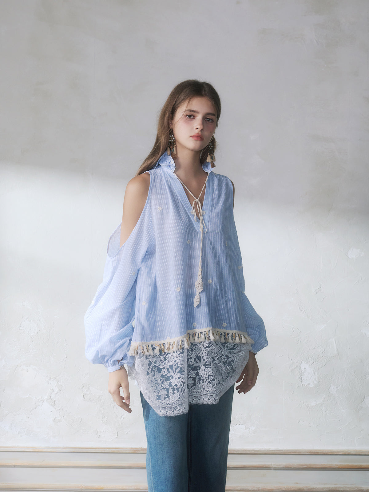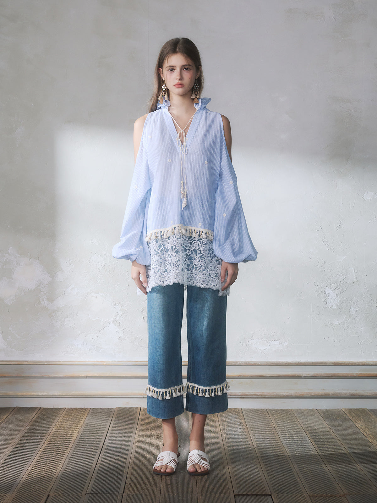 GUOJINGYI Blue Embroidered Lace-Panel Off-Shoulder Top & Cropped Jeans Set