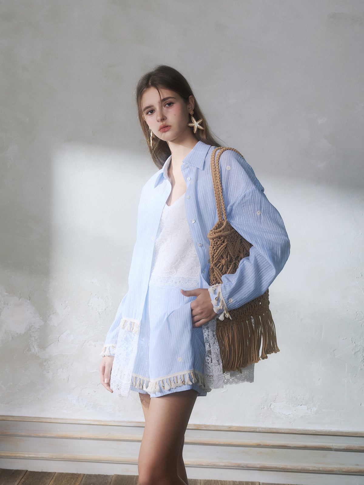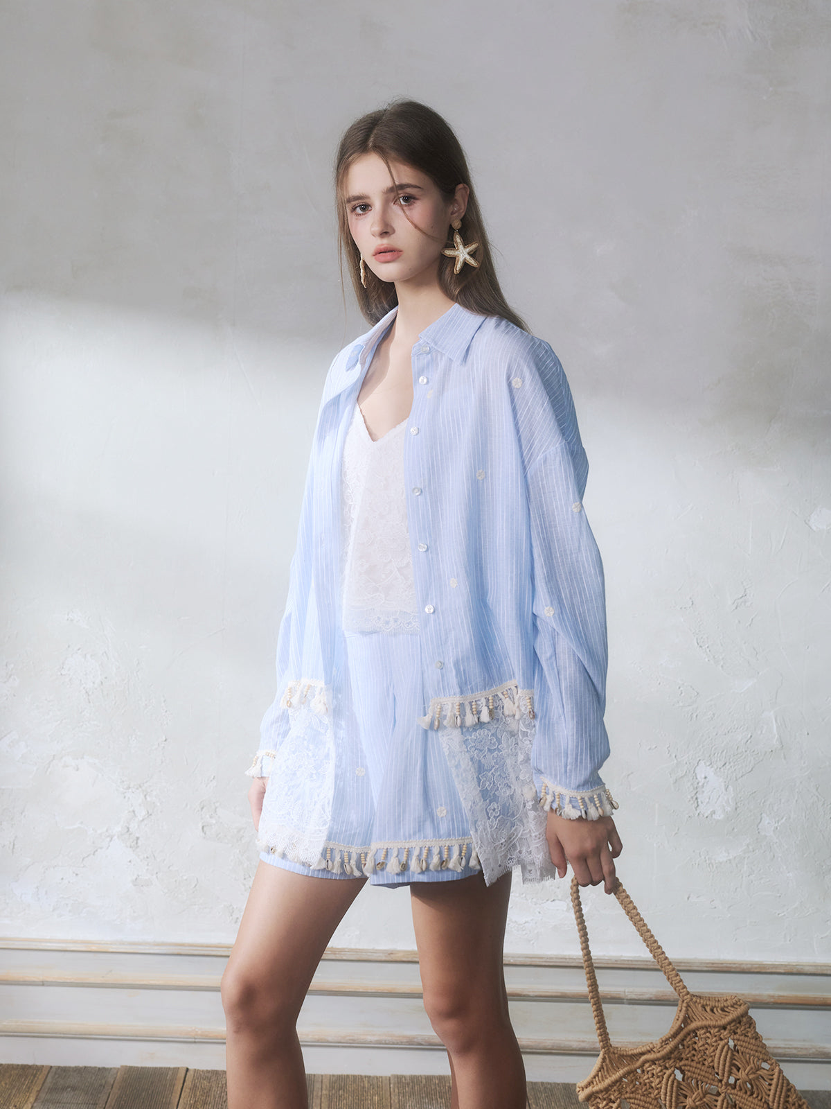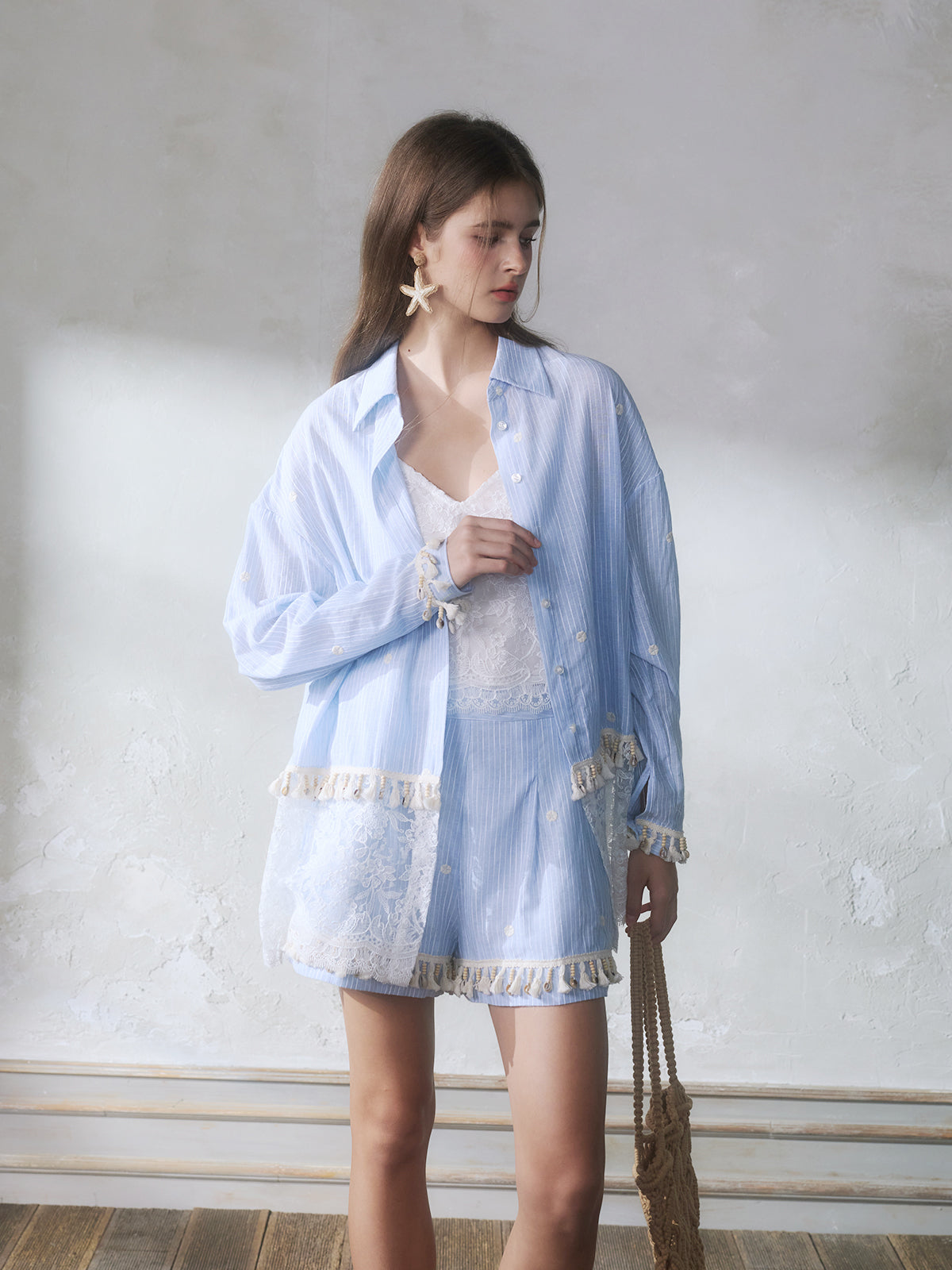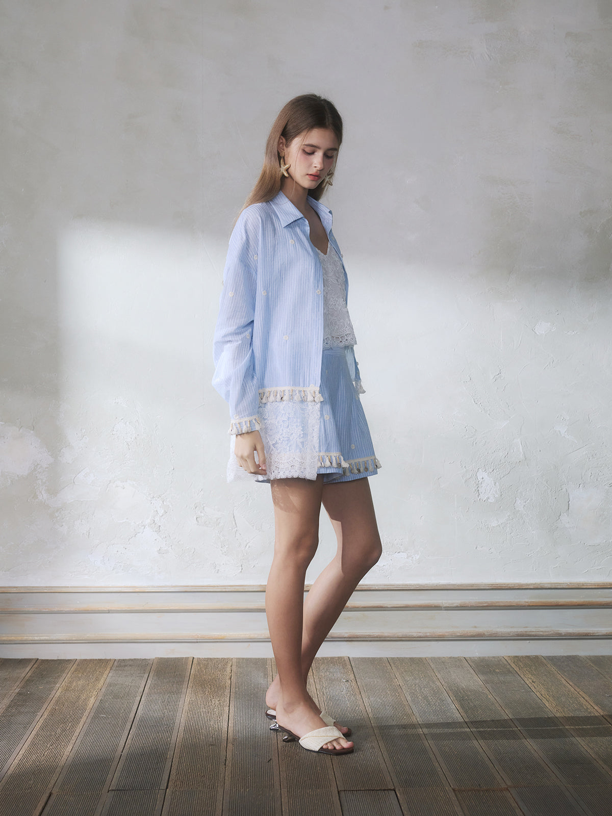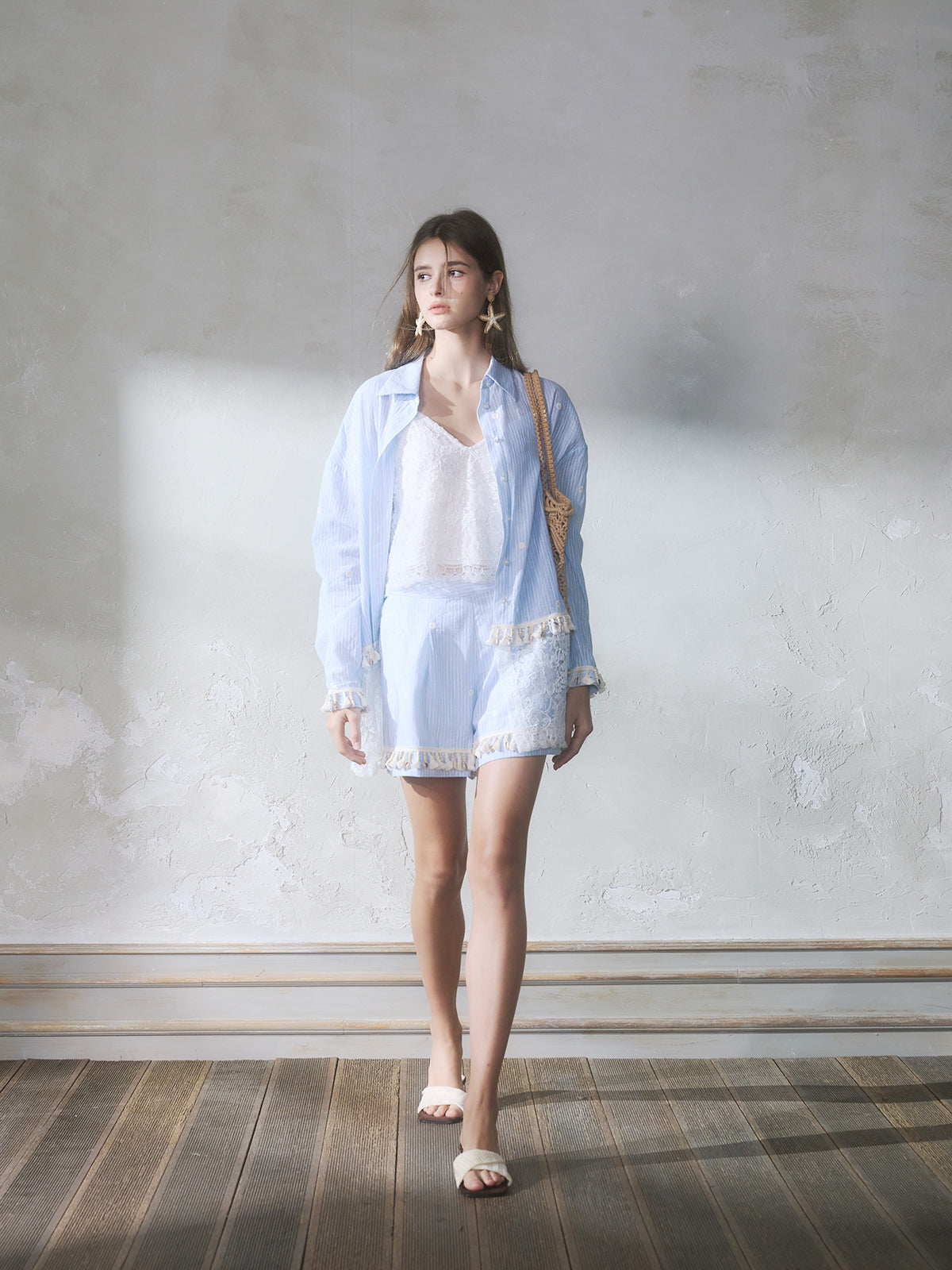 GUOJINGYI White Lace Cami, Blue Striped Shirt & Shorts Set