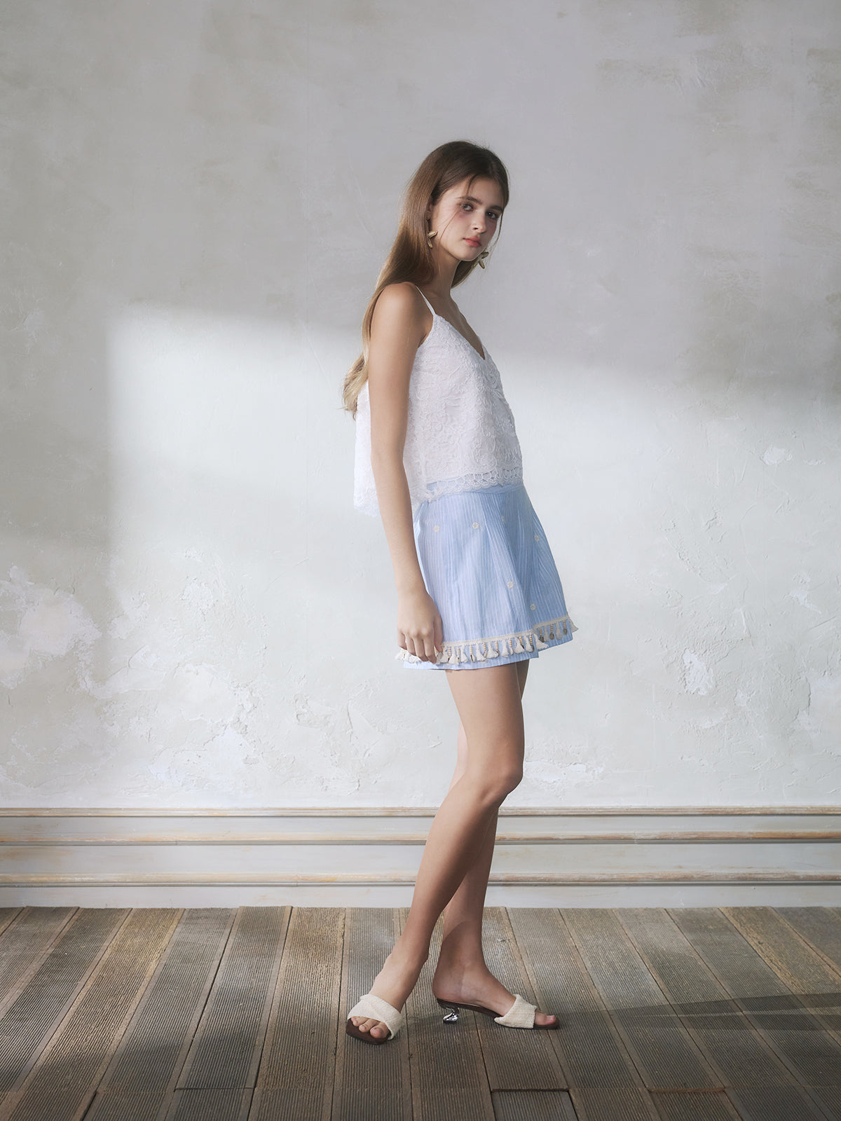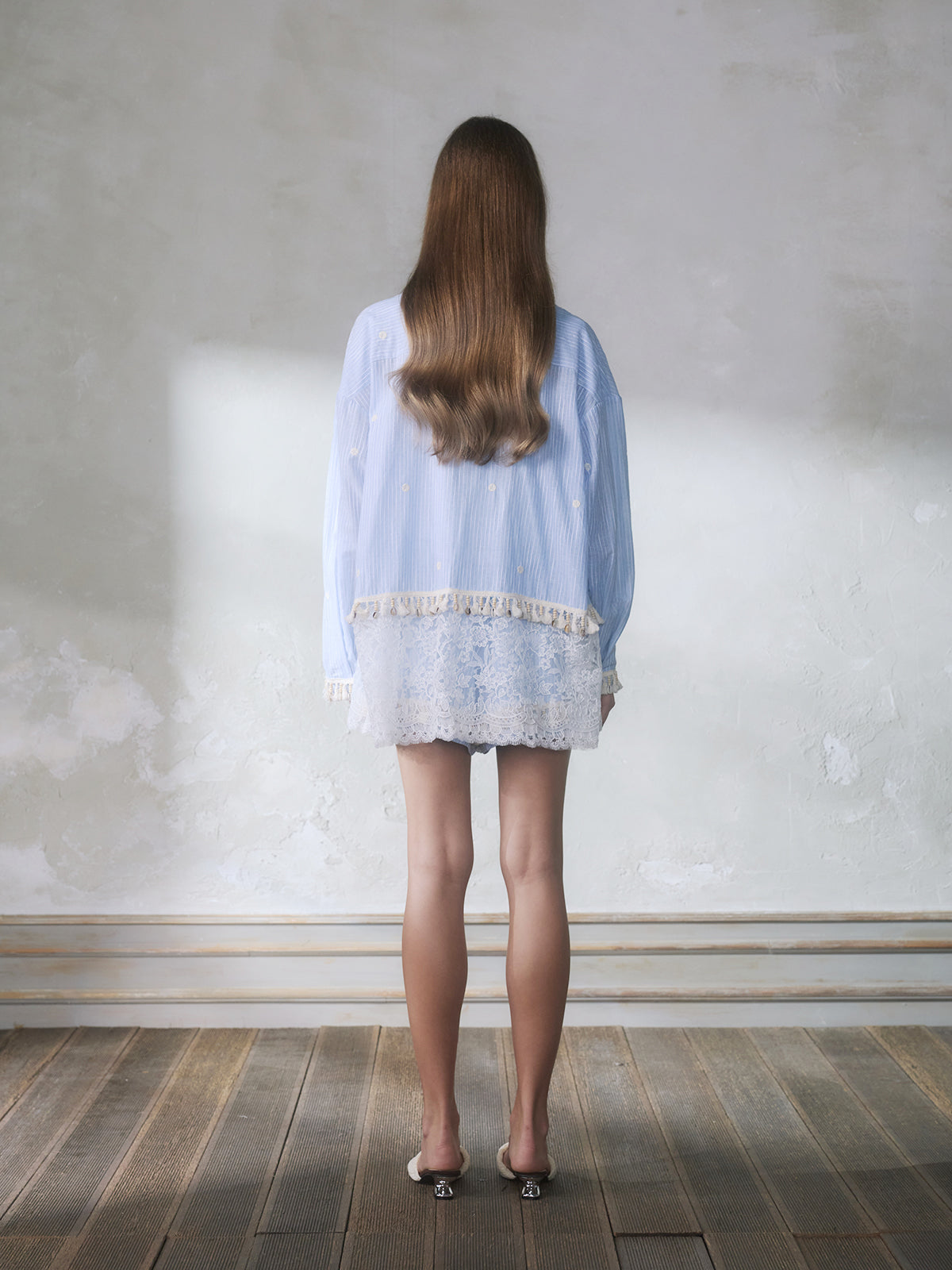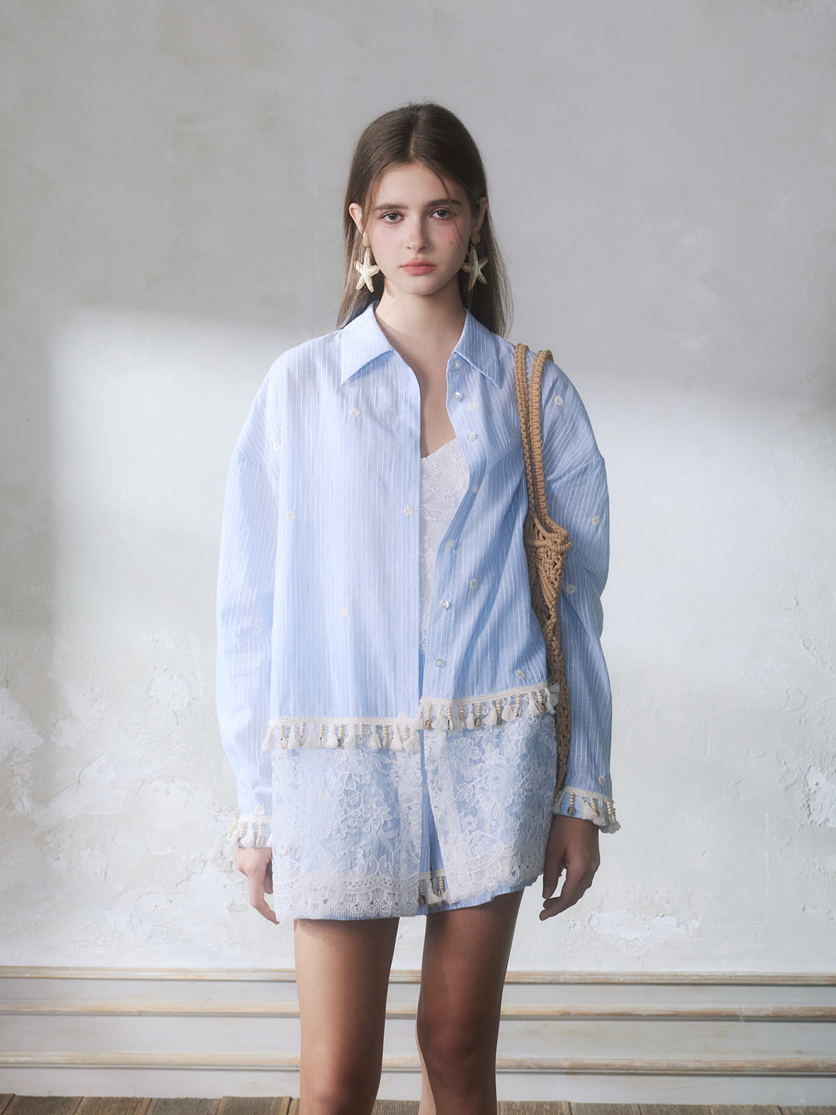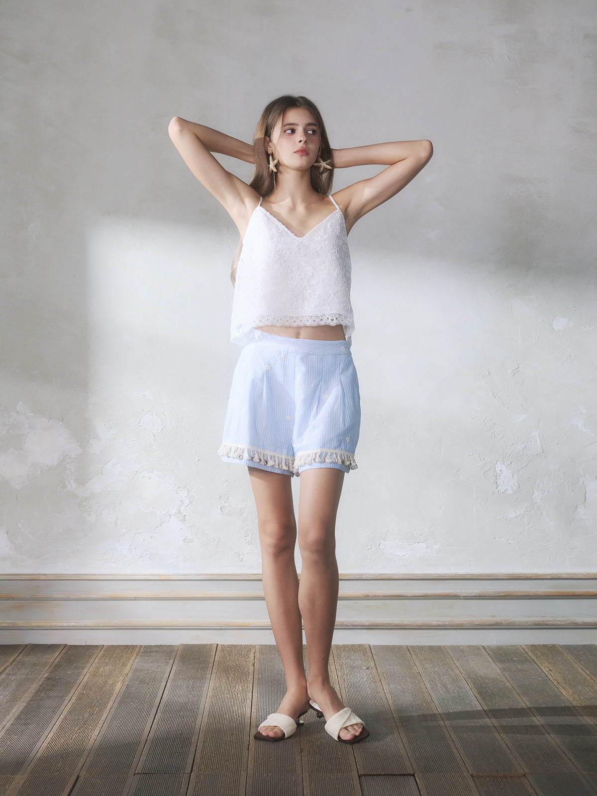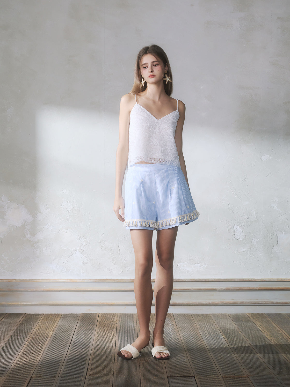 GUOJINGYI White Lace Cami, Blue Striped Shirt & Shorts Set