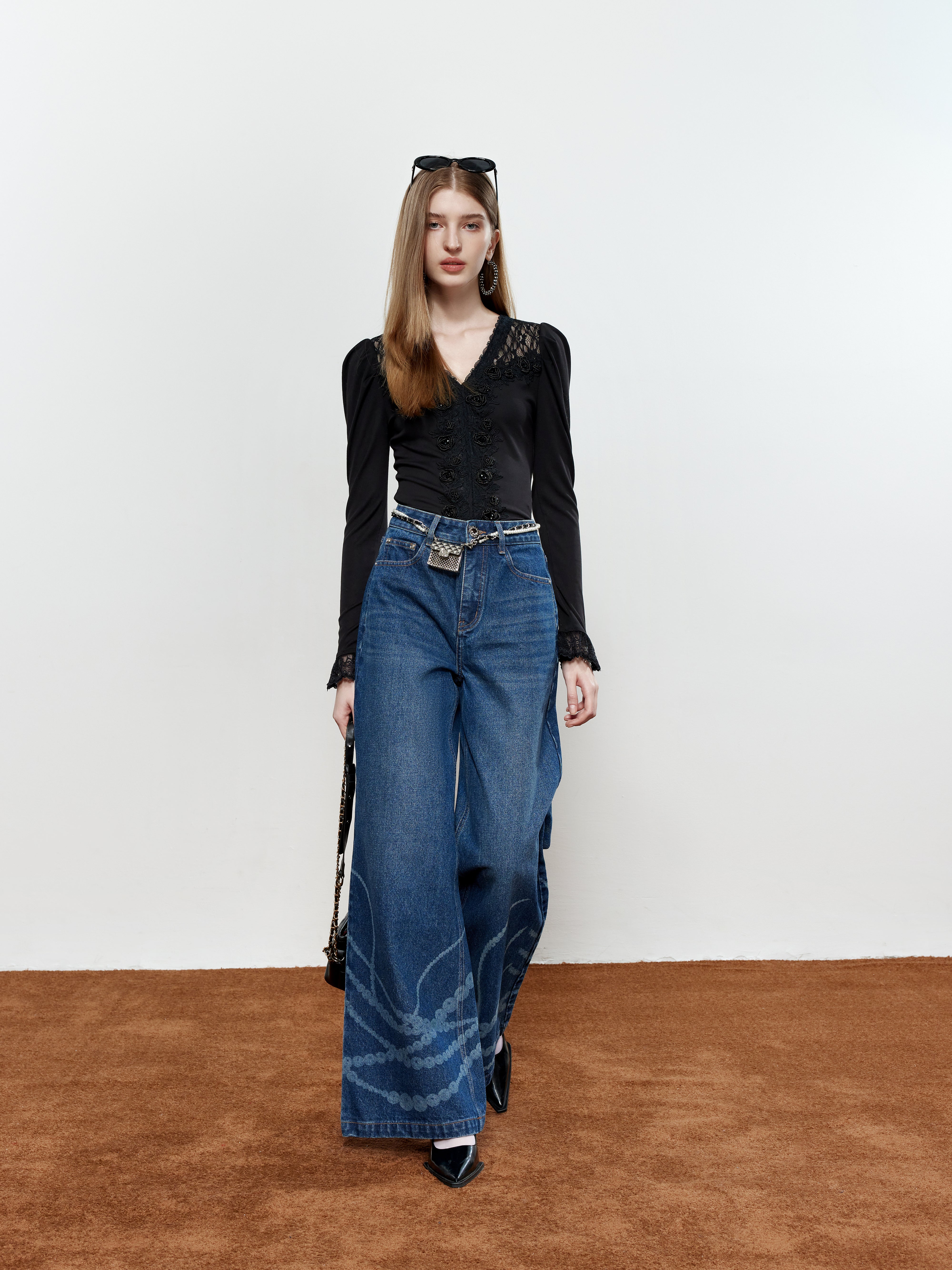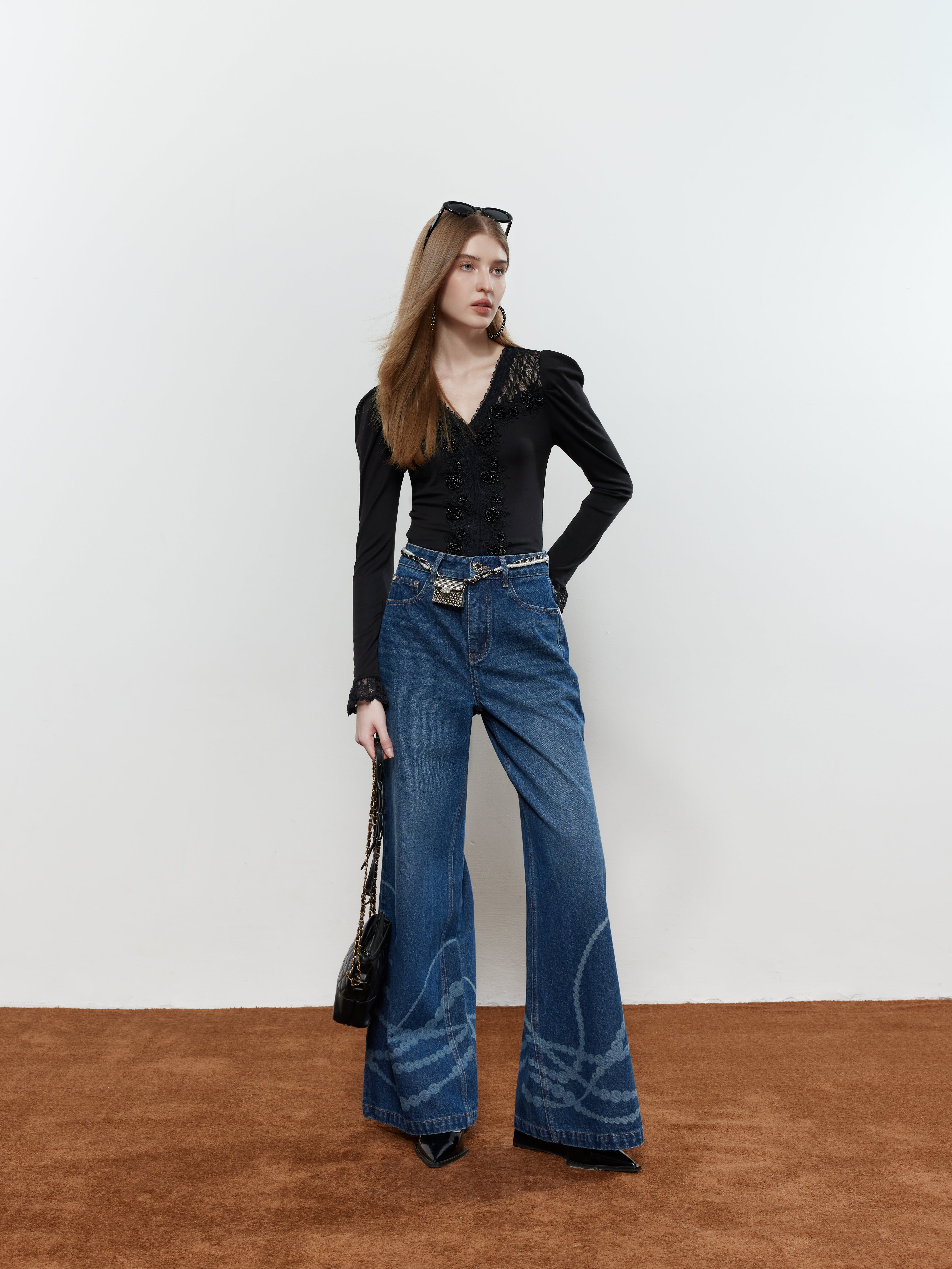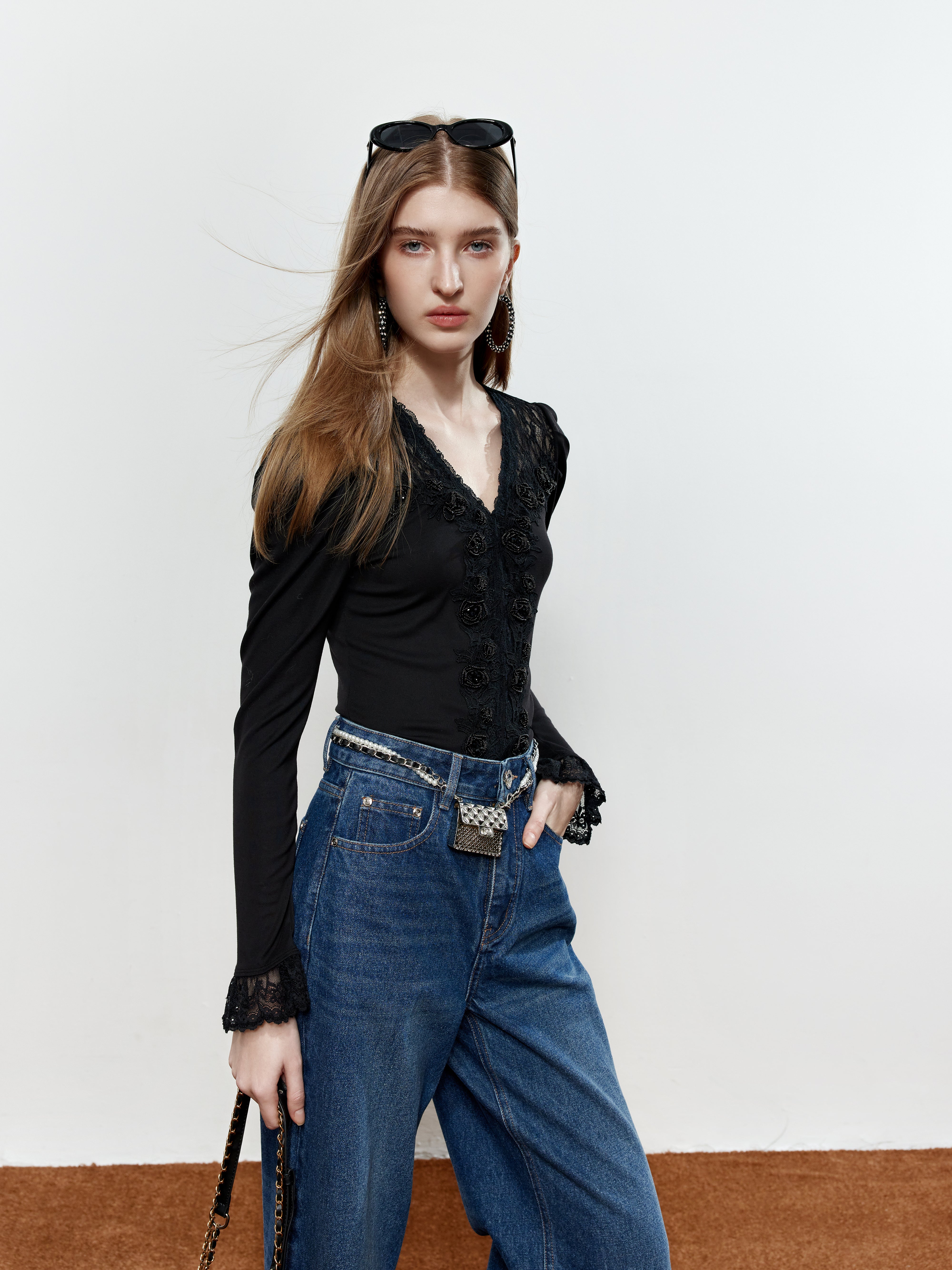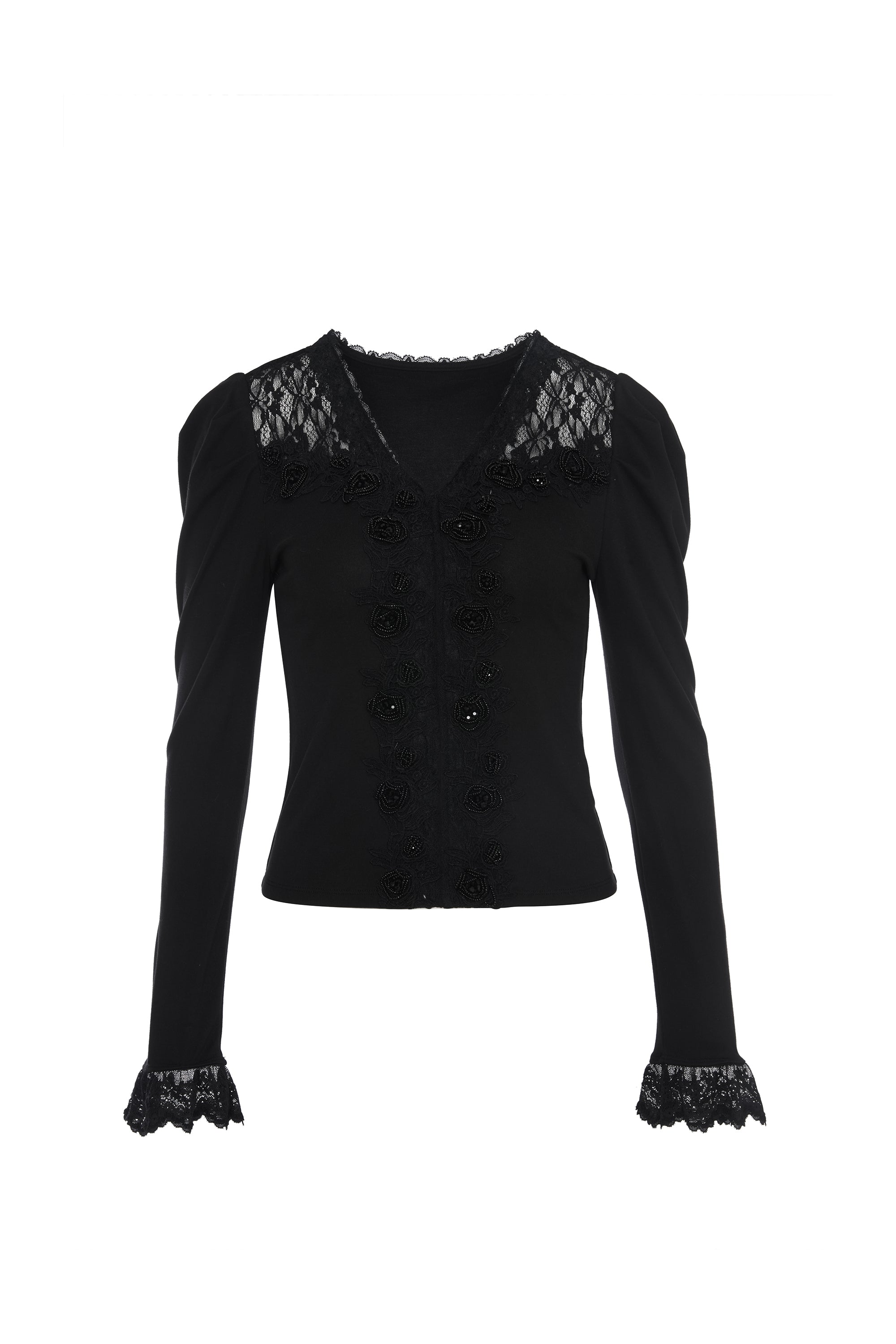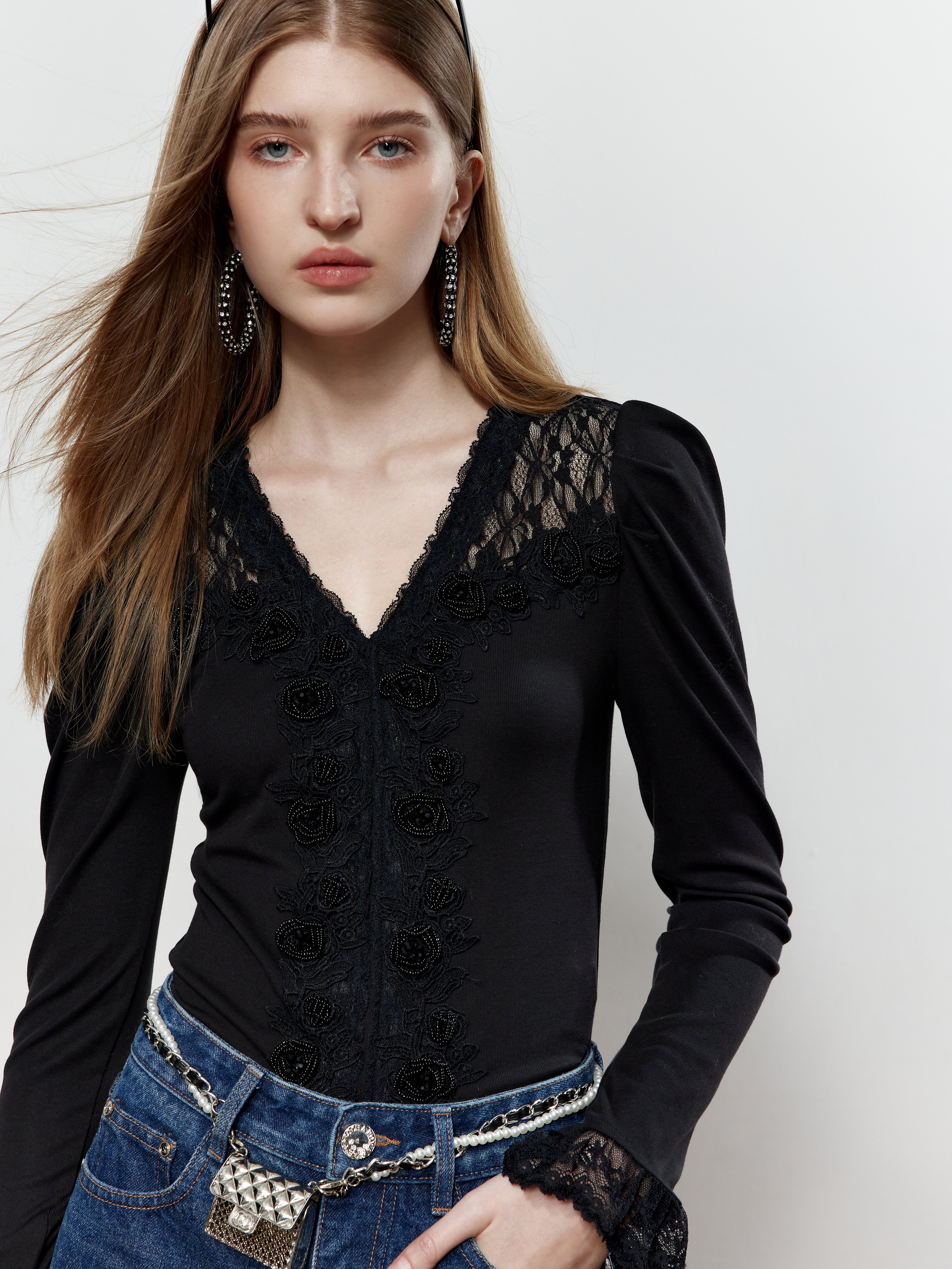 ROCHA ROMA Beaded Floral Lace V-Neck Top (BLACK)