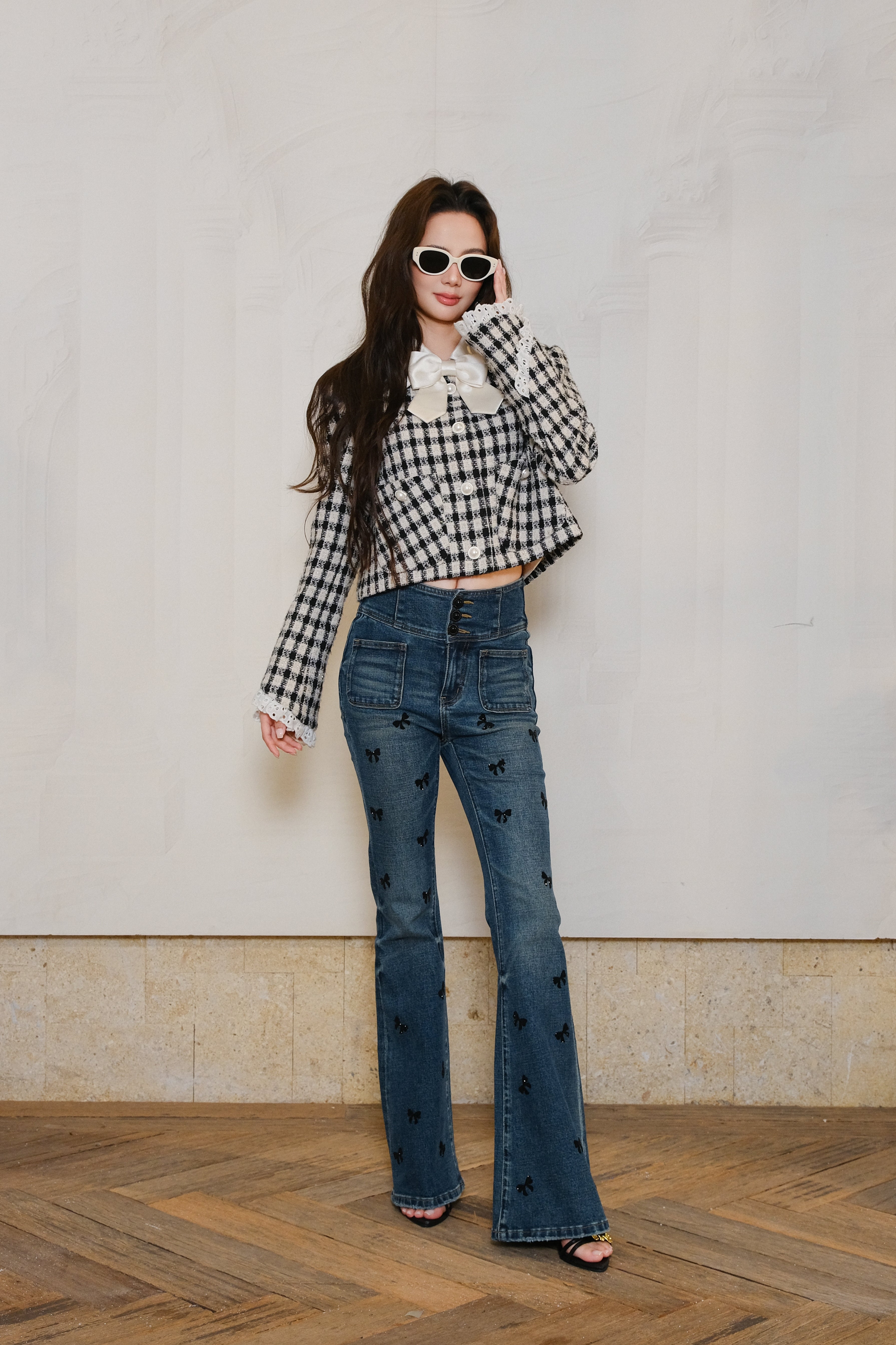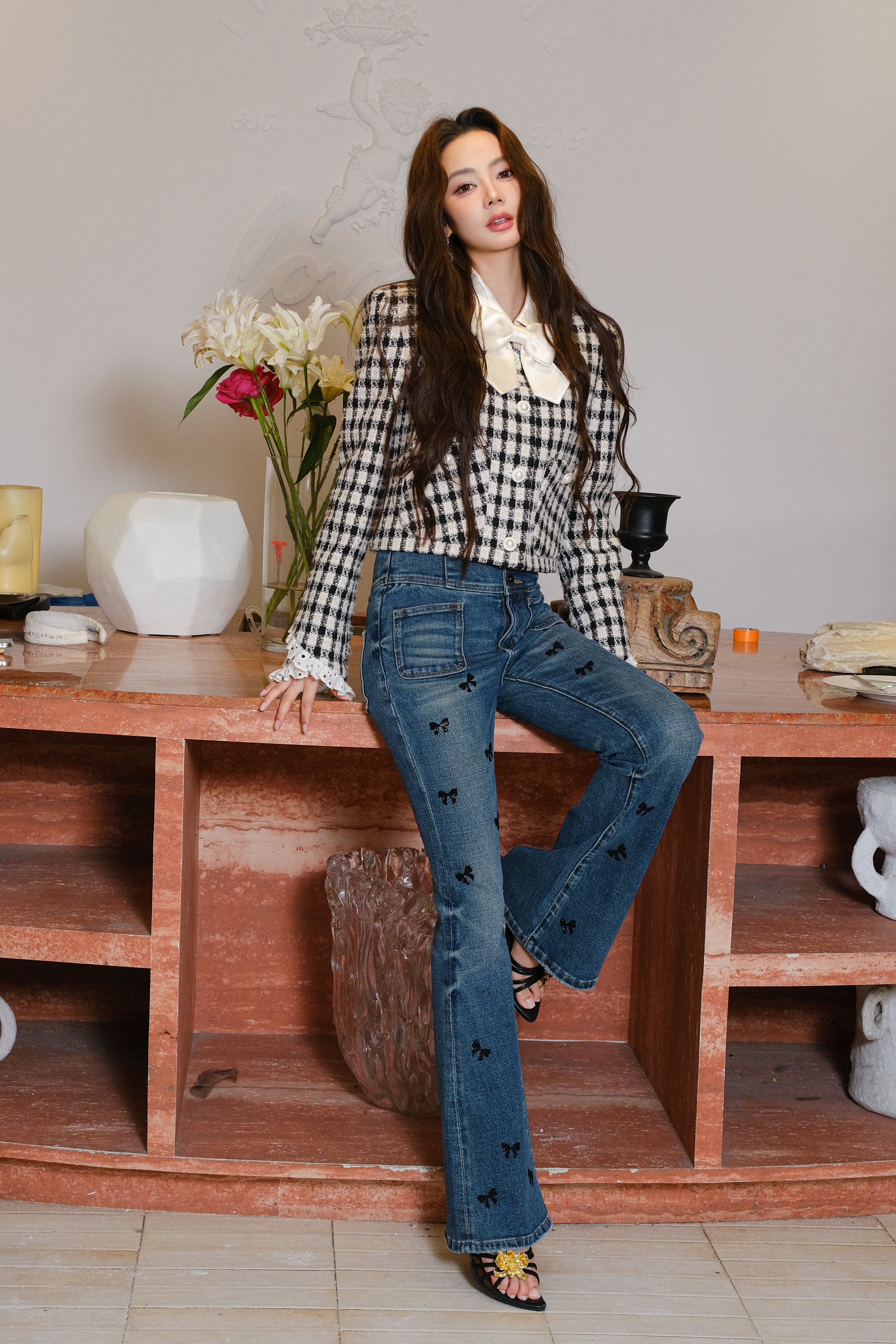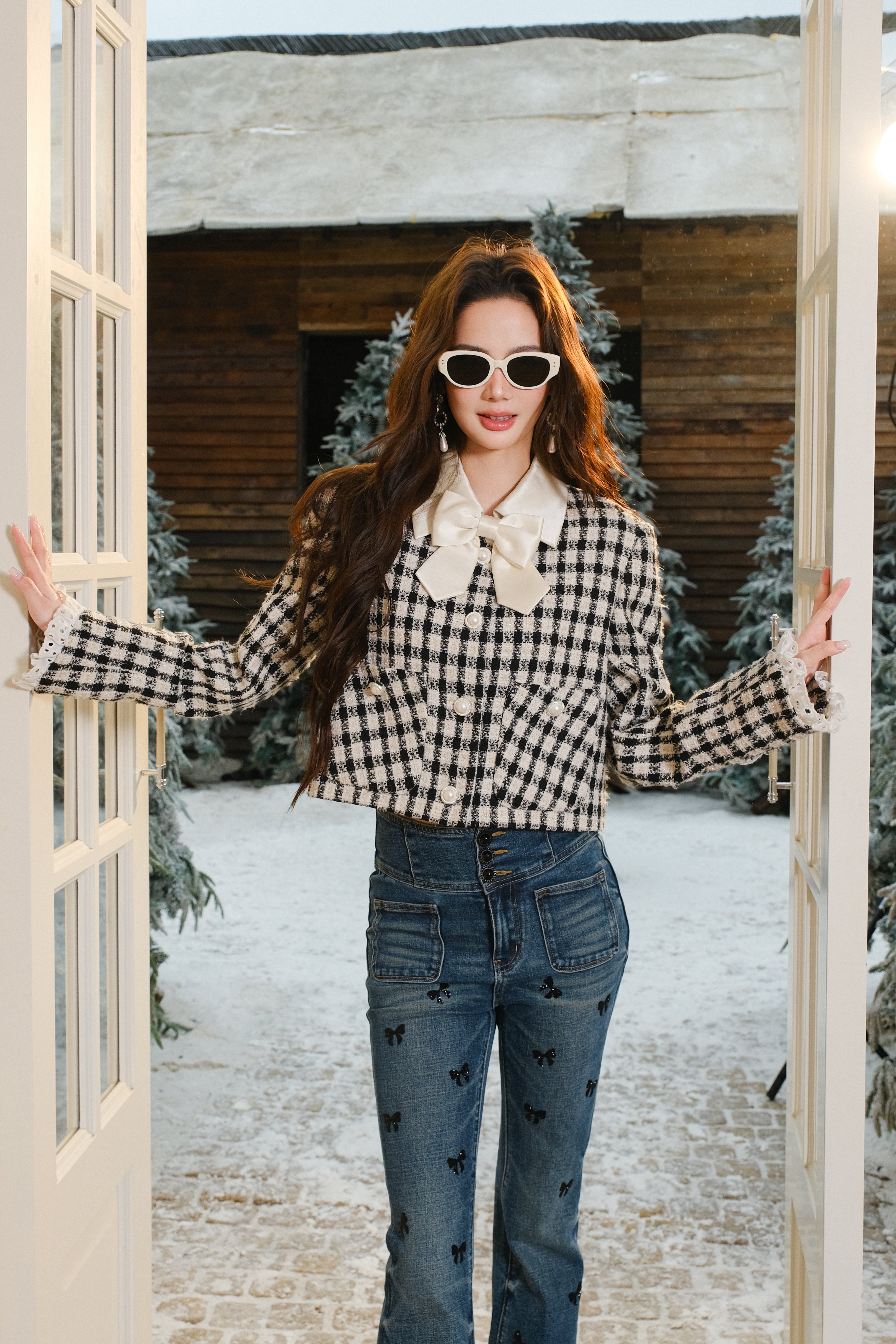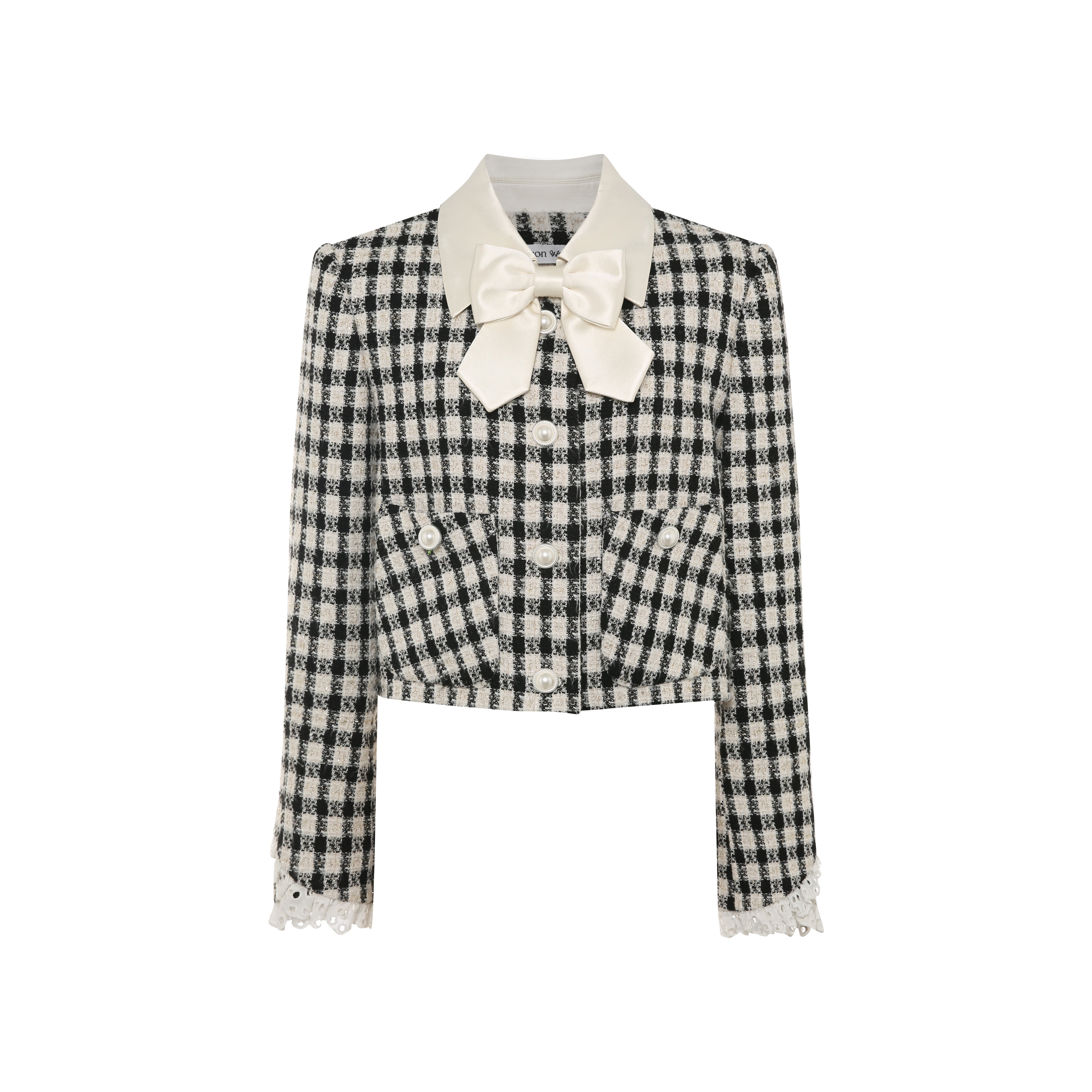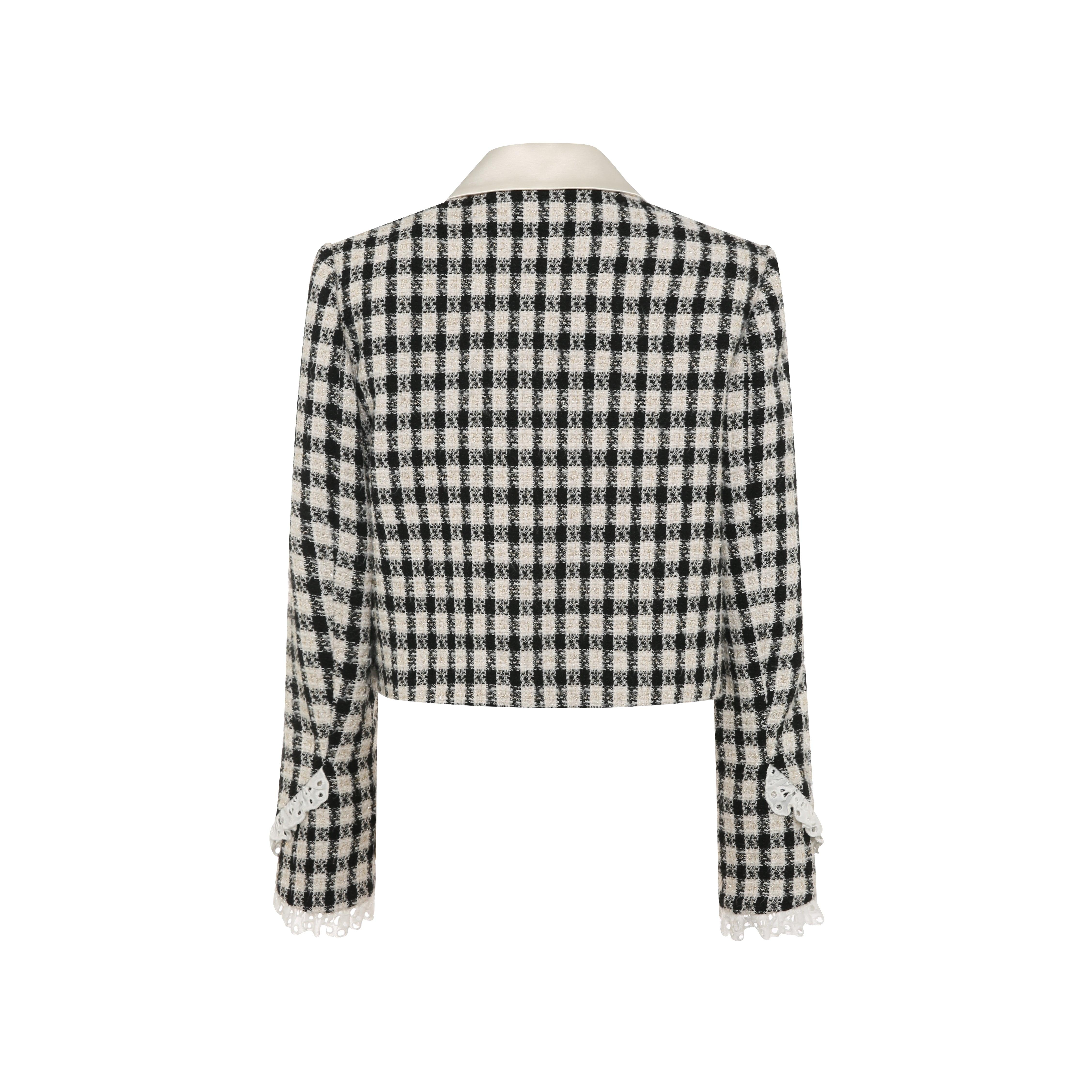 MAISON WESTER Black White Plaid Tweed Lace Collar Jacket