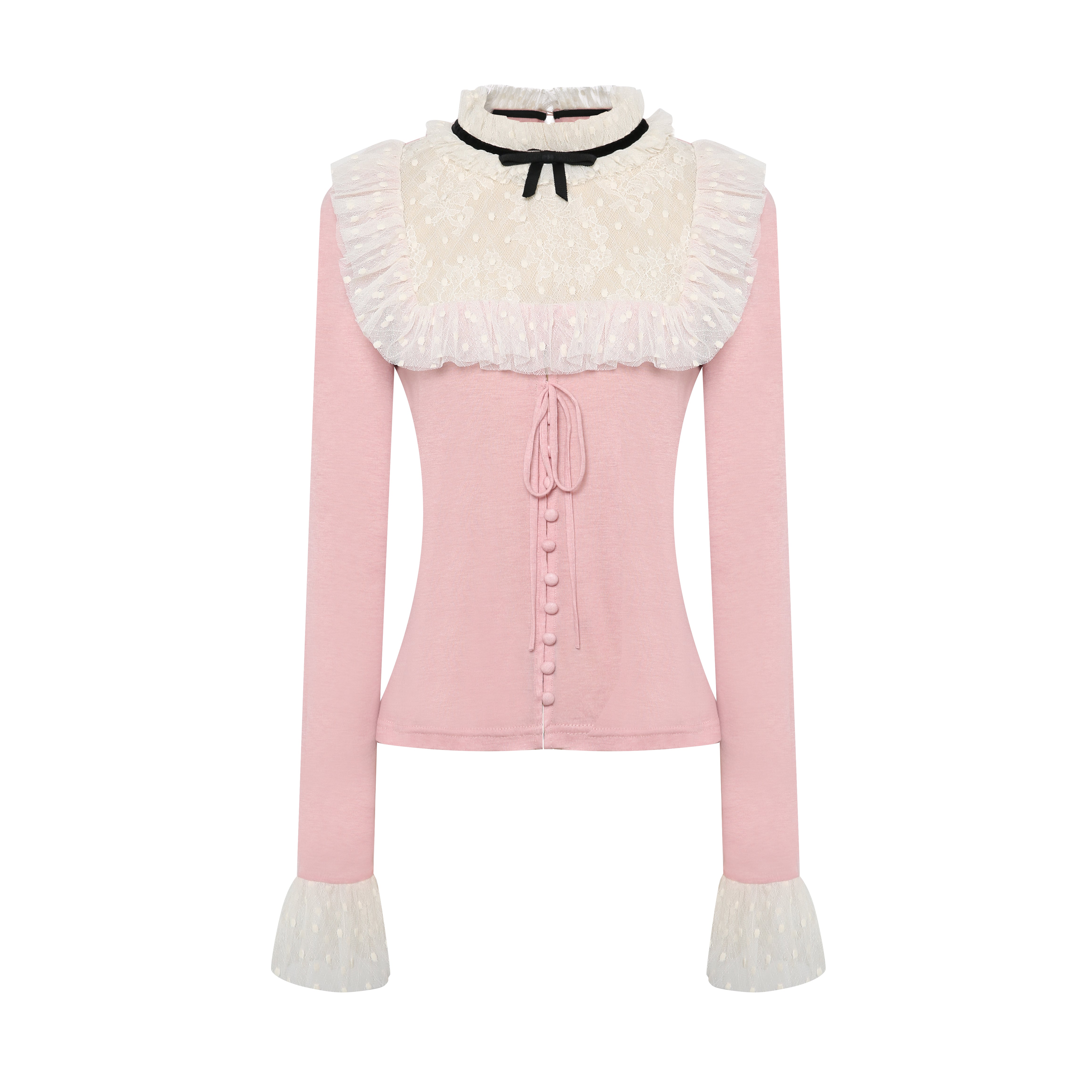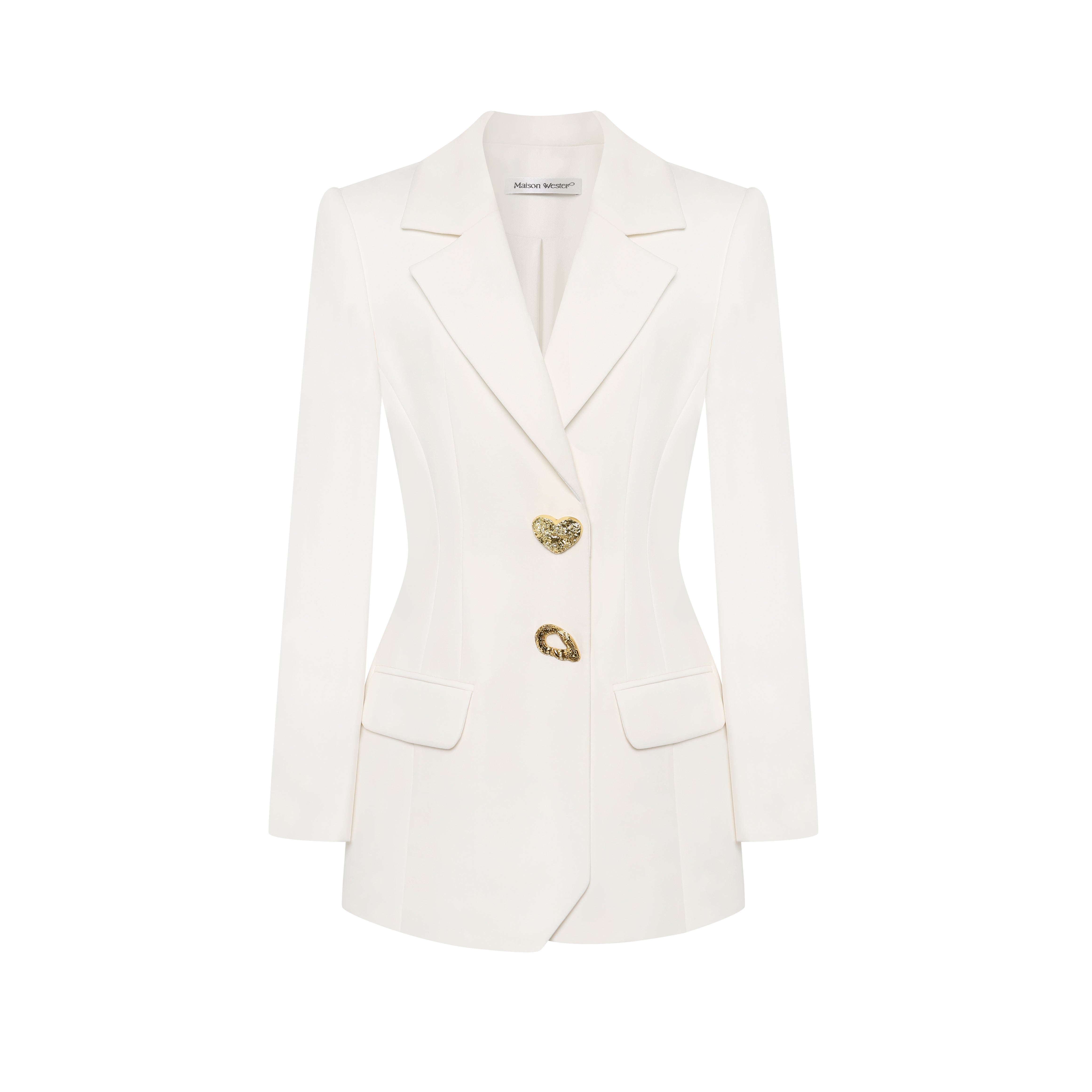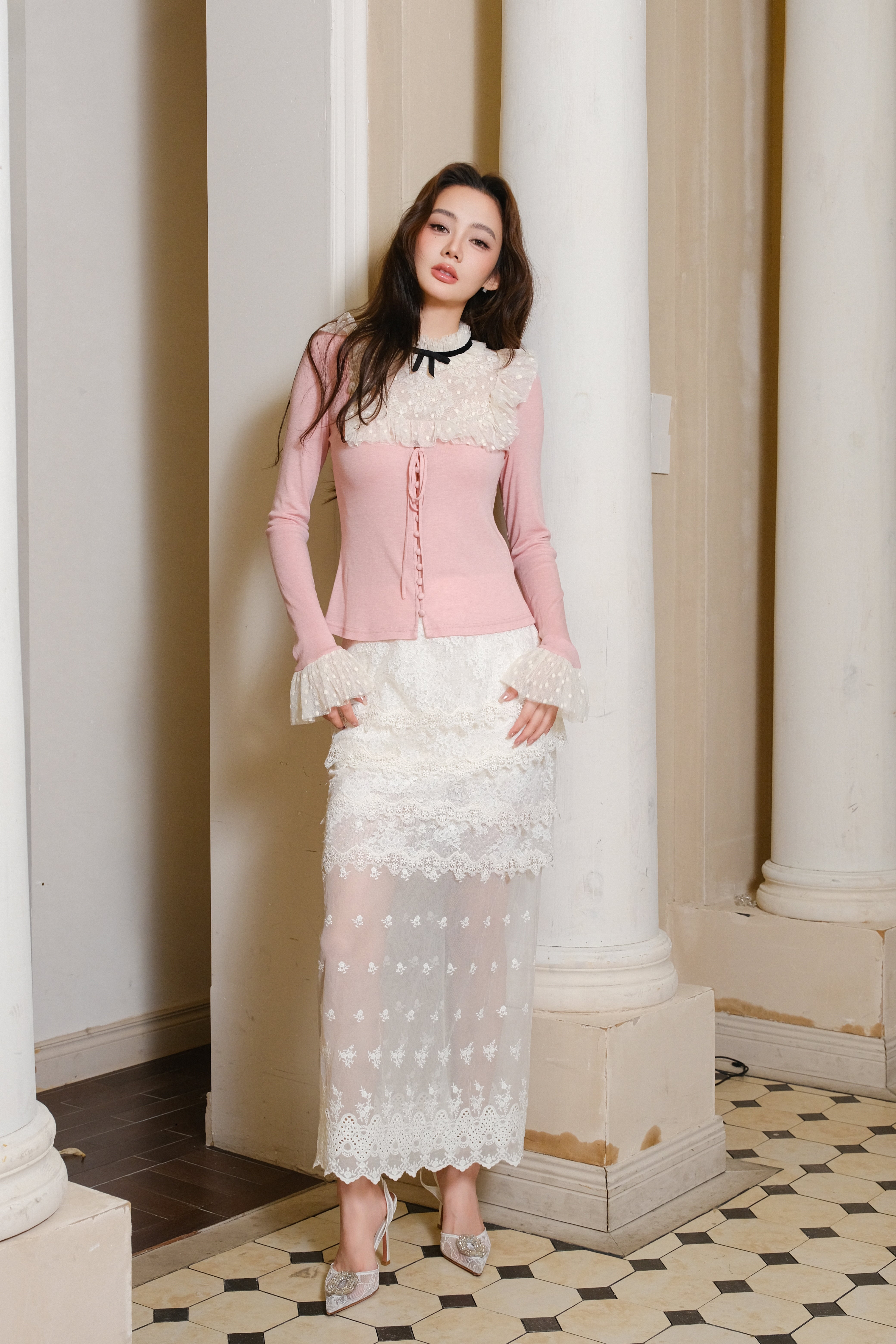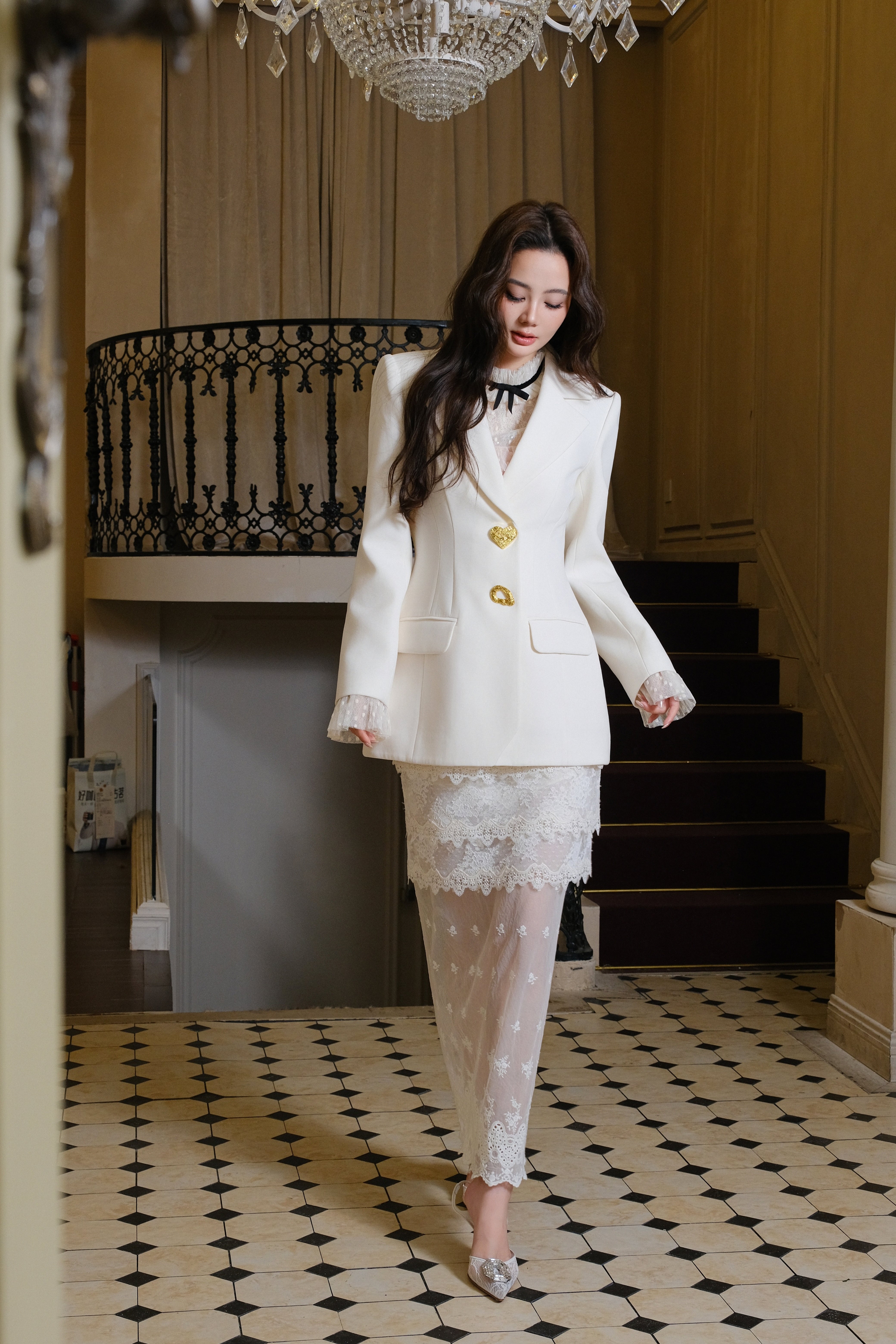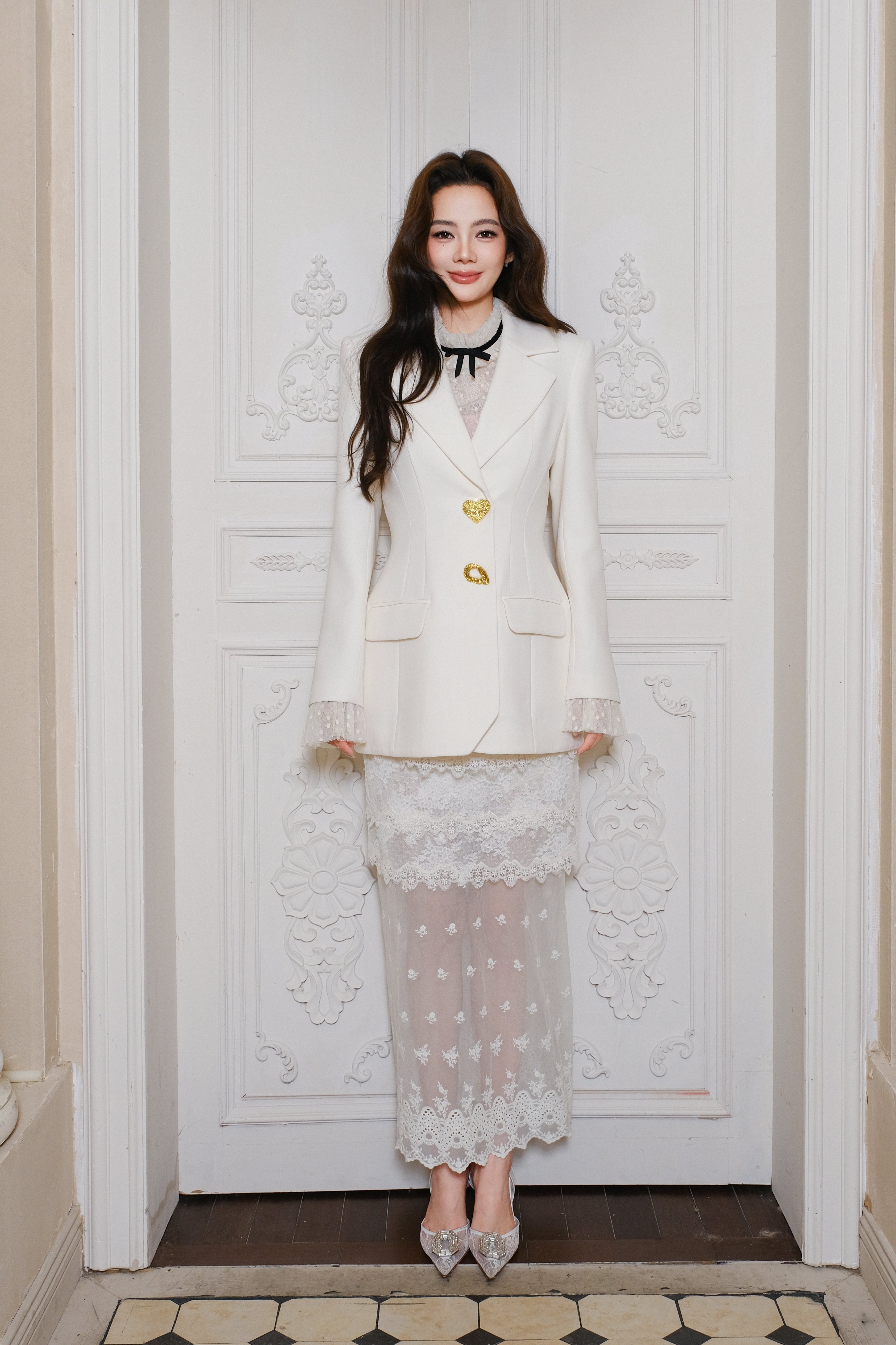 MAISON WESTER White Heart Blazer, Pink White Top & Lace Skirt Set