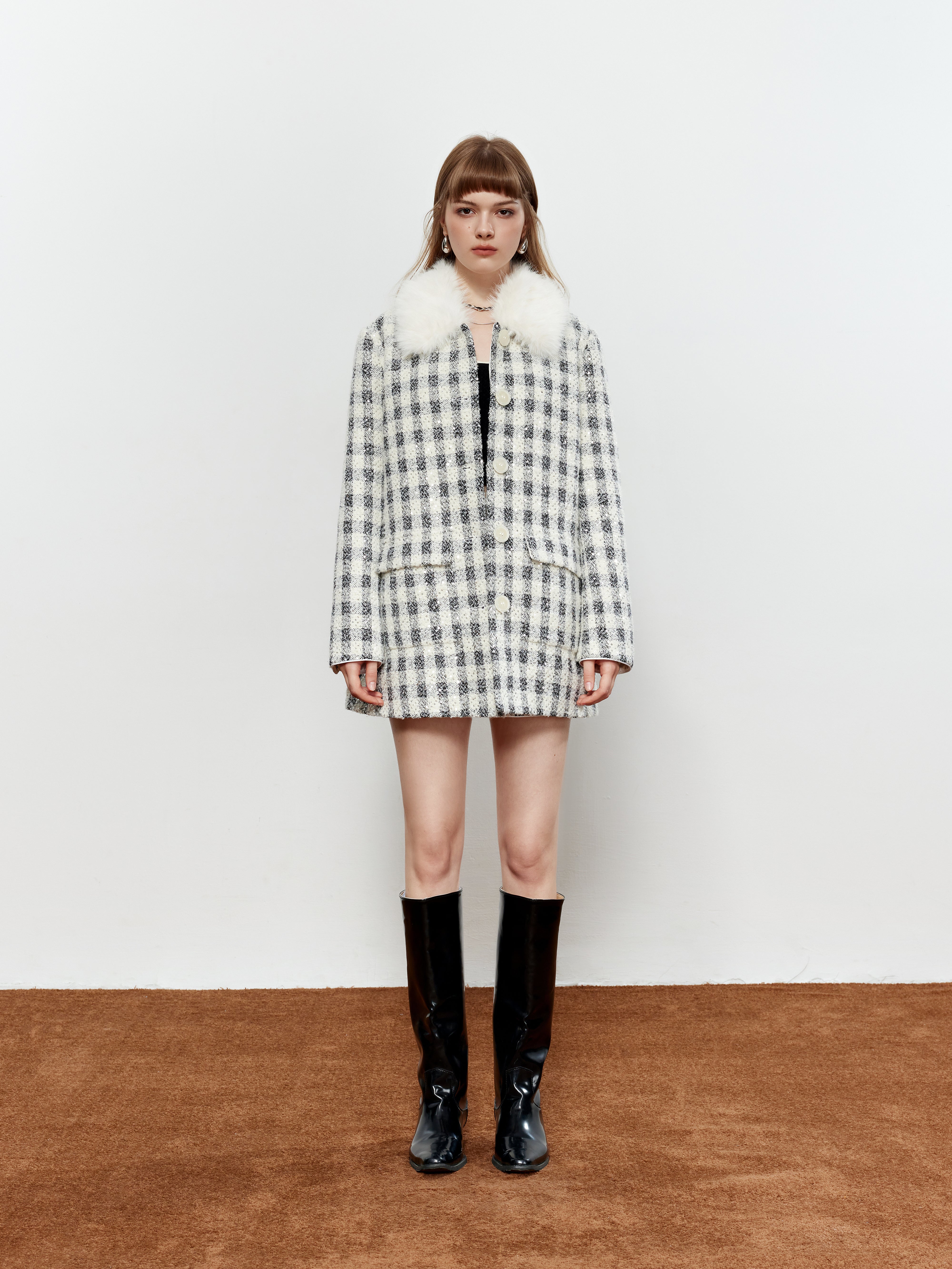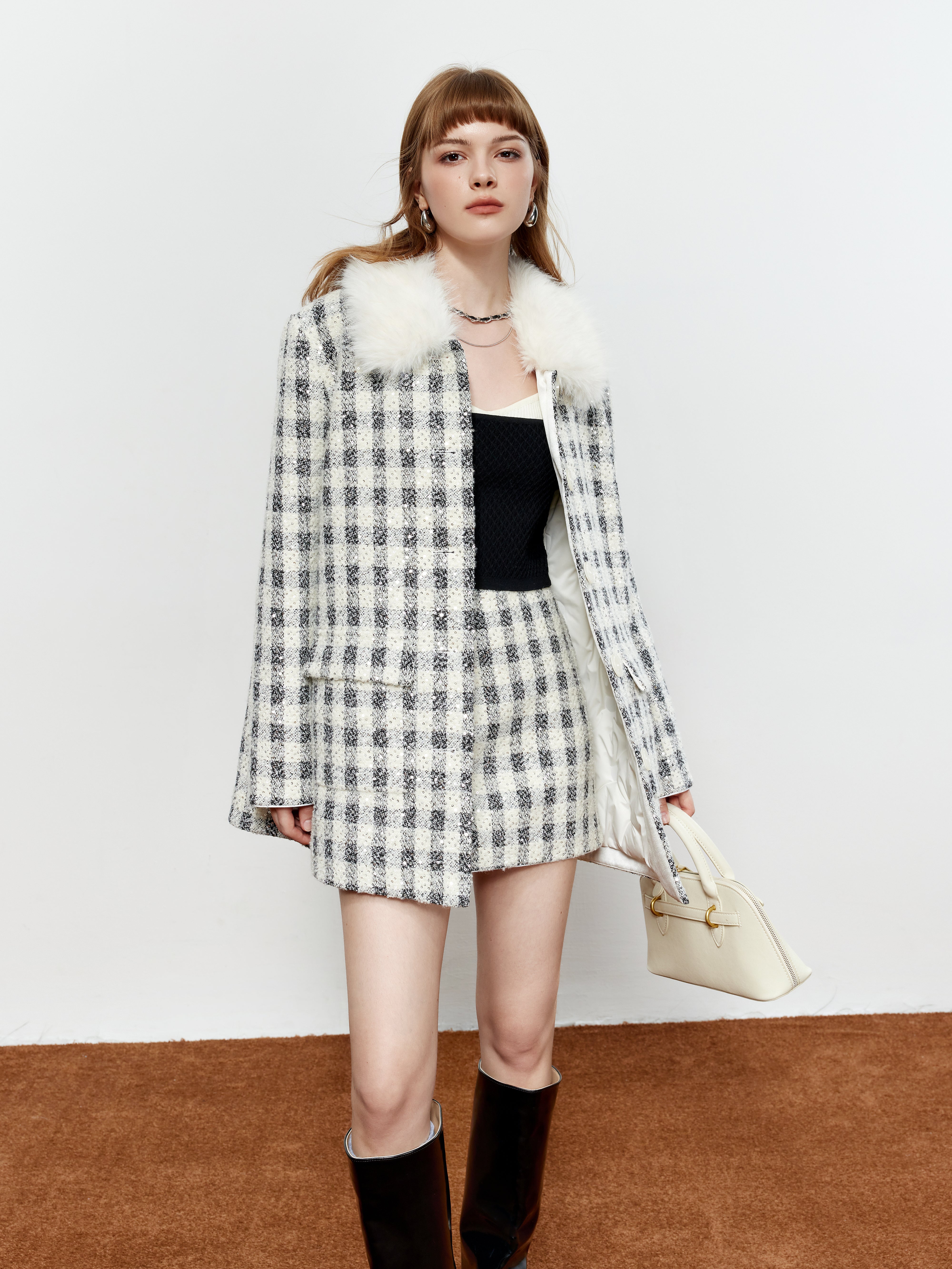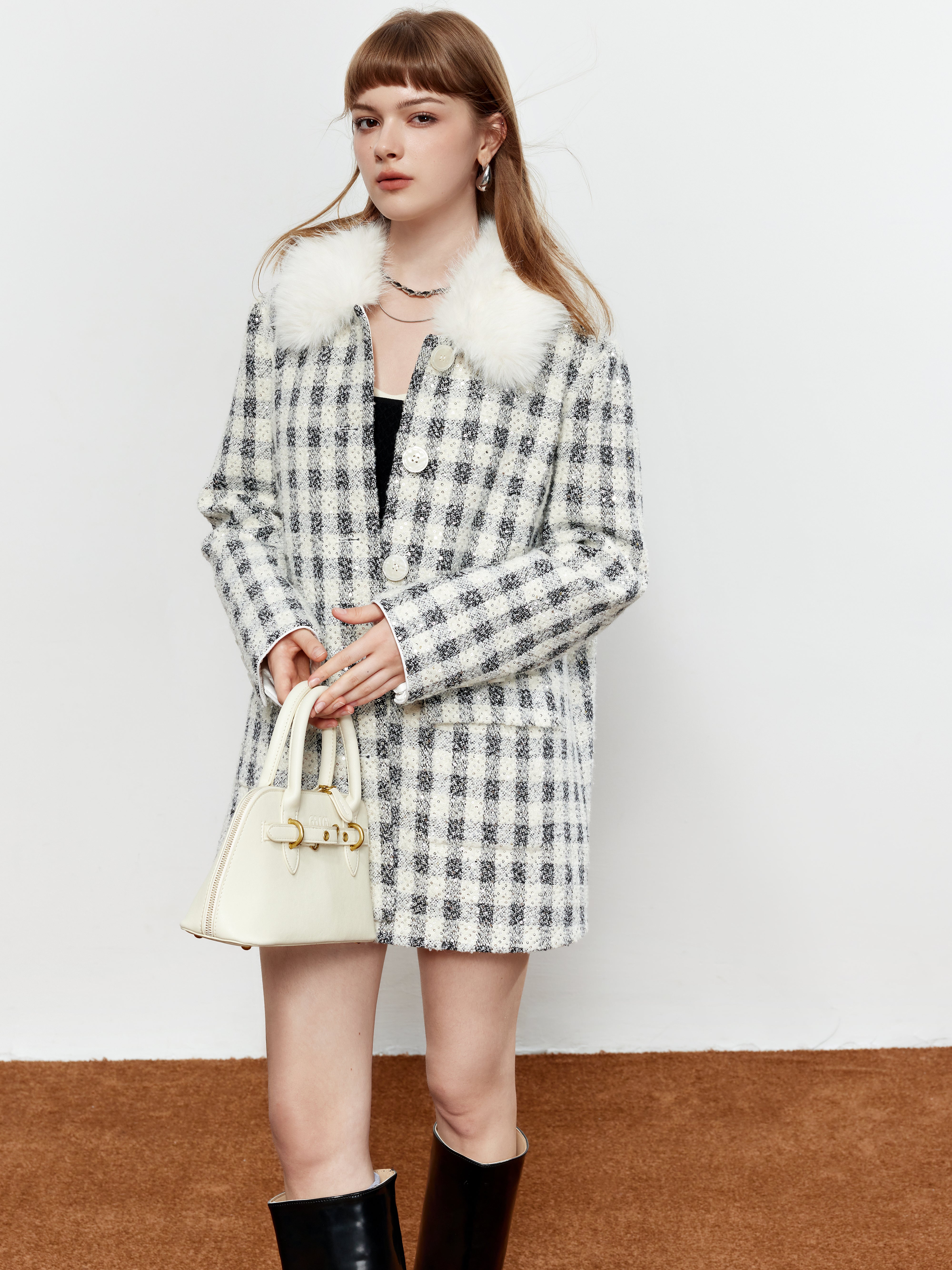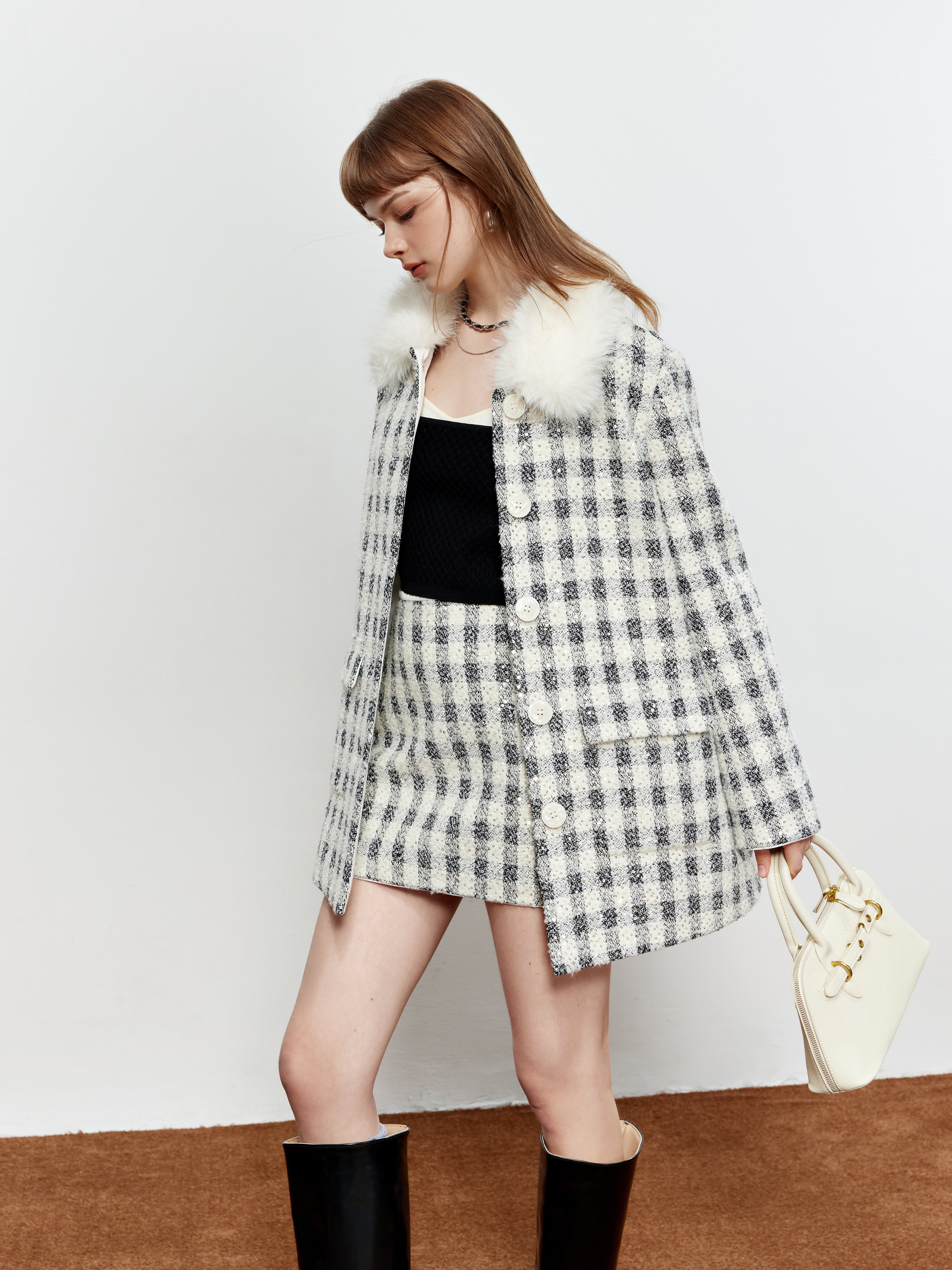 ROCHA ROMA Fur Collar Plaid Jacket+Skirt