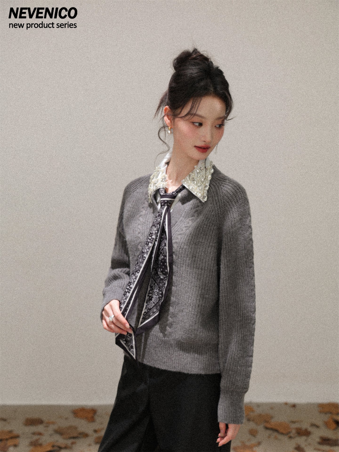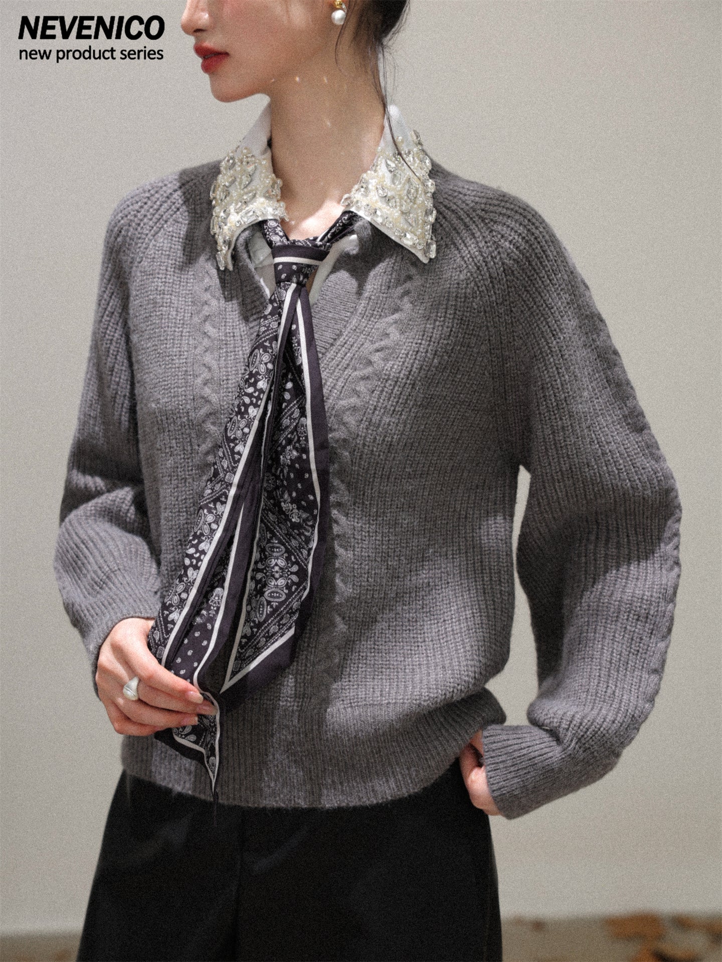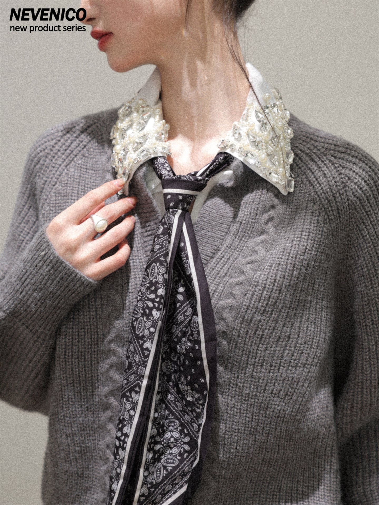 NEVENICO Embellished Faux Two-Piece Knit Top (Scarf Included)