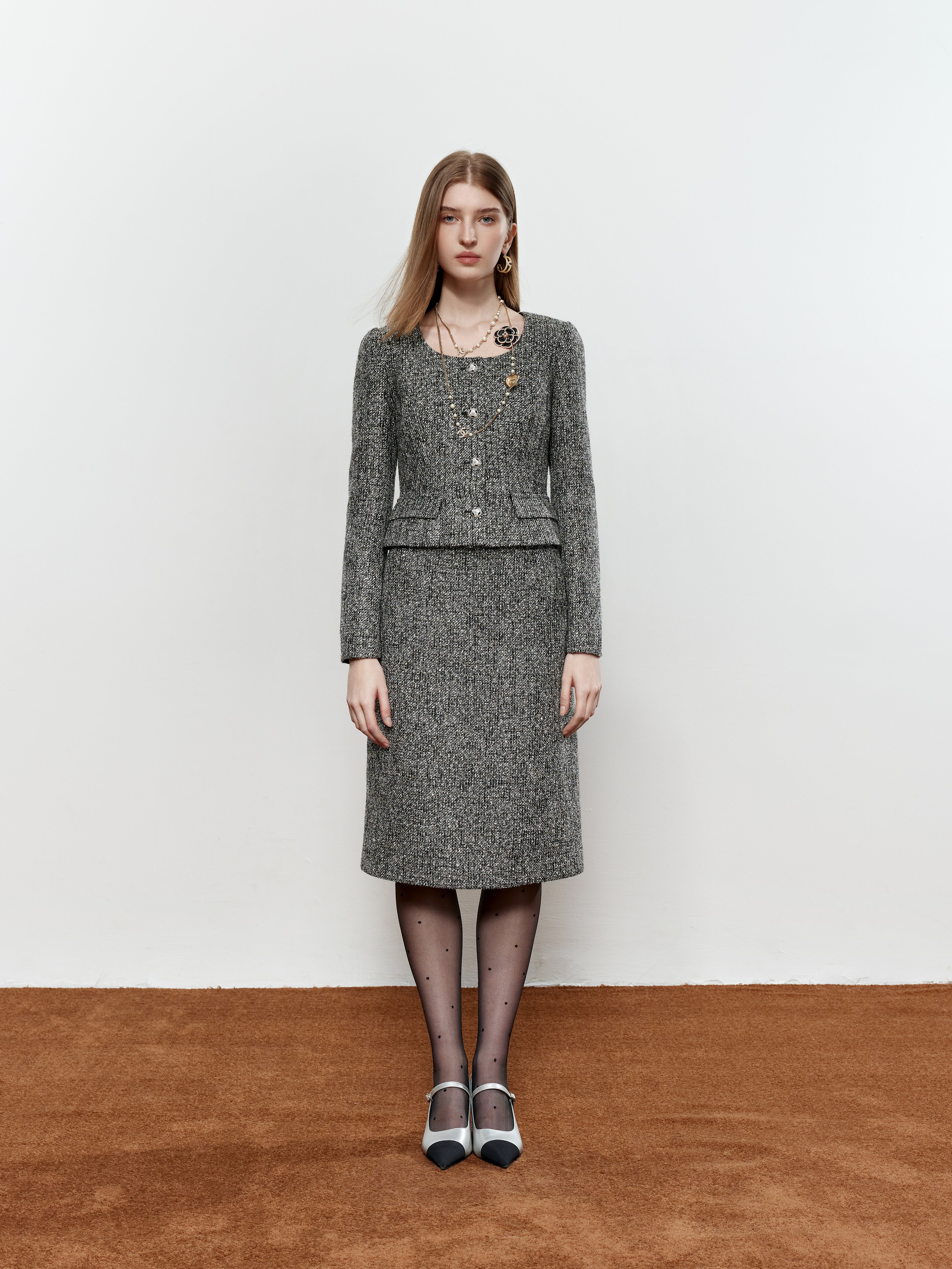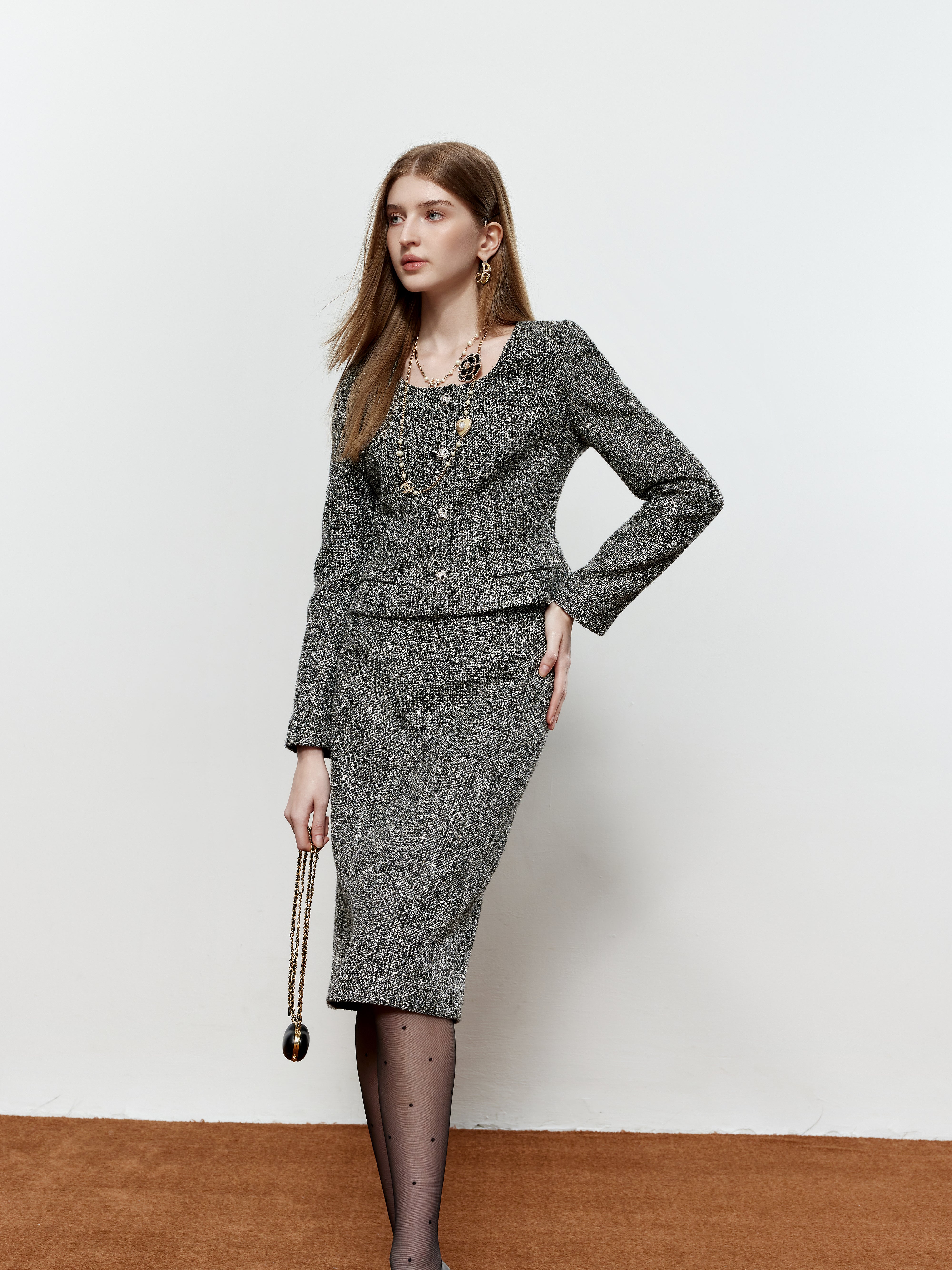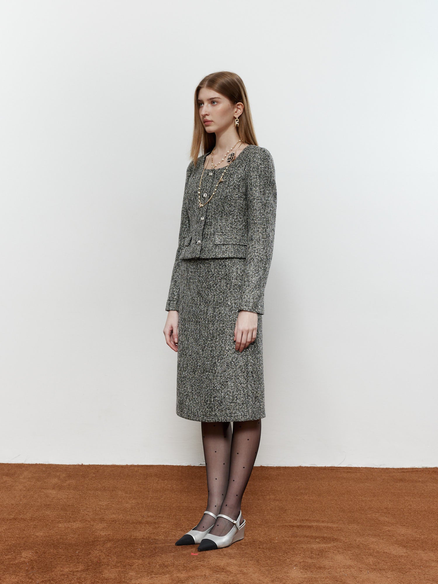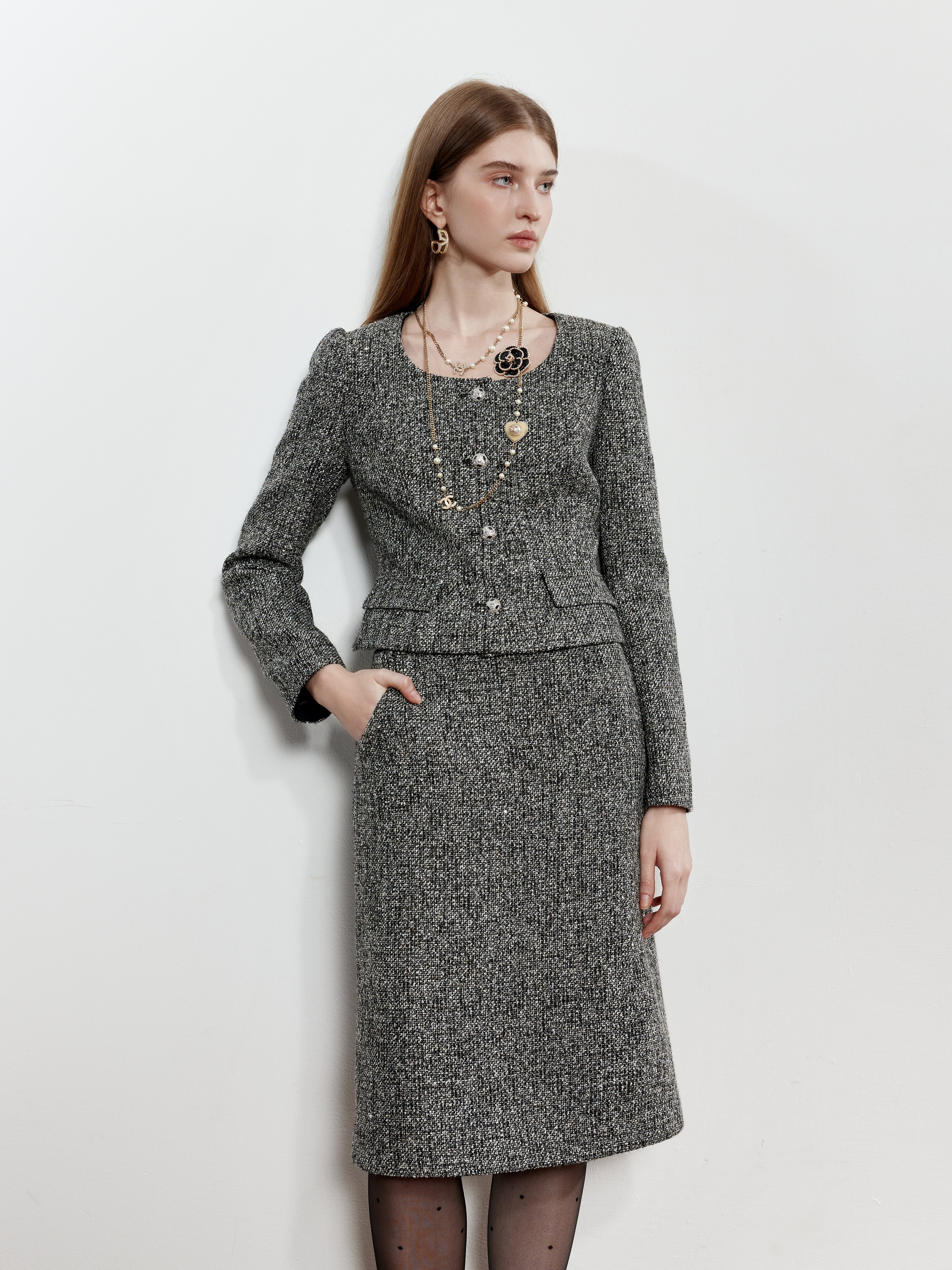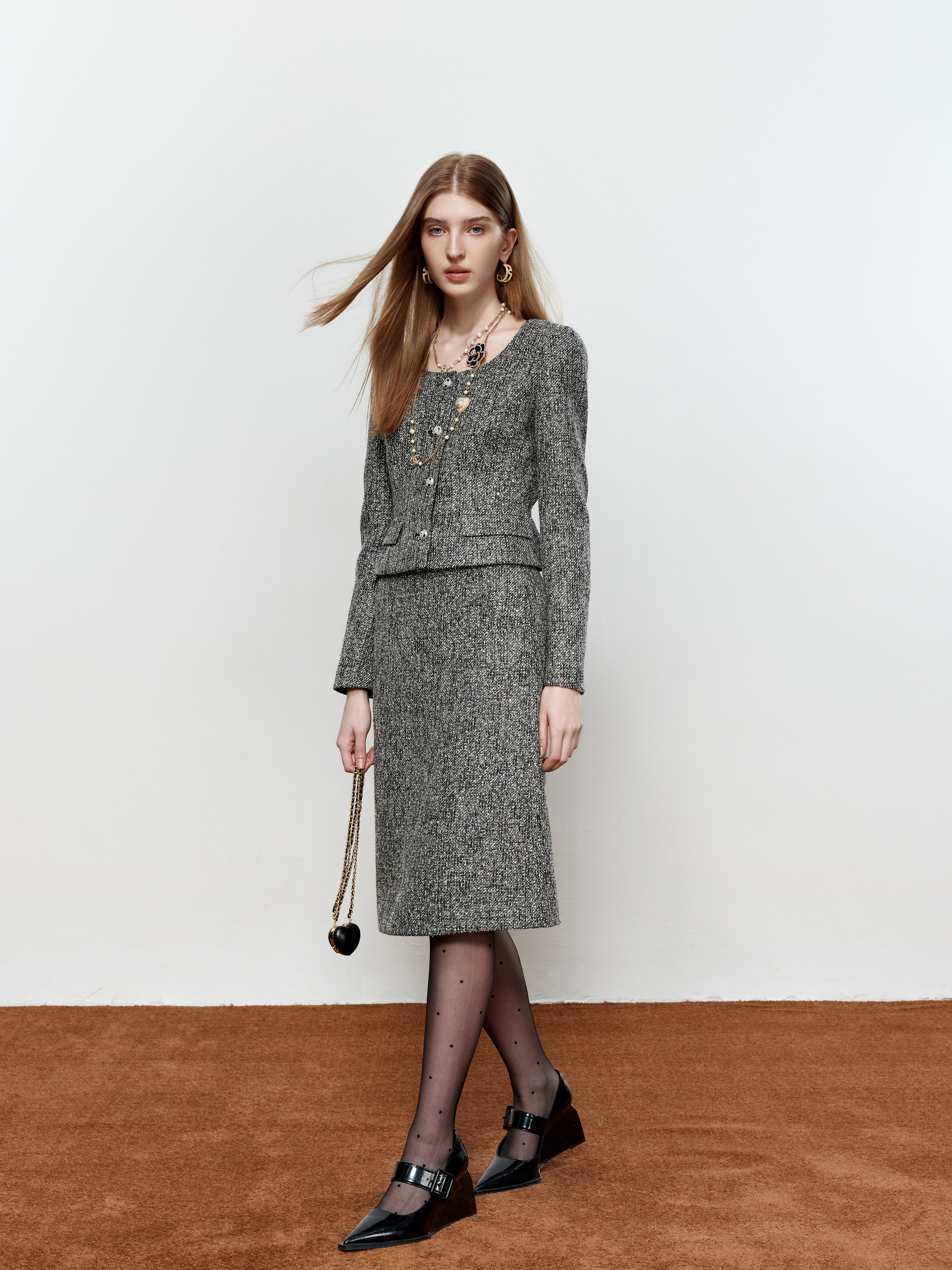 ROCHA ROMA Crew Neck Fitted Tweed Jacket+Maxi Skirt