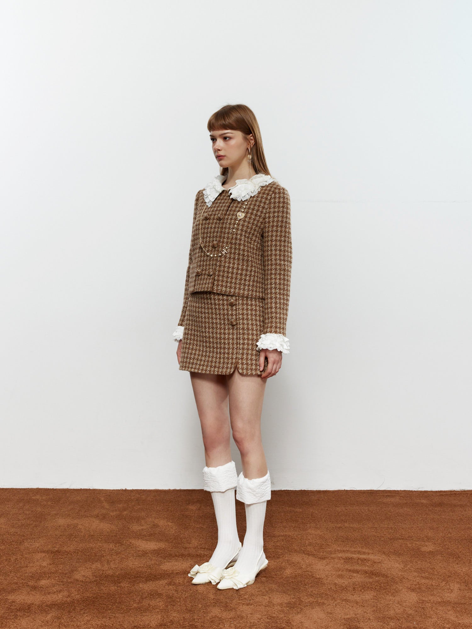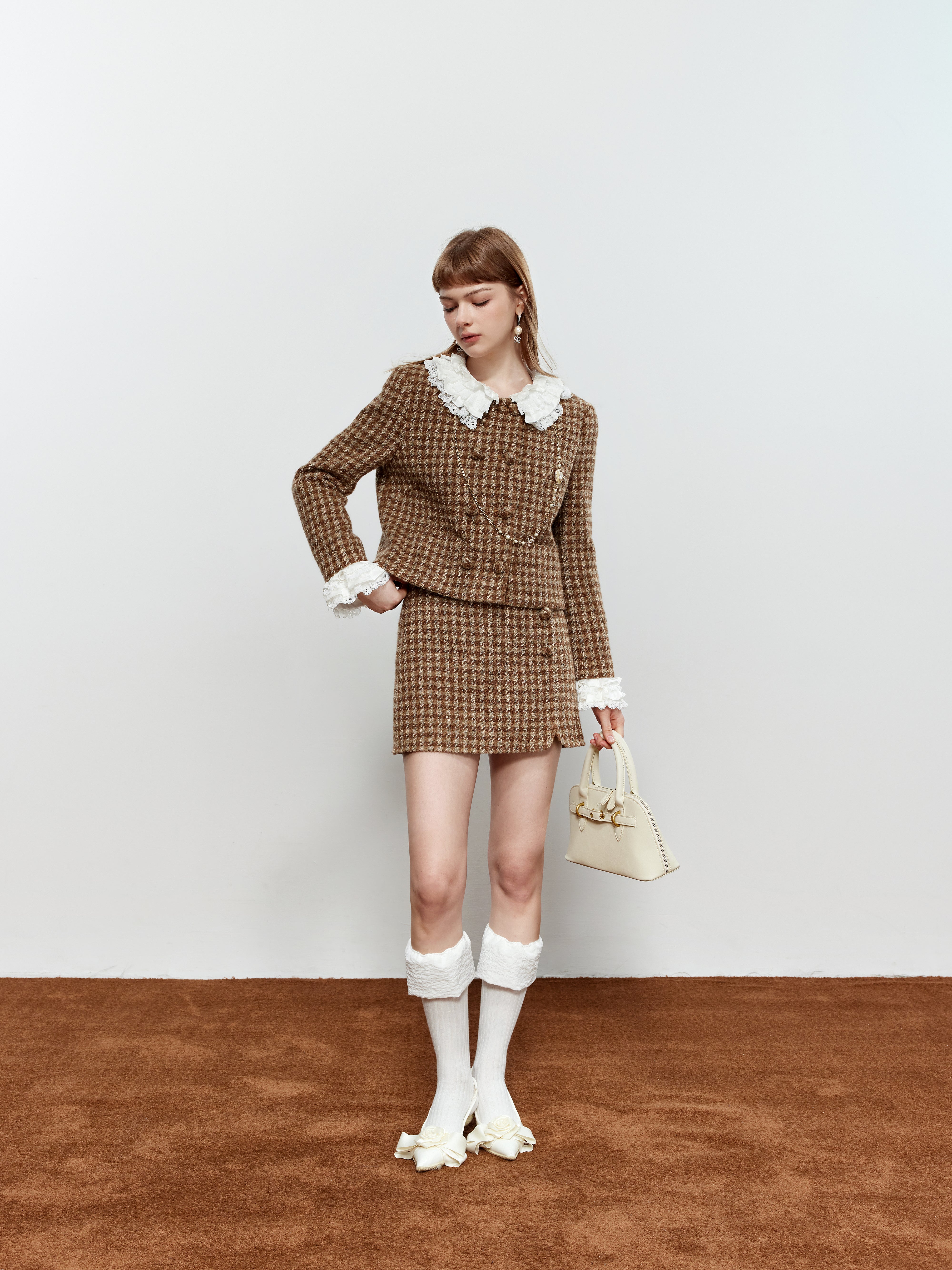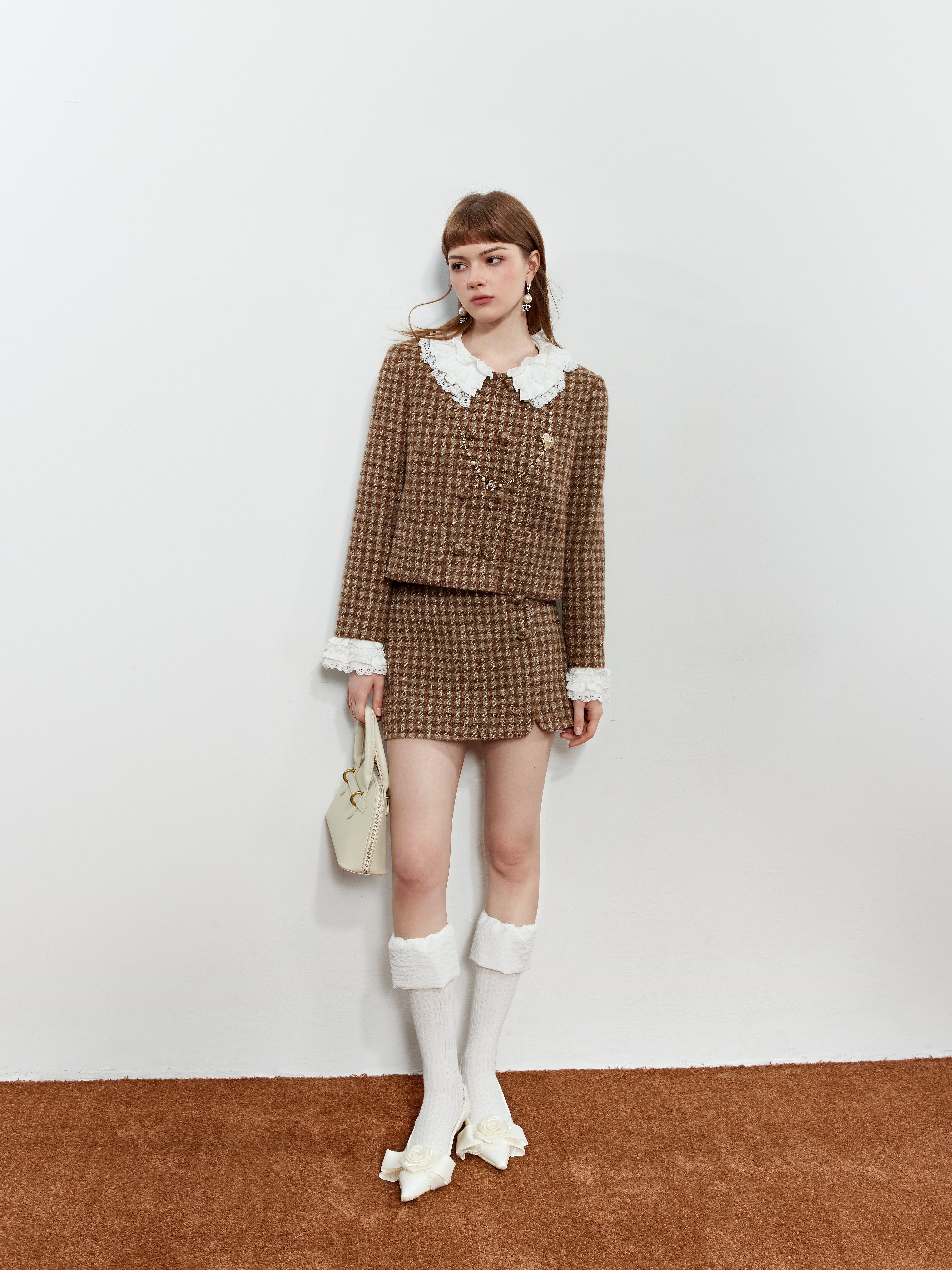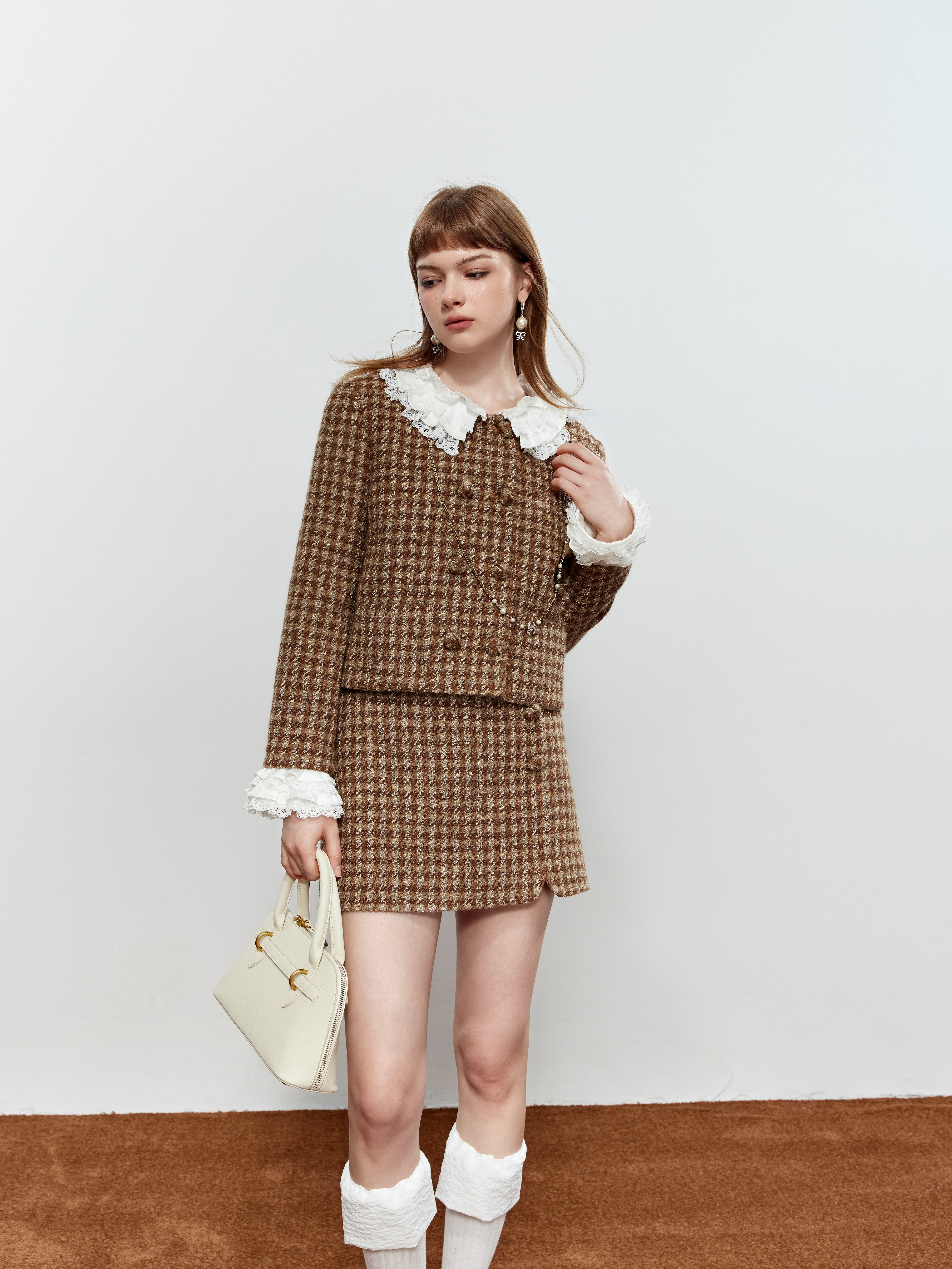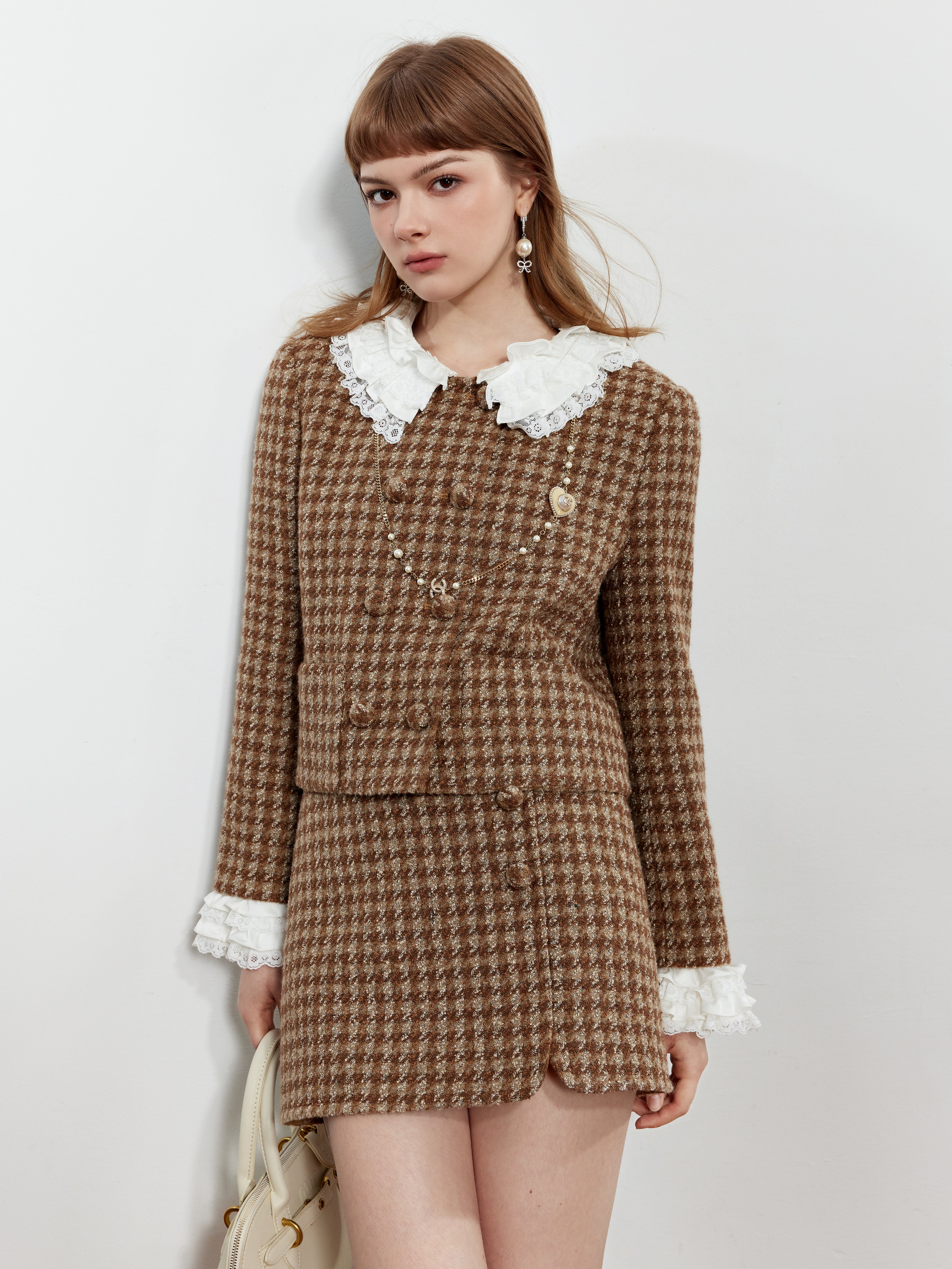ROCHA ROMA Lace Collar Plaid Jacket+Skirt
